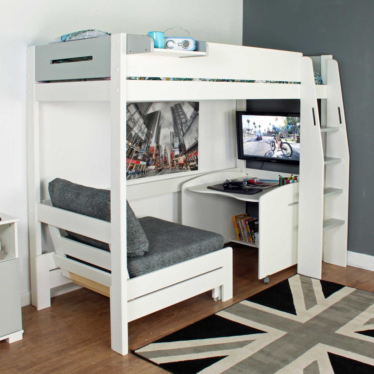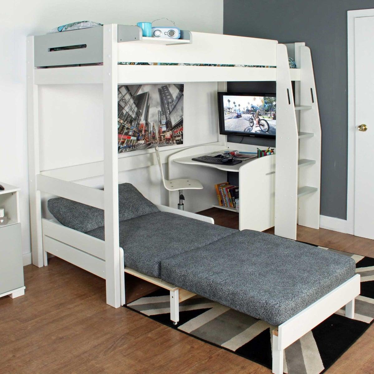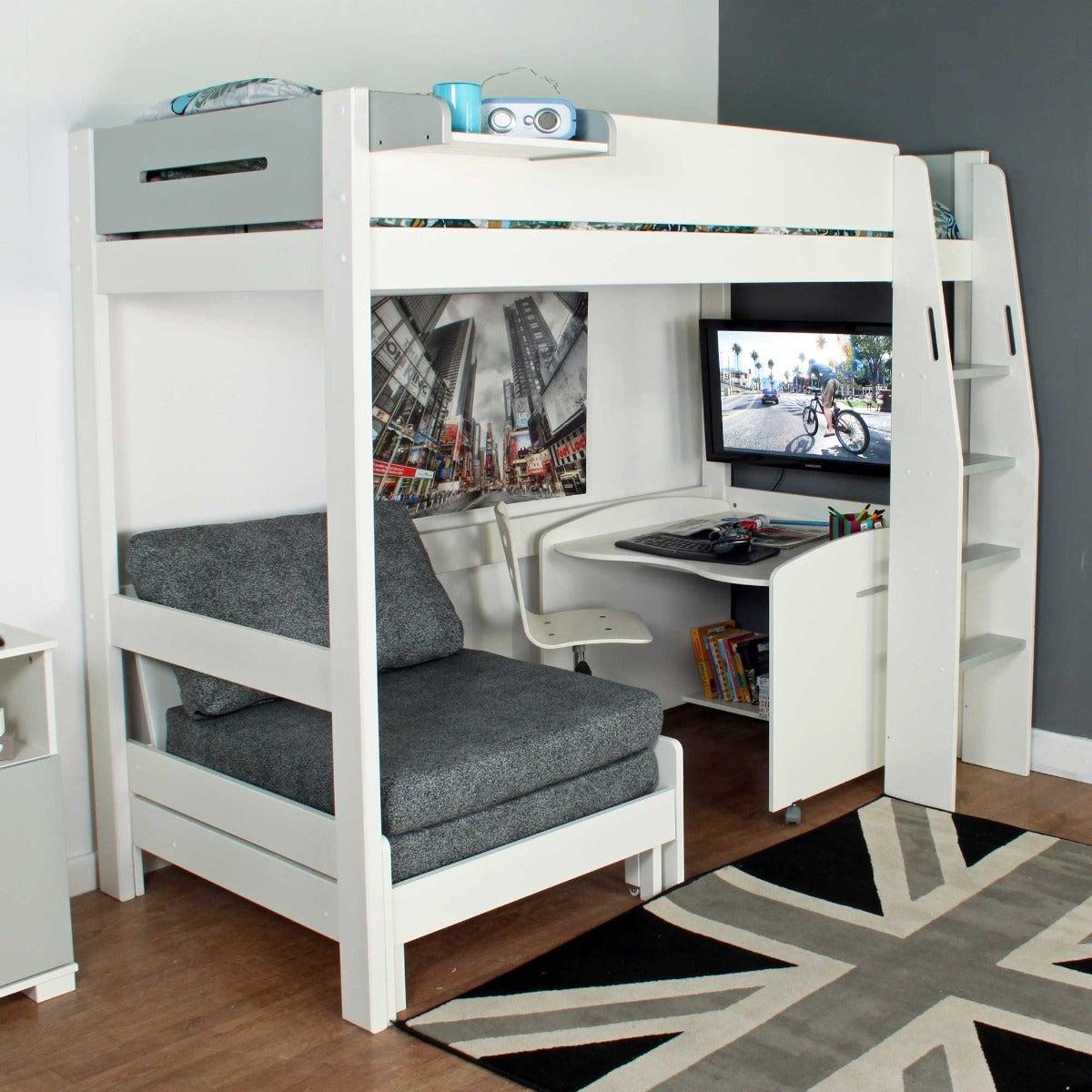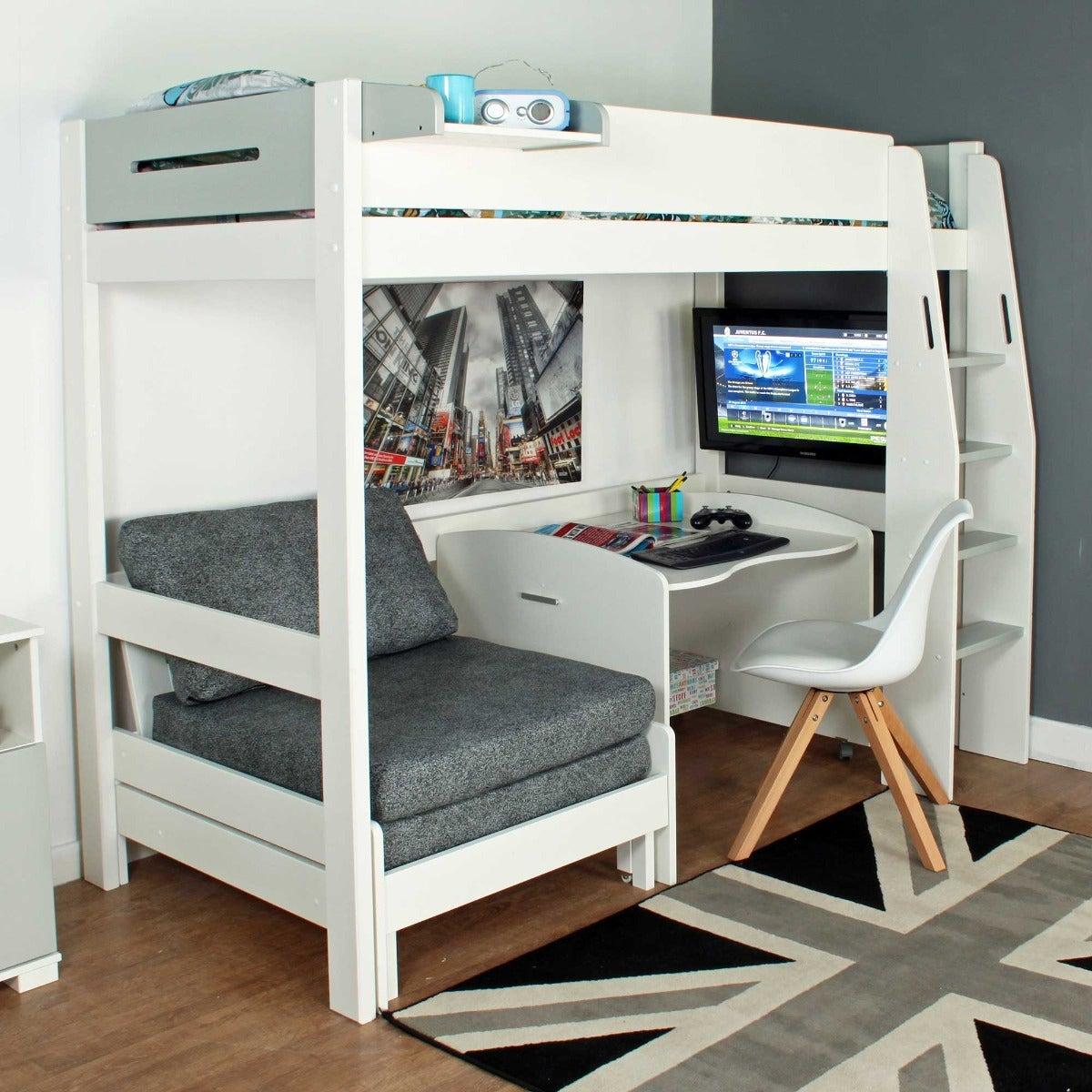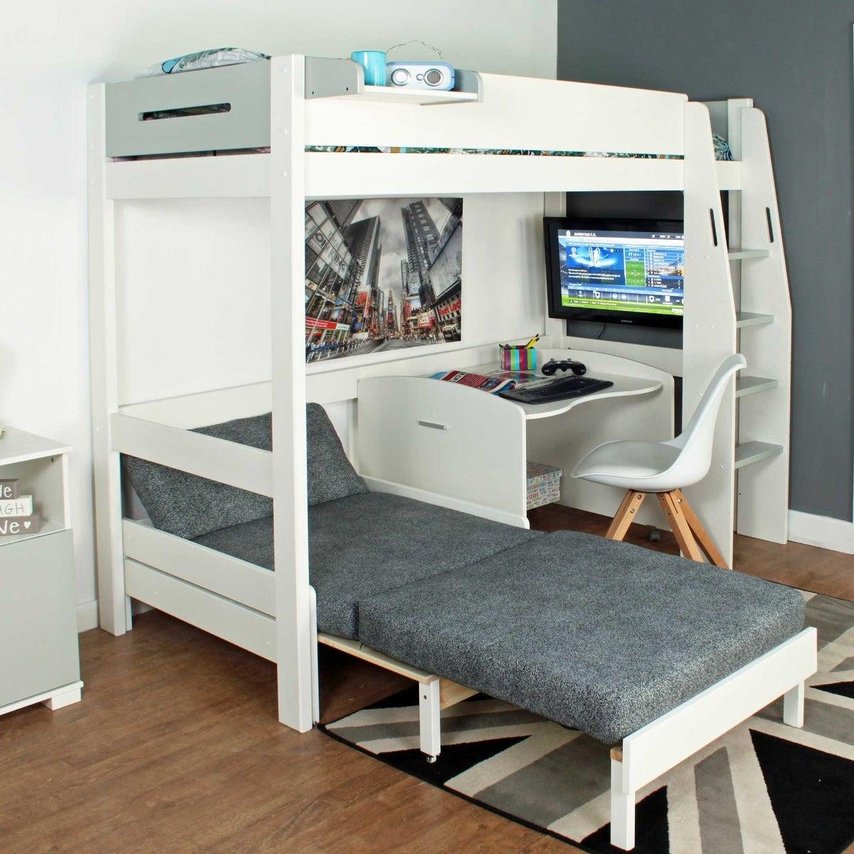 Design. Creating a cosy haven for any child or teenager to enjoy, the Urban Grey high sleeper bed with desk and futon uses space smartly. Perfect for a computer, television or all-important study sessions, the desk underneath can be moved easily on castor feet. Providing both a comfy seat and additional bed, the handy futon comes in a choice of three stylish fabrics. Finished in timeless white, this sturdy wooden bed will make the most of your child’s room for many years to come.