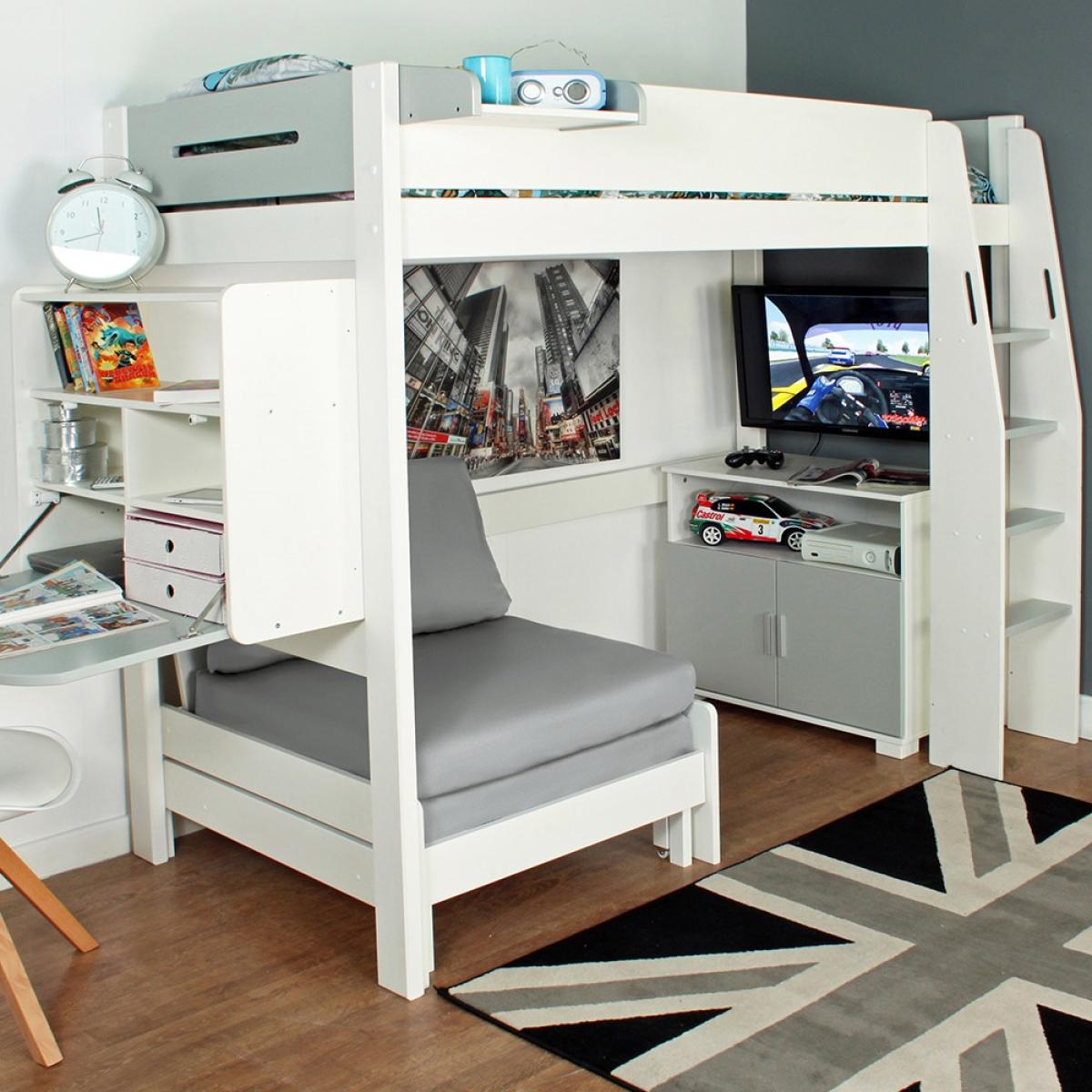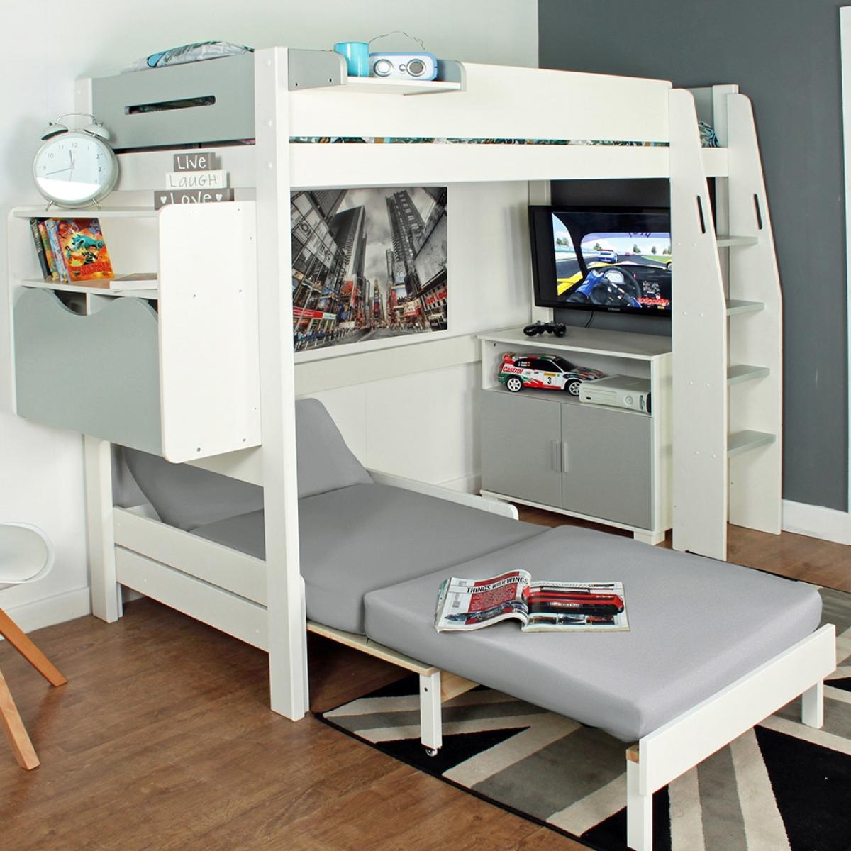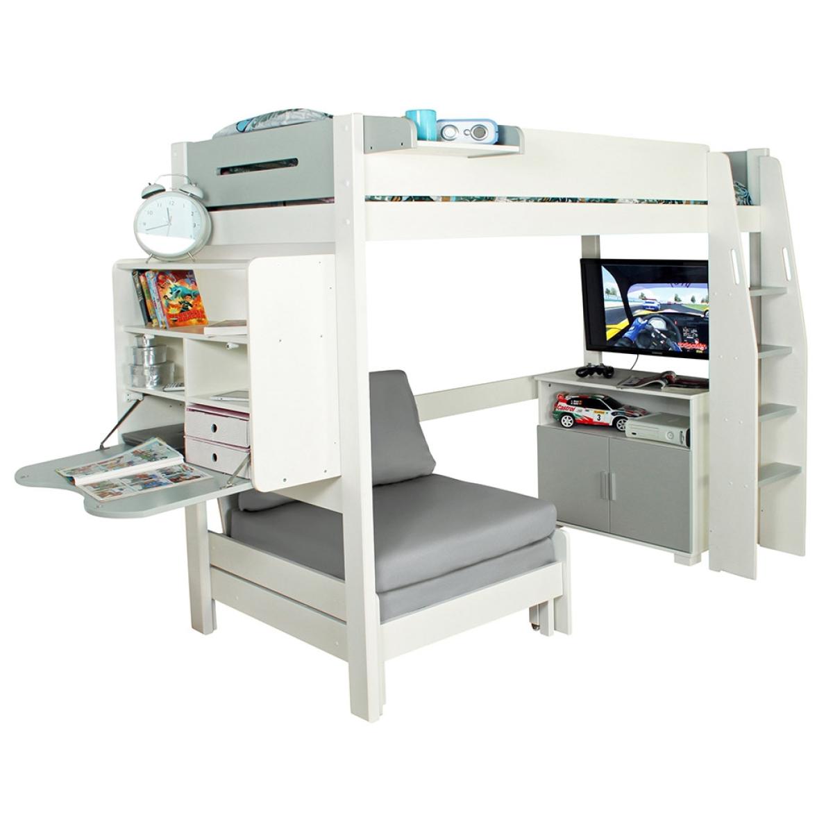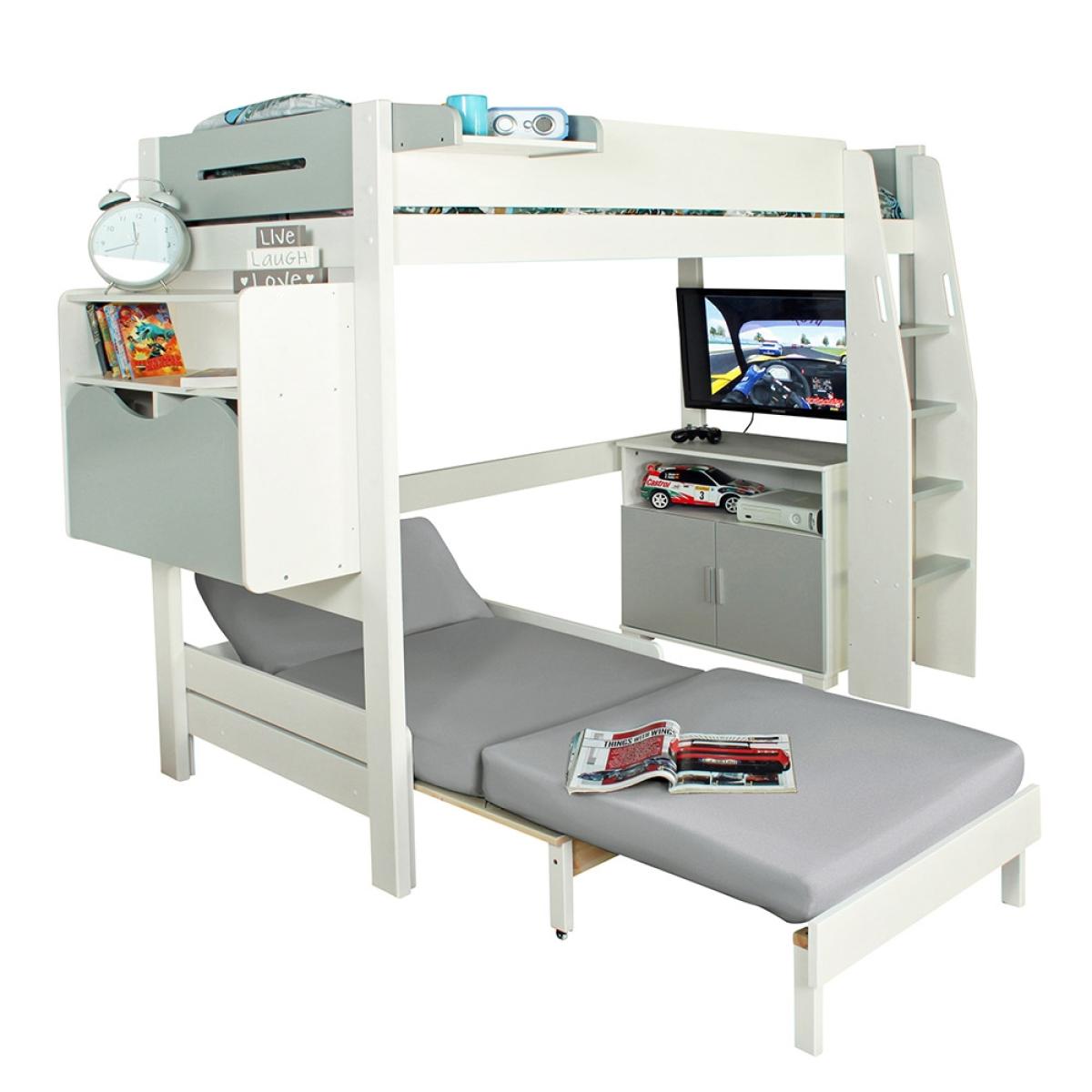 For hours of entertainment, and maybe to count a few sheep, this Urban Grey High Sleeper 2 bed in white and grey is the perfect addition to your youngsters bedroom! With the cool coloured finish your kids can pair a variety of bedding colours and furnishings to create their own grown up hideaway. This bed benefits from a storage unit that can tuck neatly under the loft style bed and if your youngster is feeling studious, the bookcase with a pull down desk is ideal for some serious studying. With the separate storage shelf compartments they can keep all of their desk buddies, books and knick knacks safely hidden away. With all of that storage your kids will have no excuse the next time, 'Tidy your room' is called! If it wasn't already good enough each component can be moved and arranged into any configuration your kids conjure up!When they've finished working hard the Urban Grey High Sleeper 2 also includes a fold out chair bed so friends can stay over for the real fun to begin! Whether they are studying, socialising or finally need to get some rest the Urban Grey High Sleeper 2 is the bed for you! This brilliant bed has some optional extras to choose from, a clip-on shelf for bedtime beverages and don't forget your bendy bunk light!.