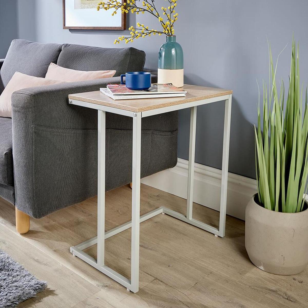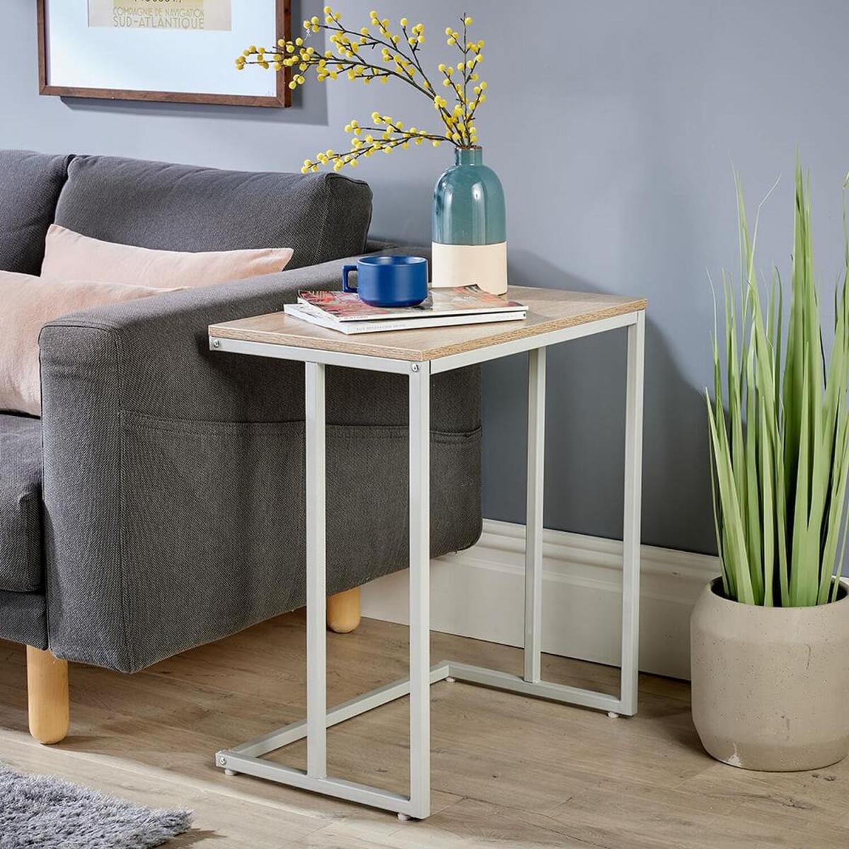 Useful and stylish, this sofa side table is the perfect addition to your living room space. It enables you to easily reach for your drink as the table neatly sits in close proximity to the seat. The light oak and rustic top and industrial metal frame create a modern look that will complement many homes. A practical choice.