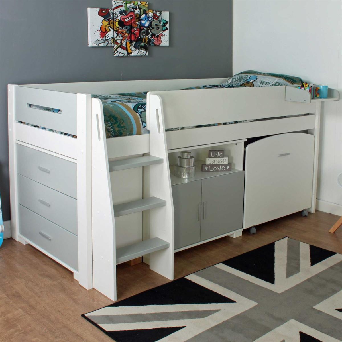 Incorporating a range of functionalities in a stylish and neat way, the Urban Grey mid sleeper bed with pull out desk, chest and cupboard will make tidying up childs play. Set at a parent-friendly height but with room underneath for plenty of storage, the bed maximises floorspace with its smart design. The solid wooden bed frame is finished in timeless white and grey, ideal for any colour scheme. Perfect for homework and creative activities, the desk rolls out from underneath the bed when required. A chest of drawers ensures theres a place for every item of clothing, whilst the compact cupboard offers a suitable spot for toys.