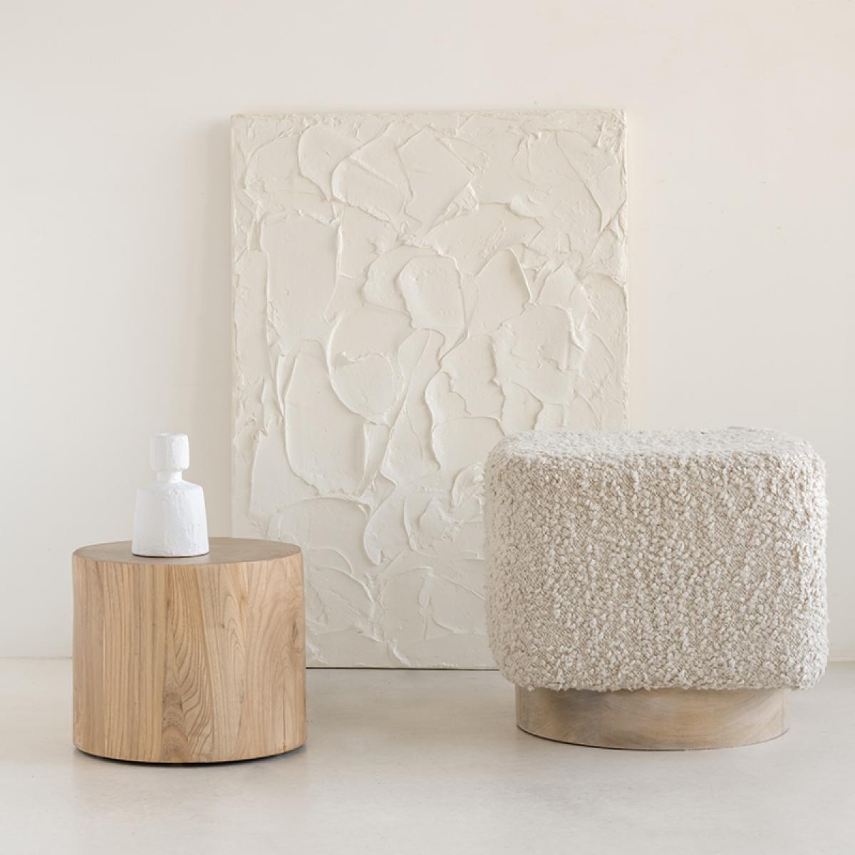 I love this pouffe for its versatile, minimalist appeal and cozy texture. Its off-white hue and natural materials make it a great addition to both Scandi-inspired interiors and more eclectic spaces, adding warmth without overpowering the decor. It works well as extra seating, a footrest, or even a styled side table with a tray on top. For styling tips, place it beside a neutral sofa or armchair for a relaxed vibe or group a few with different heights and textures for a layered, inviting look. Its compact size and neutral tone also mean it can easily be moved around and integrated into various room settings, making it both functional and a subtle design statement.