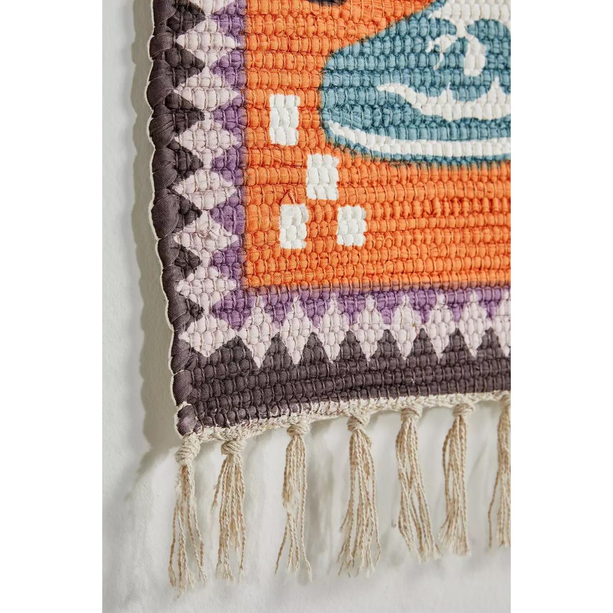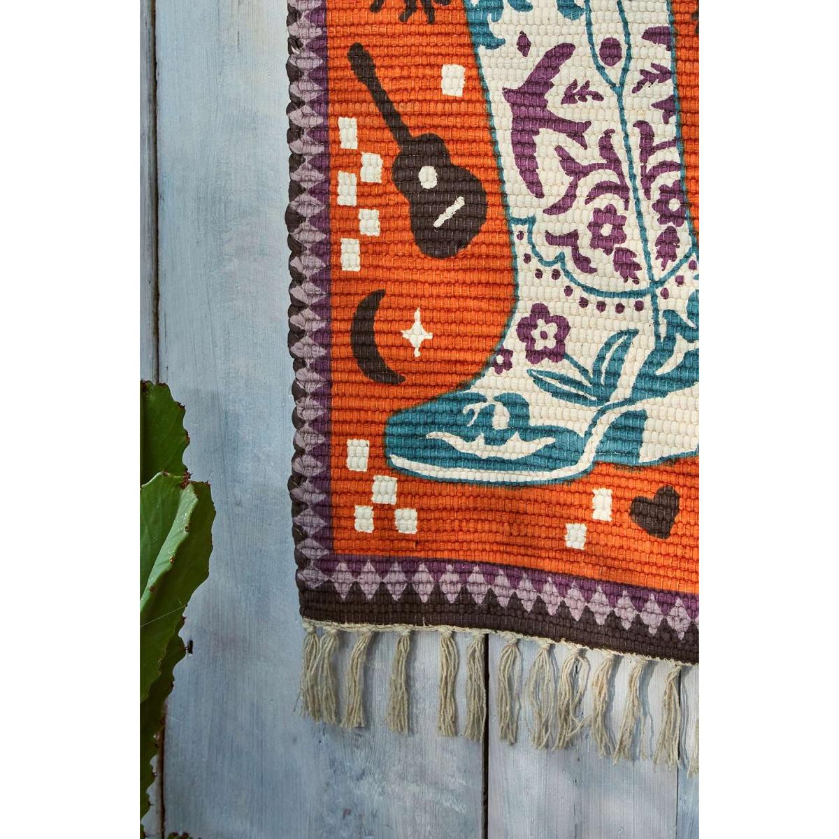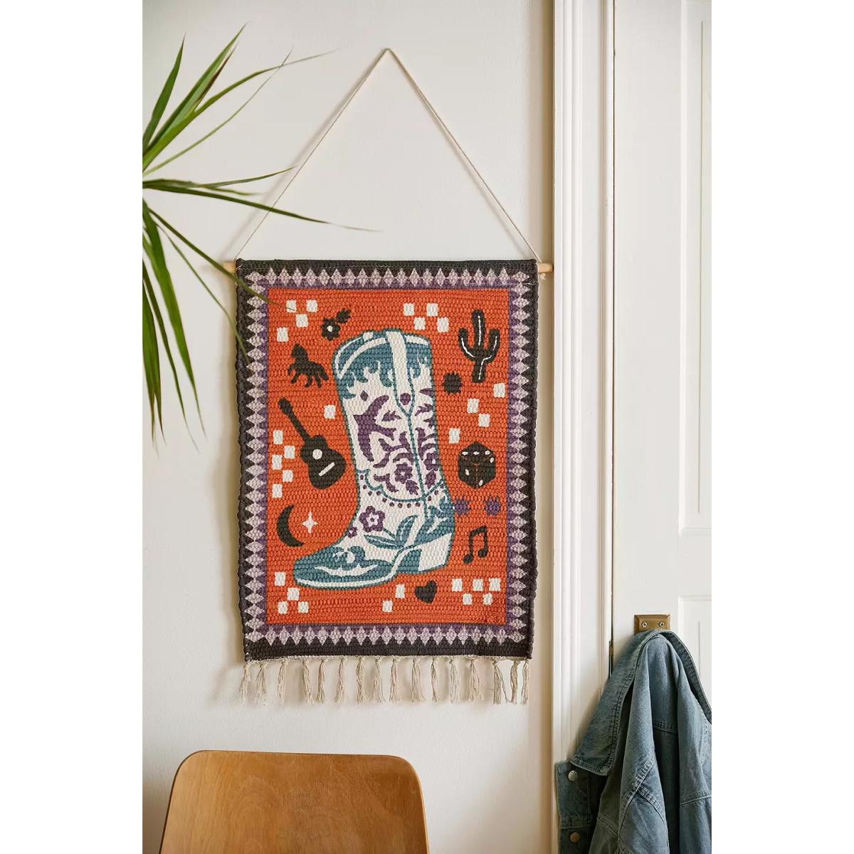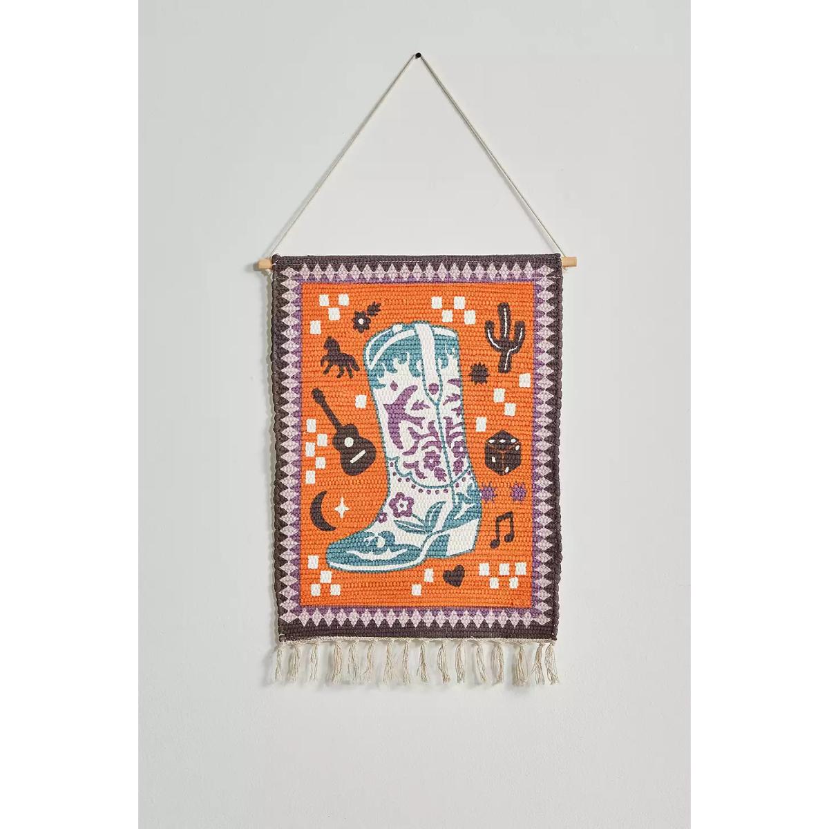 Woven cotton wall hanging with novelty motifs printed to centre. Super-fun wall piece looped onto a wooden dowel with a thread for easy hanging, complete with tassel trim and a diamond border. Finished with a Cowboy boot design to the centre. **Content + Care** \- Cotton \- Spot clean **Size** \- W: 46cm x L: 62cm \- Total hanging length: 96cm