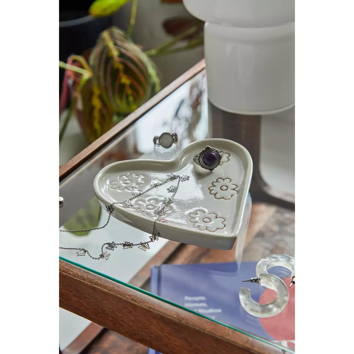 Engraved flower details top this super-cute trinket tray in a ceramic constriction. Heart shaped tray with raised edges for catching all of your smallest treasures. **Content + Care** \- Ceramic \- Spot clean