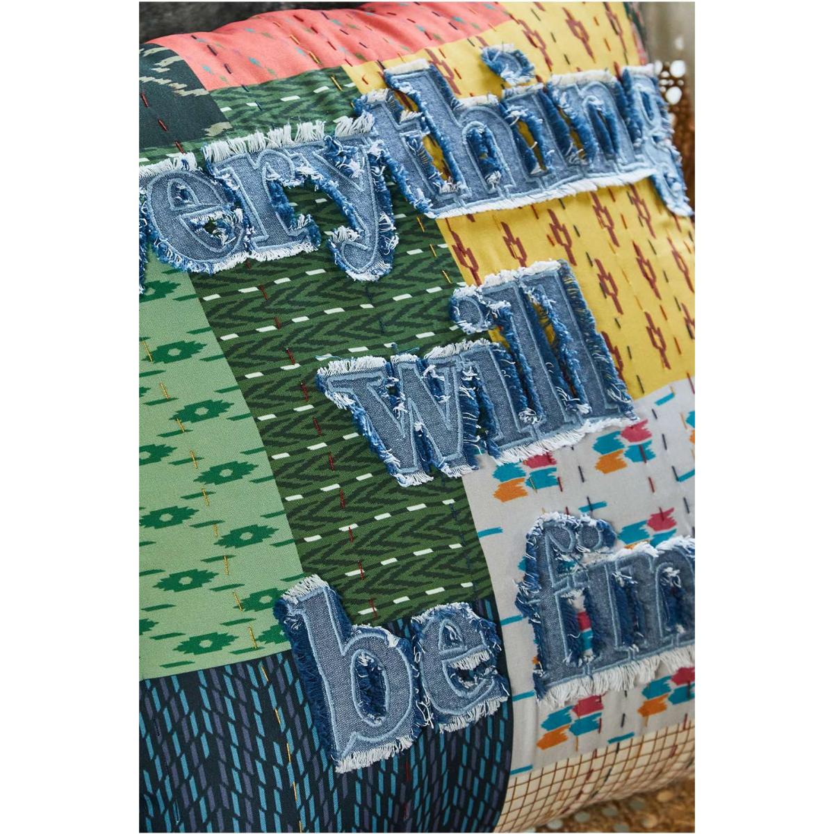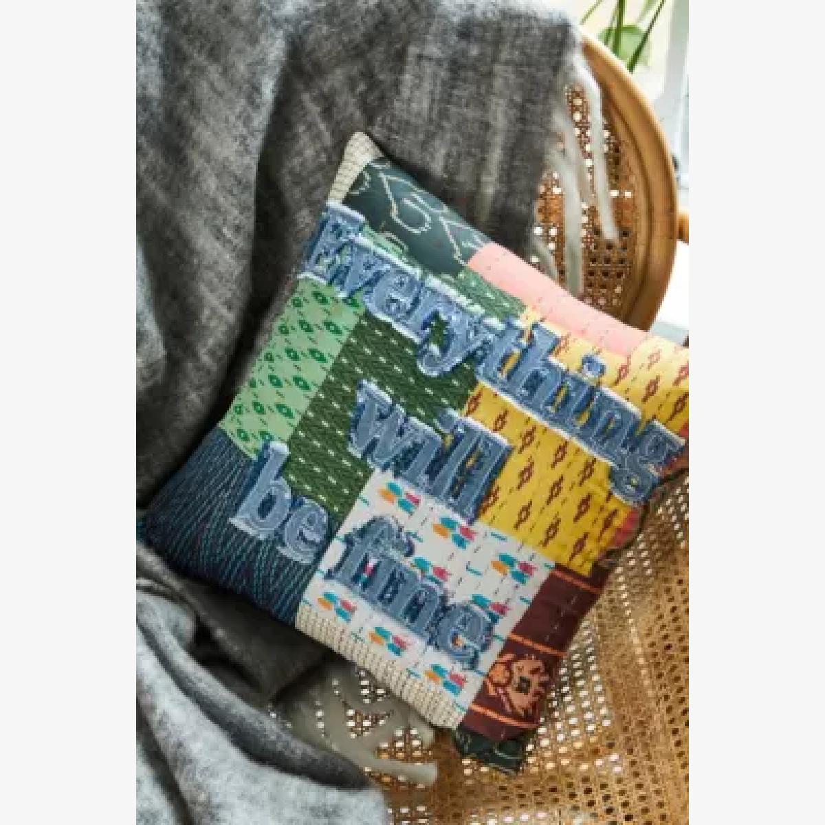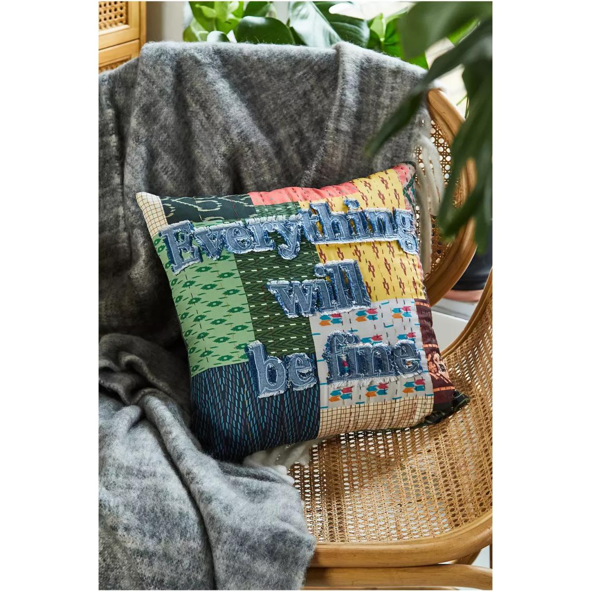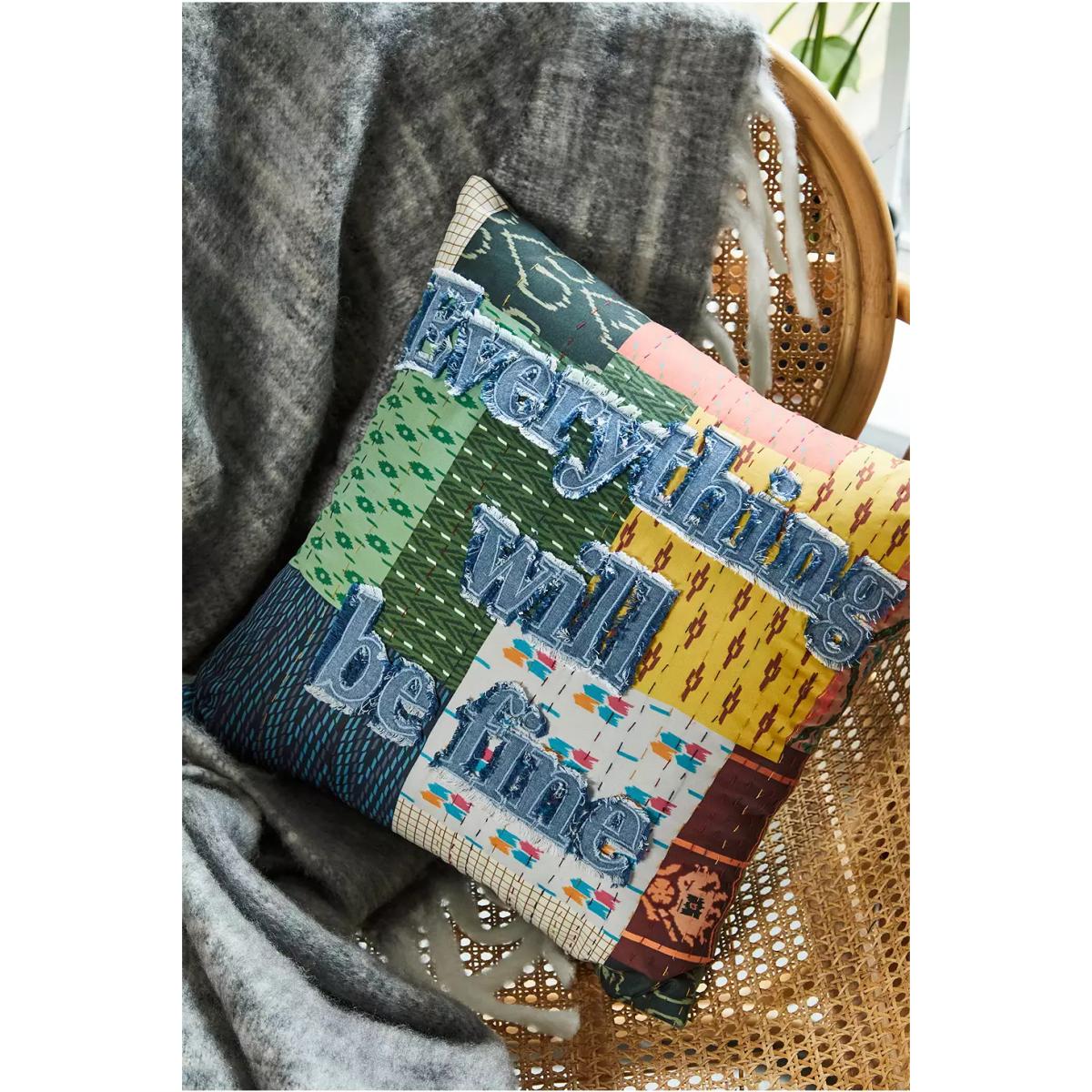 DIY-look cushion with an 'Everything will be fine' patchwork motif stitched to front. Features mixed fabric panels stitched into a square silhouette, padded to create a cosy addition for your sofa or bed. **Content + Care** \- Main: 90% Cotton, 10% Polyester \- Fill: 100% Polyester \- Spot clean