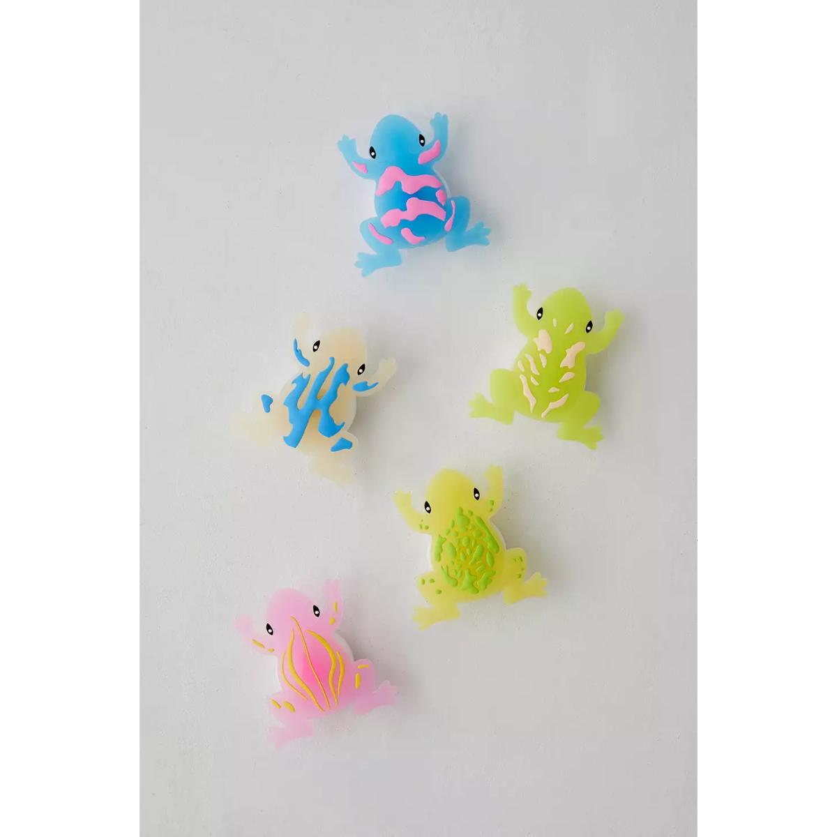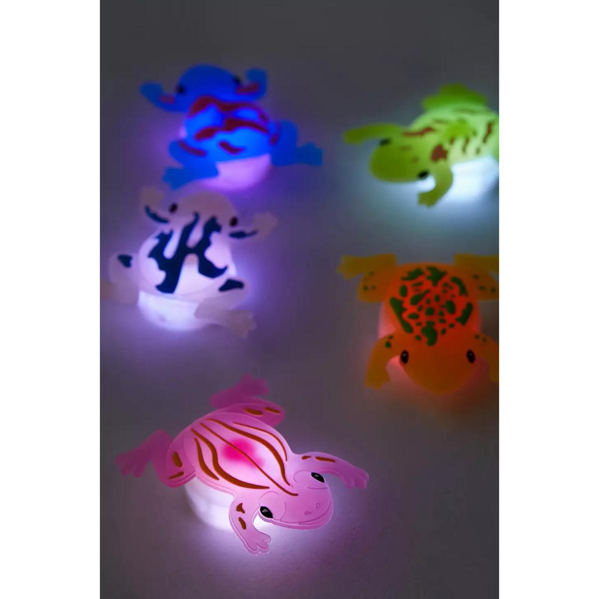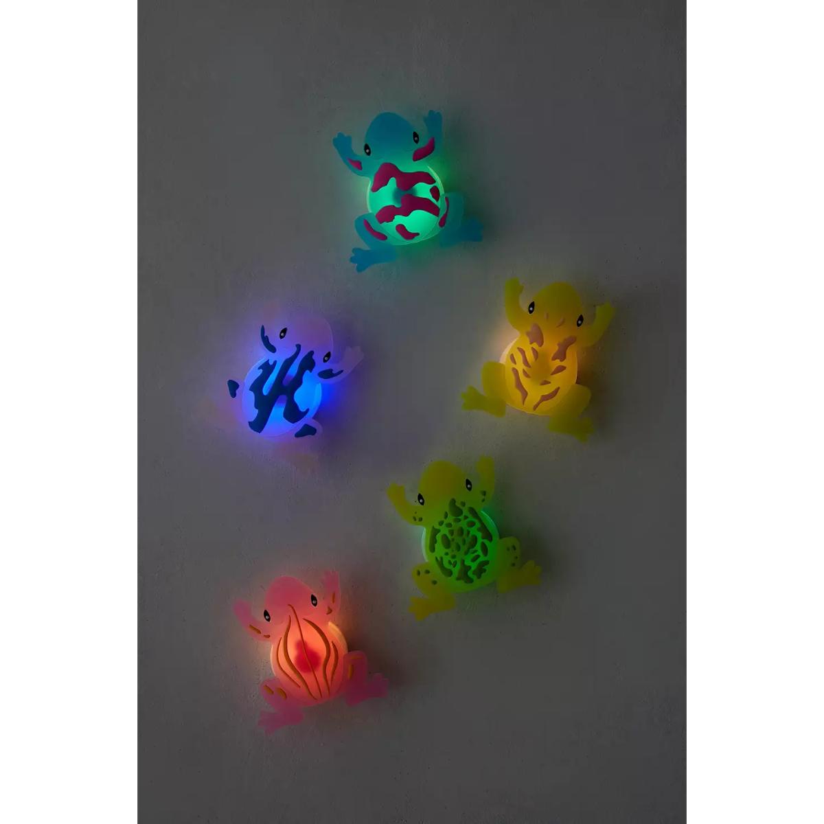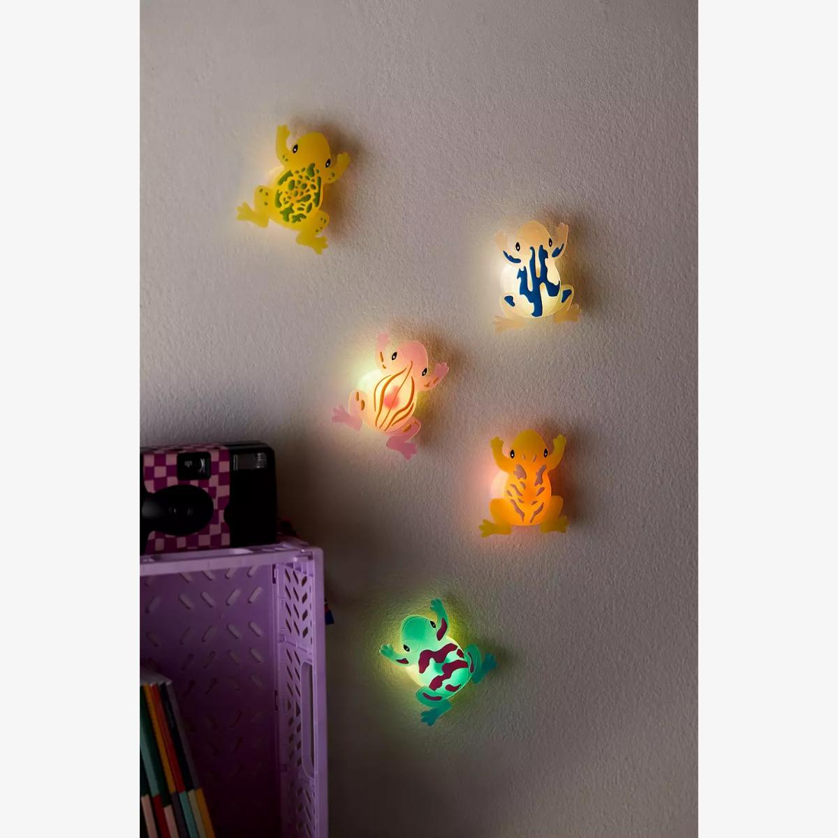 Create a neon disco space with this pack of five froggy lights. The LED lights are backed with sticky adhesive for creating a hopping great display on your wall or ceiling. **Content + Care** \- Includes 5 frog lights \- 50% ABS plastic, 40% polystyrene, 10% LR1130 button battery \- Batteries included \- Wipe clean **Size** \- Each frog: L: 5.6cm x W: 2cm x H: 6.6cm