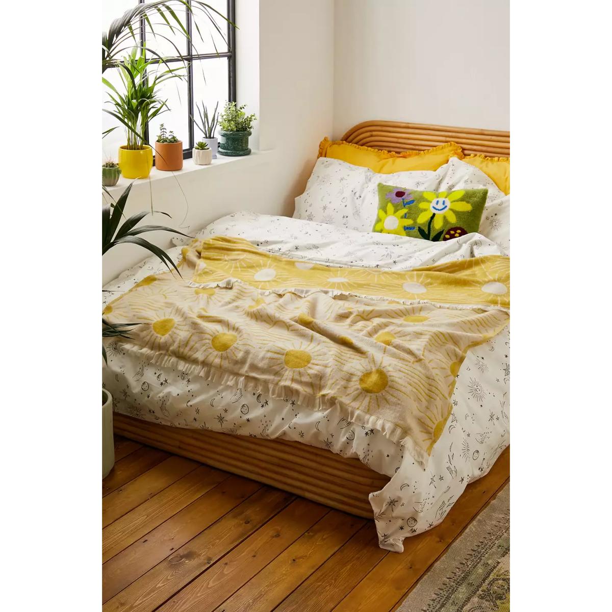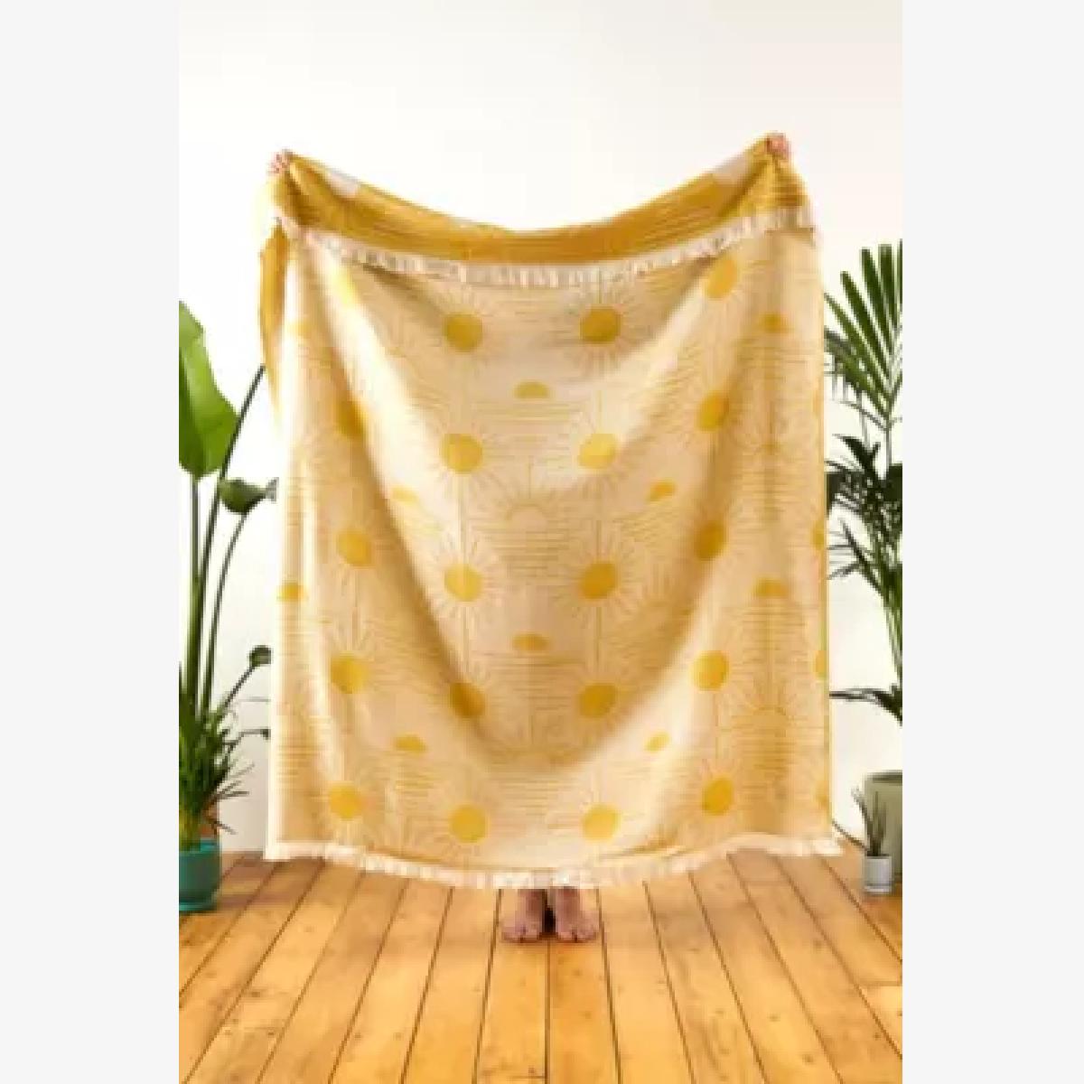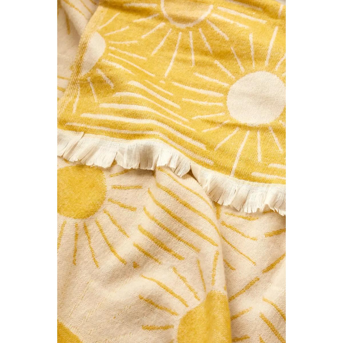 Add a little sunshine into your home with this throw blanket. Crafted from a vibrant woven cotton construction with a sun pattern all over and ruffles to two sides. **Content + Care** \- 52% Acrylic, 48% Polyester \- Machine wash **Size** \- L: 173cm x W: 127cm