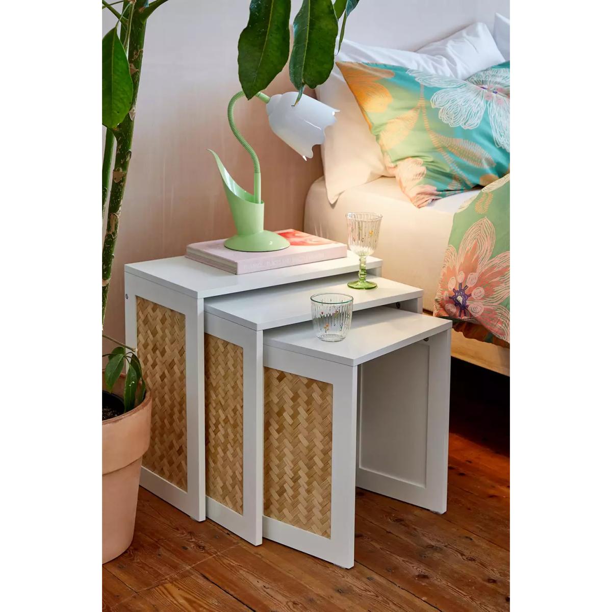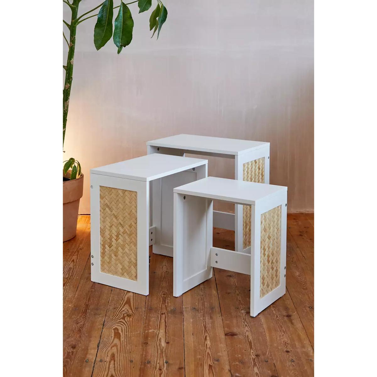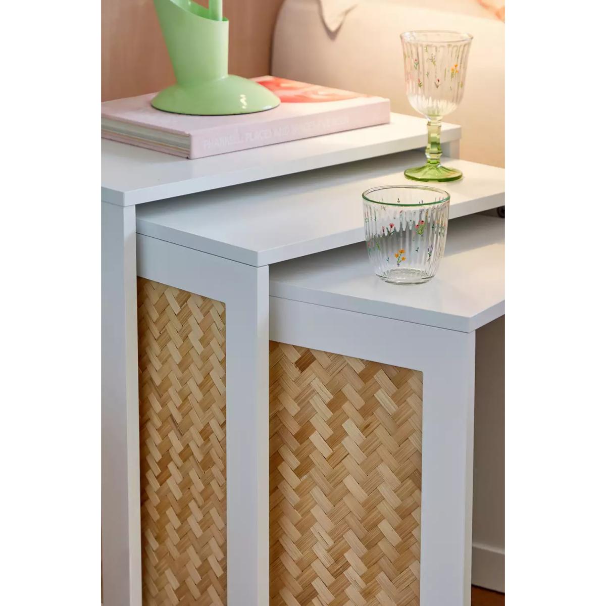 Elevate your space with a set of three nesting tables, part of the UO exclusive Joan collection. Includes three stackable side tables with rattan side panels in woven bamboo. Minimal silhouette style with MDF sides and clearance underneath. **Content + Care** \- Includes 3 tables \- MDF, Bamboo \- Wipe clean **Size** \- Table 1: W:50cm x D: 30cm x H: 50cm \- Table 2: W: 45cm D: 28.5cm x H: 46.5cm \- Table 3: W: 35cm x D: 27cm x H: 42.5cm
