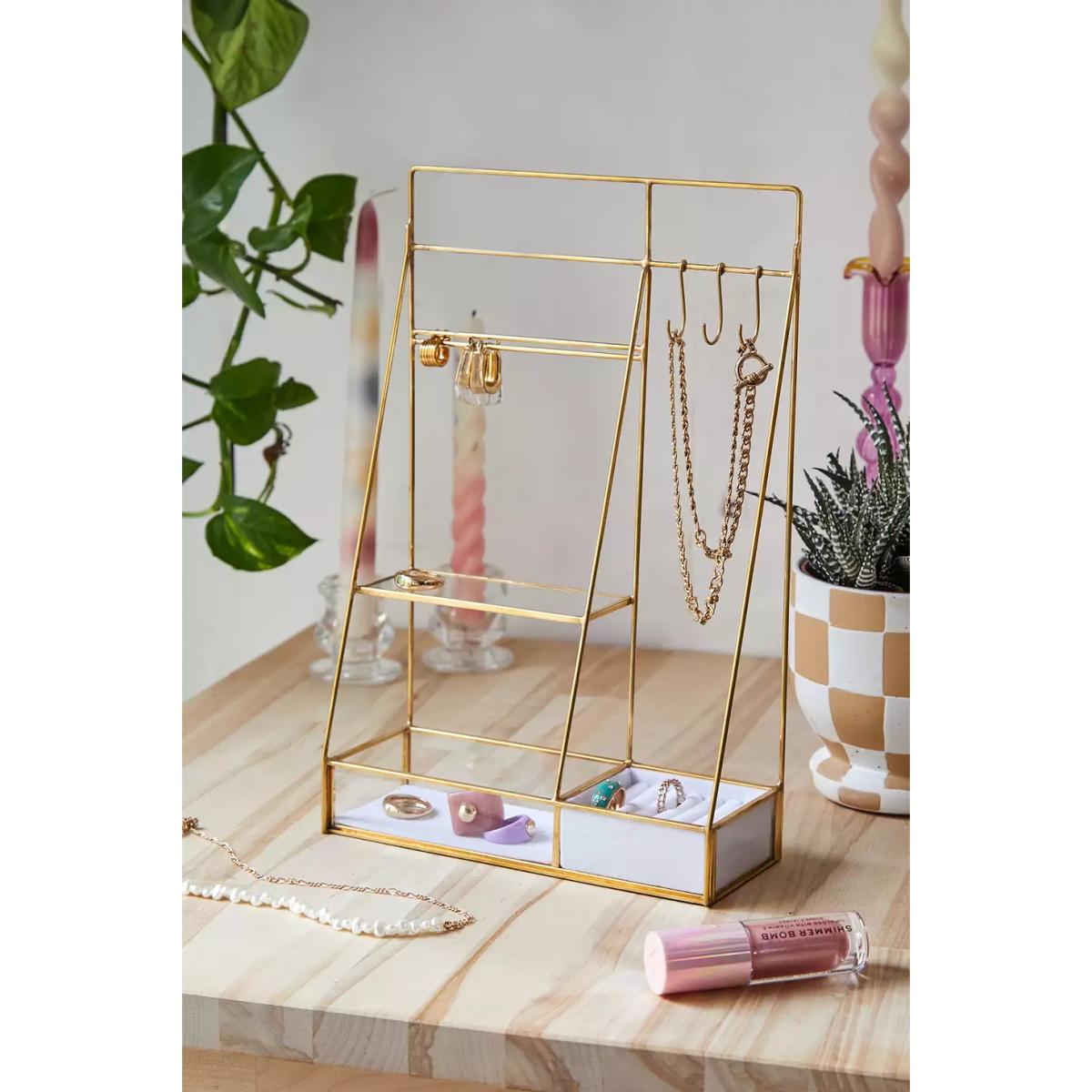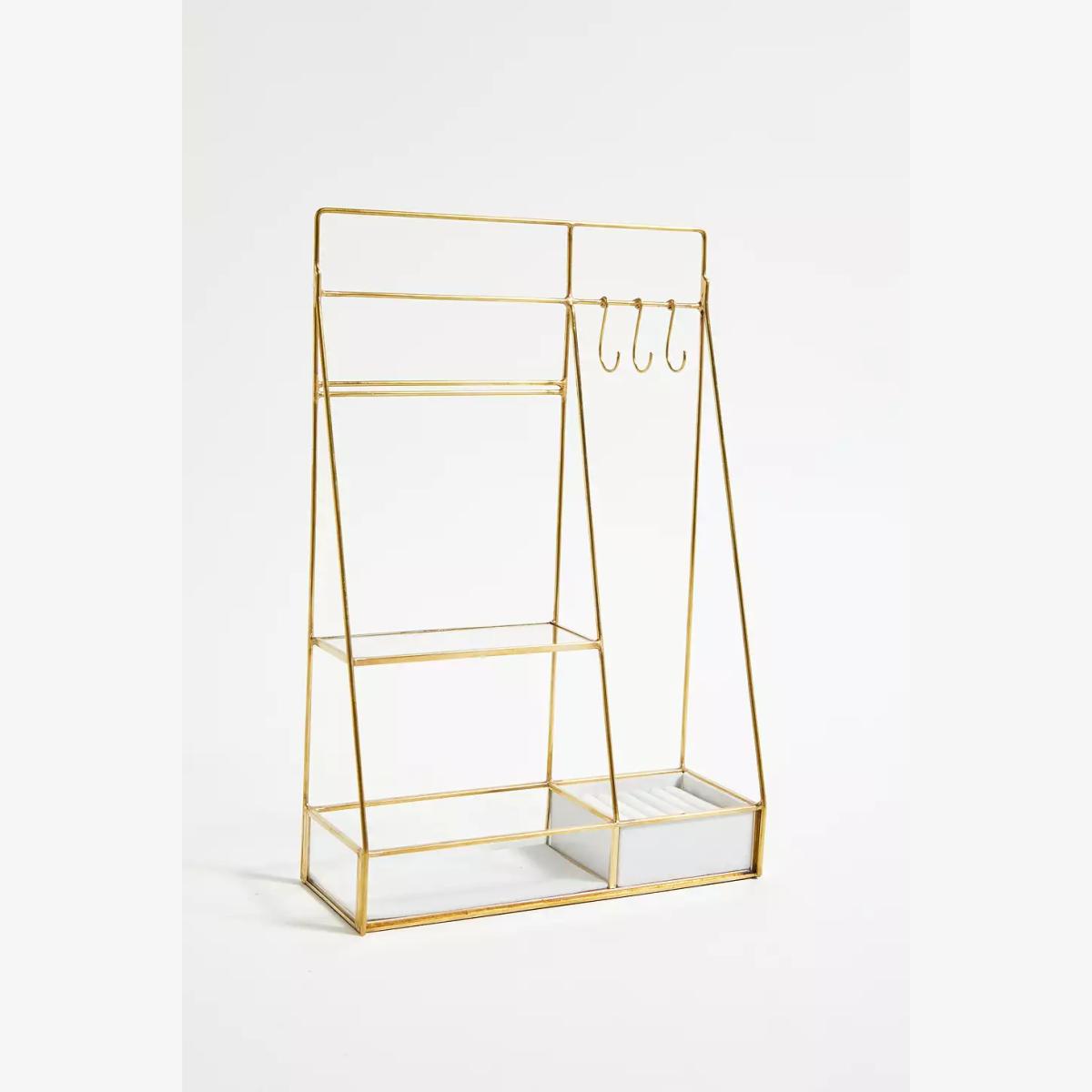 Sturdy metal and glass unit for storing all of your favourite jewellery pieces on. Features panelled sections for storing different jewellery styles, finished with a glass side base at the bottom. **Content + Care** \- Brass, Glass \- Wipe clean
