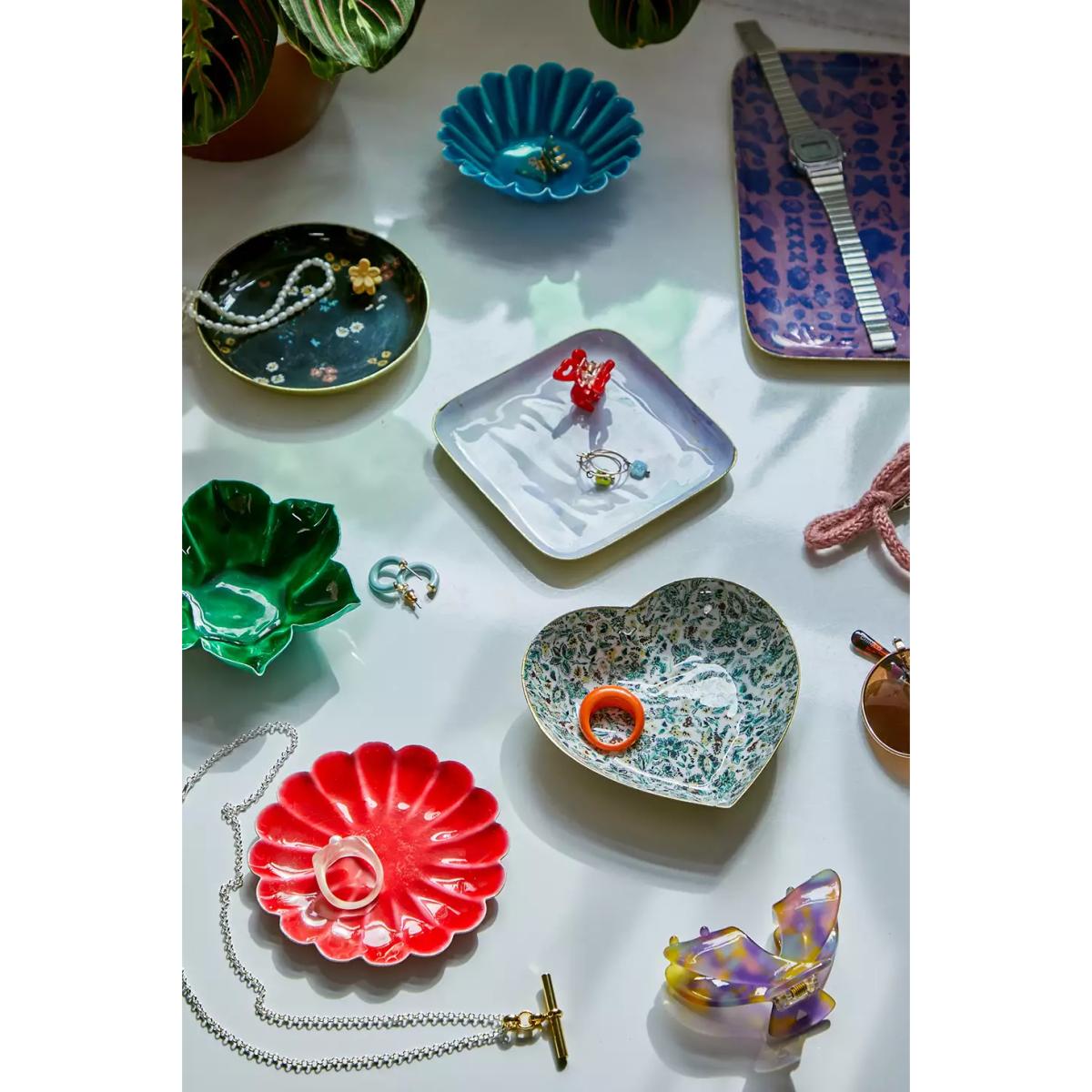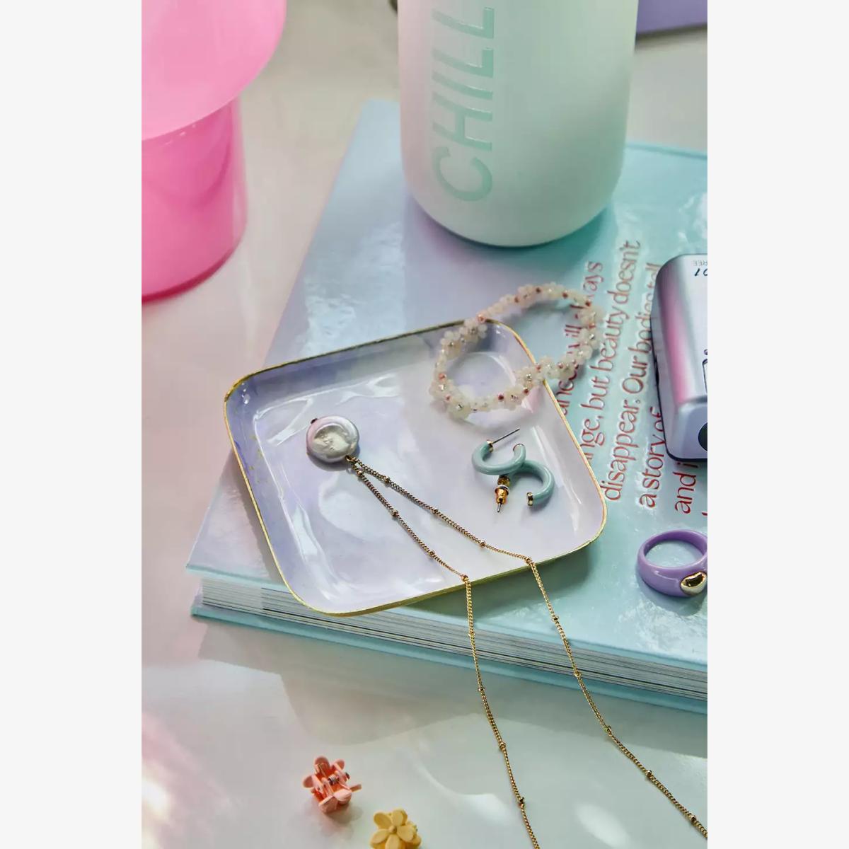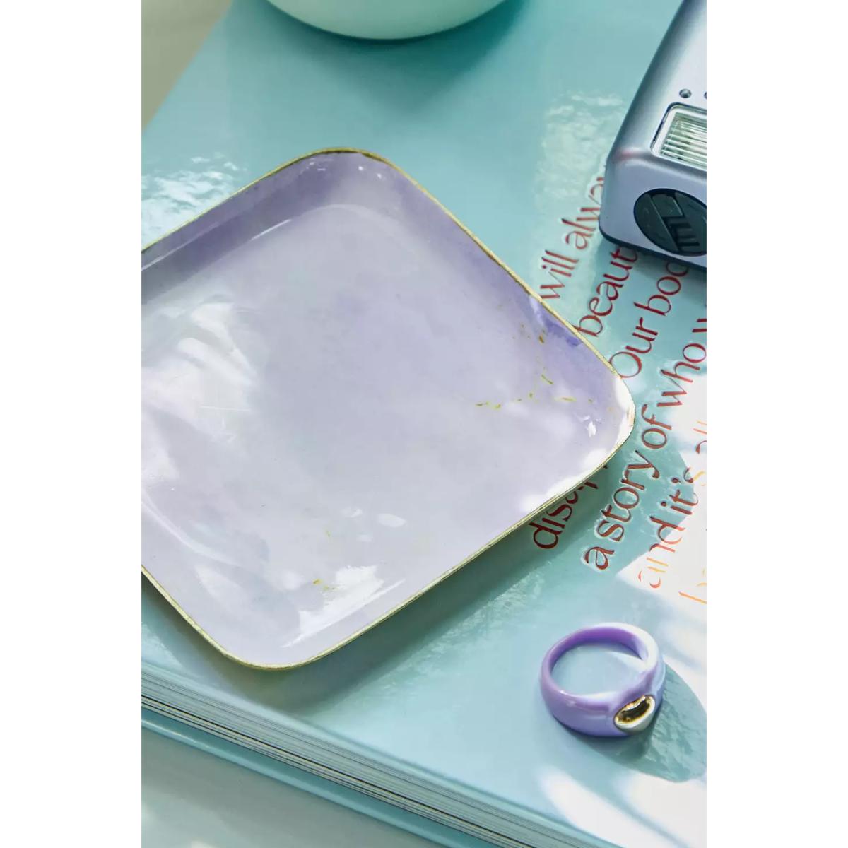 Agate printed trinket tray with a soft, washed out colour finish. Square trinket tray with rounded edges that are raised for capturing your jewellery and trinkets, finished with a tipped brass finish. **Content + Care** \- Iron \- Wipe clean