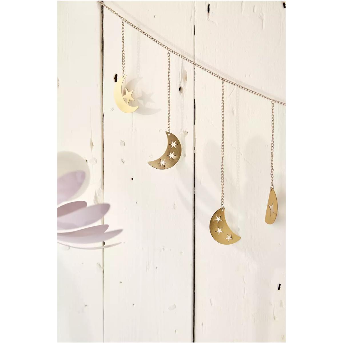 Bring some celestial vibes to your space with this laser-cut metal banner. The wall hanging features hanging moon and star motifs on a lightweight metal chain, complete with hoops at either side for looping onto wall hooks. **Content + Care** \- Metal \- Wipe clean