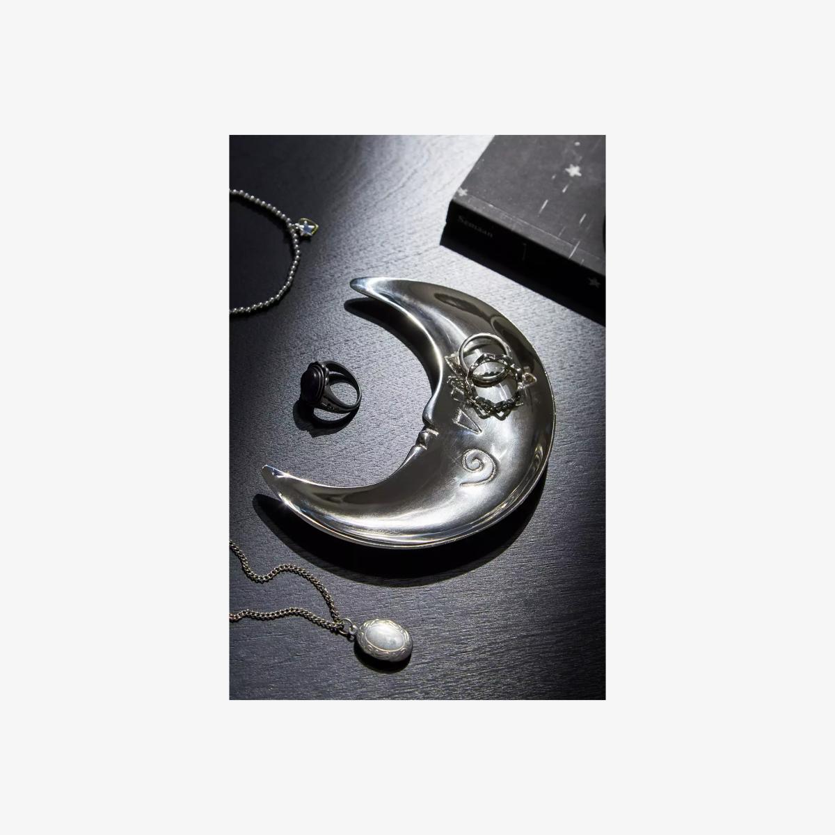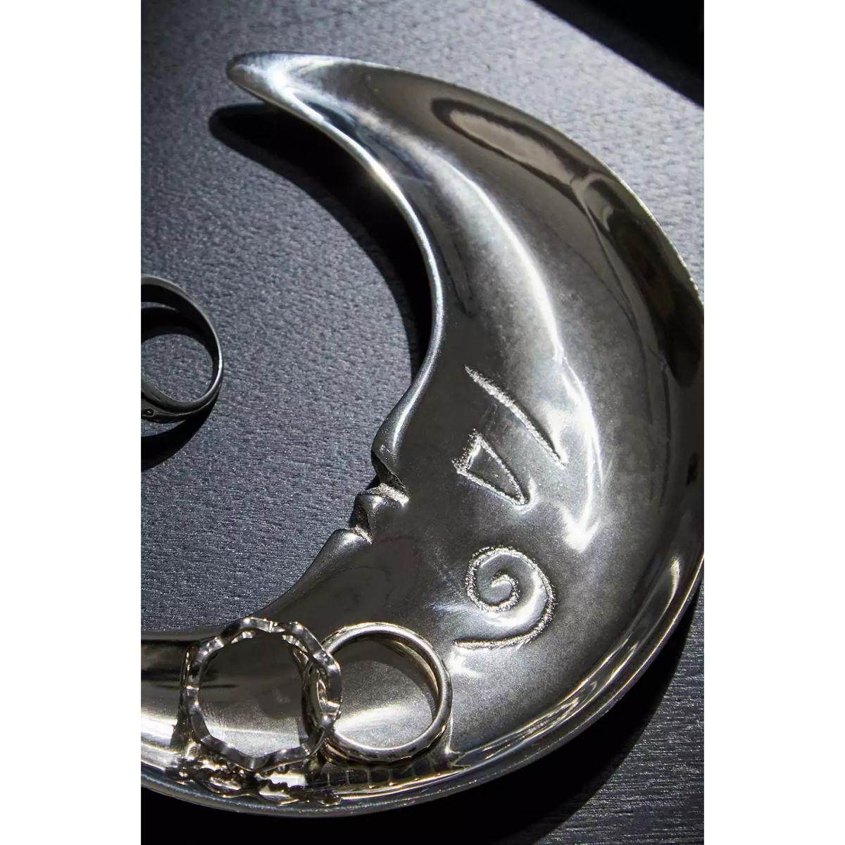 Night sky-inspired trinket tray with a cute crescent moon design. Shiny silver metal trinket tray with raised edges and an embossed face motif, perfect for capturing rings, jewellery or other small bits. **Content + Care** \- 100% Aluminium \- Wipe clean