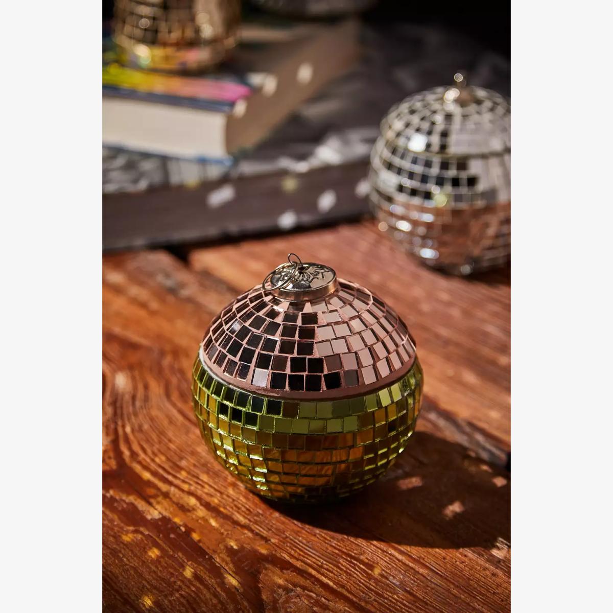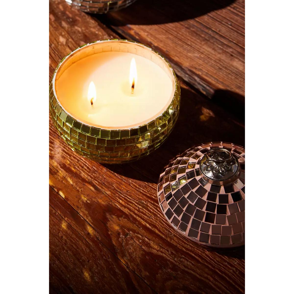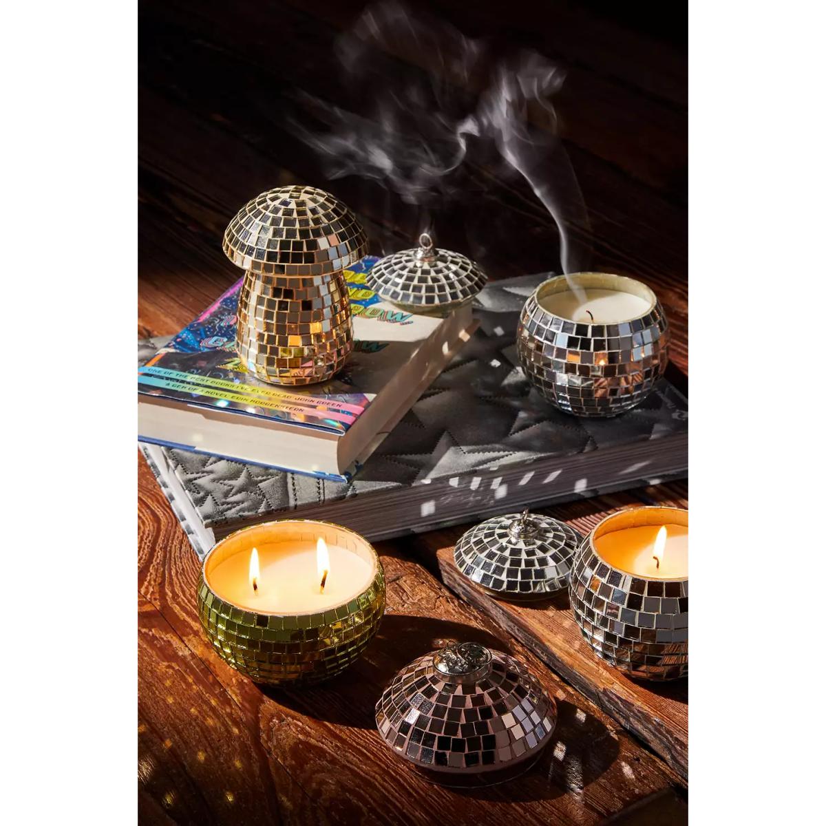 Bring the grooviest vibes to your space with this mirrored disco ball candle. Features small mirrored squares in a circular design with a top that comes off and a candle inside. **Content + Care** \- Glass, Wax \- Wipe clean