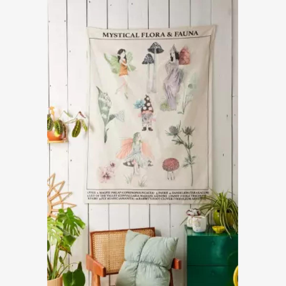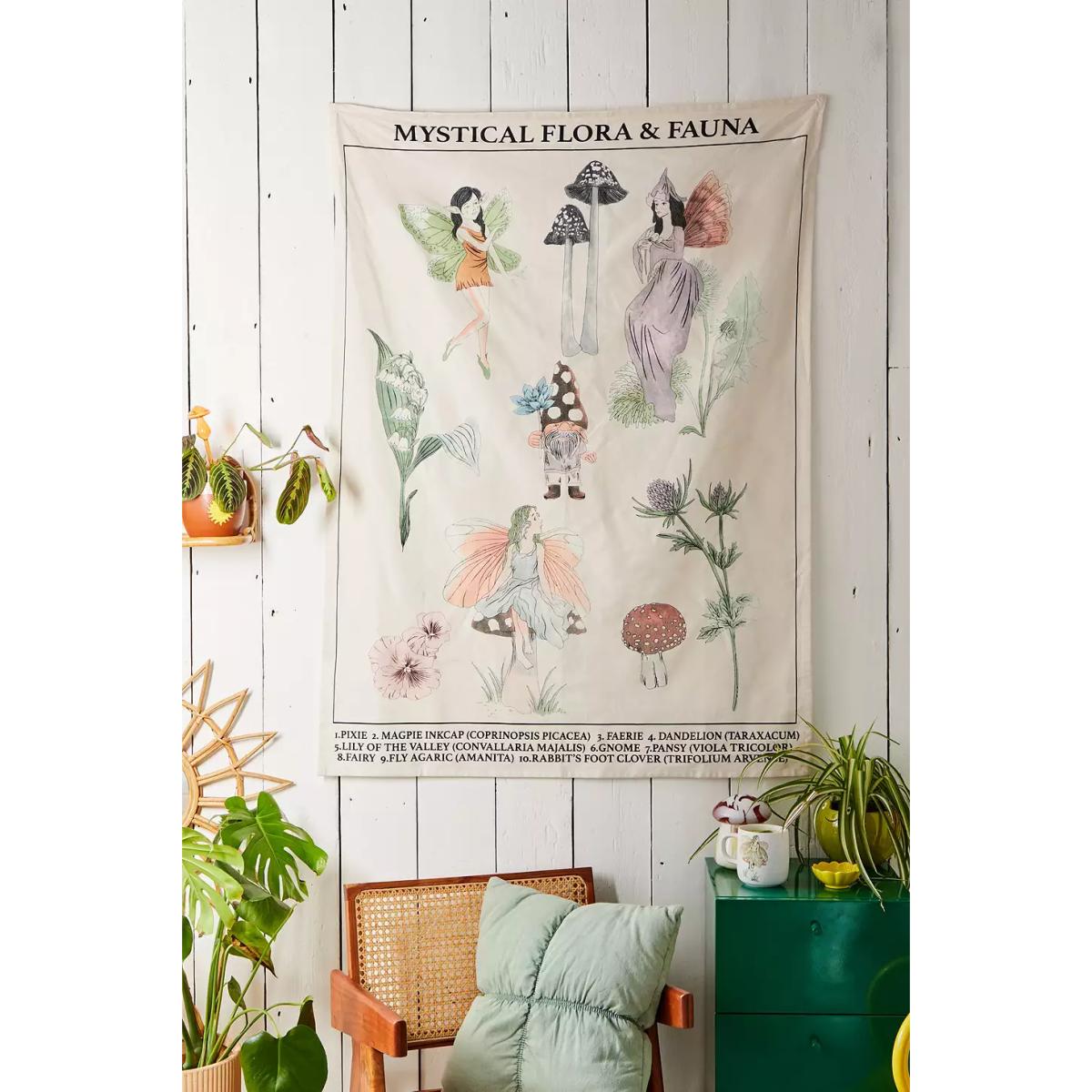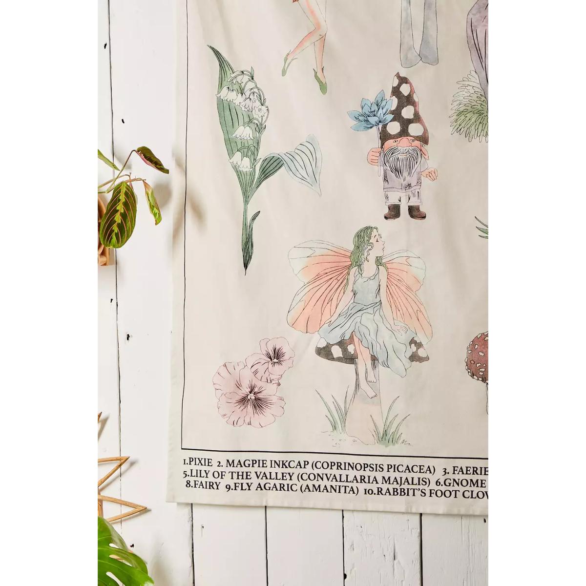 Bring mystical vibes to your wall gallery with this vintage-style tapestry. Complete with mystical fairies and gnomes printed to the centre with a typography print to the base. Square silhouette finished in an easy-hanging cotton canvas. **Content + Care** \- 100% Cotton \- Spot clean **Size** \- 91cm x 121cm
