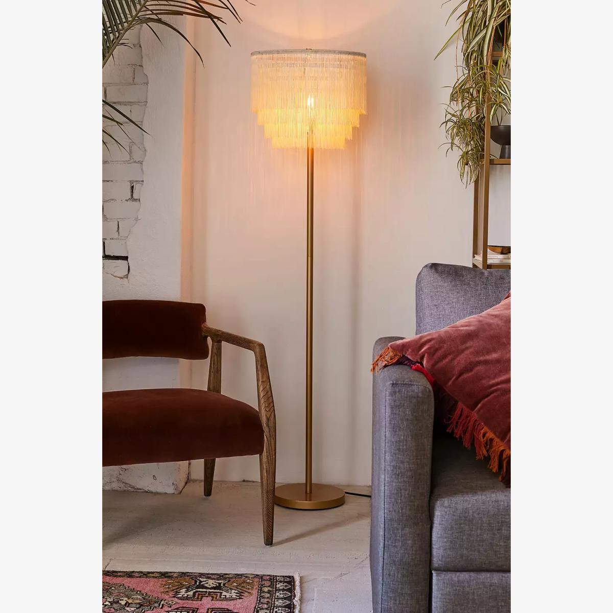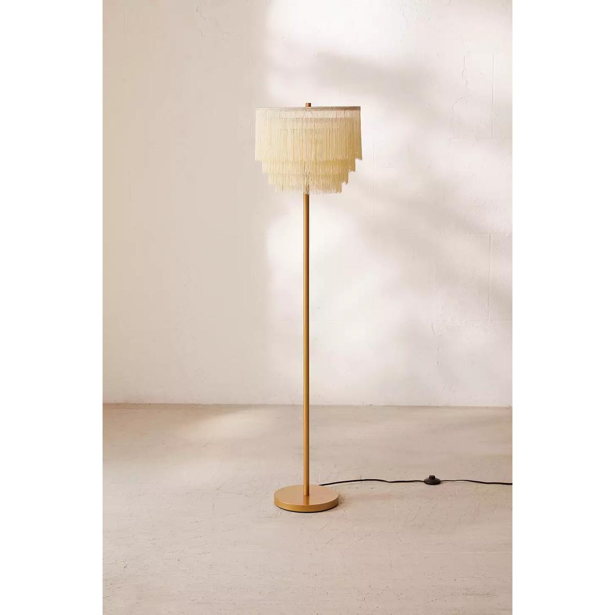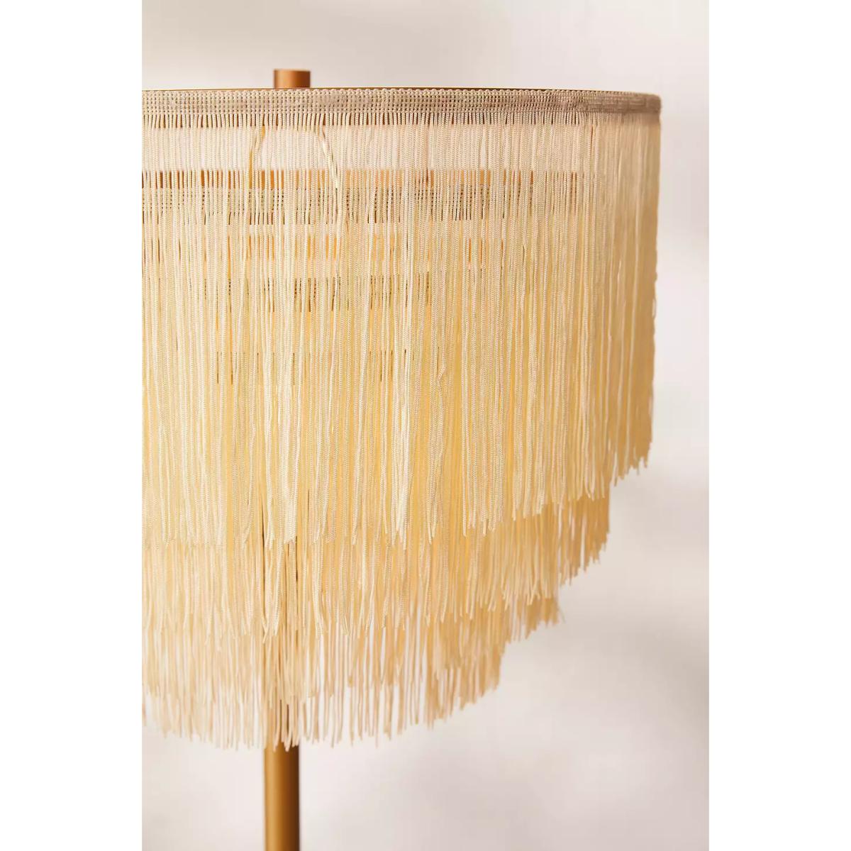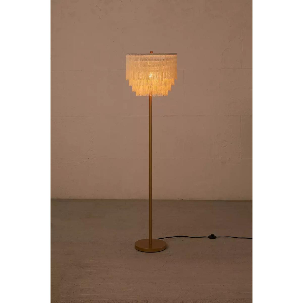Add some art deco to your space with this 20s-vibe fringed light. The floor lamp stands tall with a slim silhouette, a round base and a tiered lampshade crafted from textile-fringed details. Plugs in to power with an in-line switch. **Content + Care** \- Assembly required \- Coated iron, Nylon \- Wipe clean \- Includes UK plug \- Requires E26 Type A 60W LED Bulb (not included) **Size** \- Dimensions: W: 38cm x H: 145cm \- Mounting plate dimensions:Dia: 25cm x H: 2.5cm \- Cord length: 180cm \- Weight: 9.63lbs \- Shipping package dimensions: L: 40cm x W: 40cm x H: 39cm \- Shipping package weight: 11.02lbs
