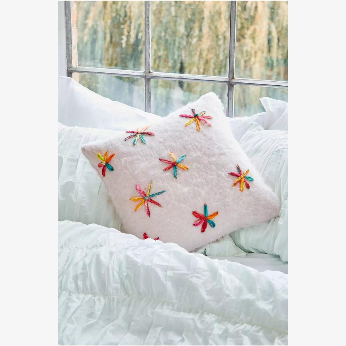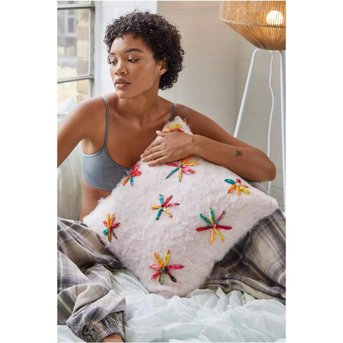 I love the pink embellished cozy cushion for adding a playful touch to both contemporary and eclectic interiors. Its soft, fluffy texture combined with colourful embroidery makes it a versatile piece that can brighten up a neutral sofa or bed. It works particularly well styled with other textured cushions or layered in a space with a mix of colours for a relaxed, inviting vibe. For practical styling, consider pairing it with plain, understated cushions to let its embroidery stand out, and avoid overcrowding your space to keep the details prominent. This cushion is perfect for making your seating or bed feel more personalised and cosy without overwhelming the overall aesthetic.