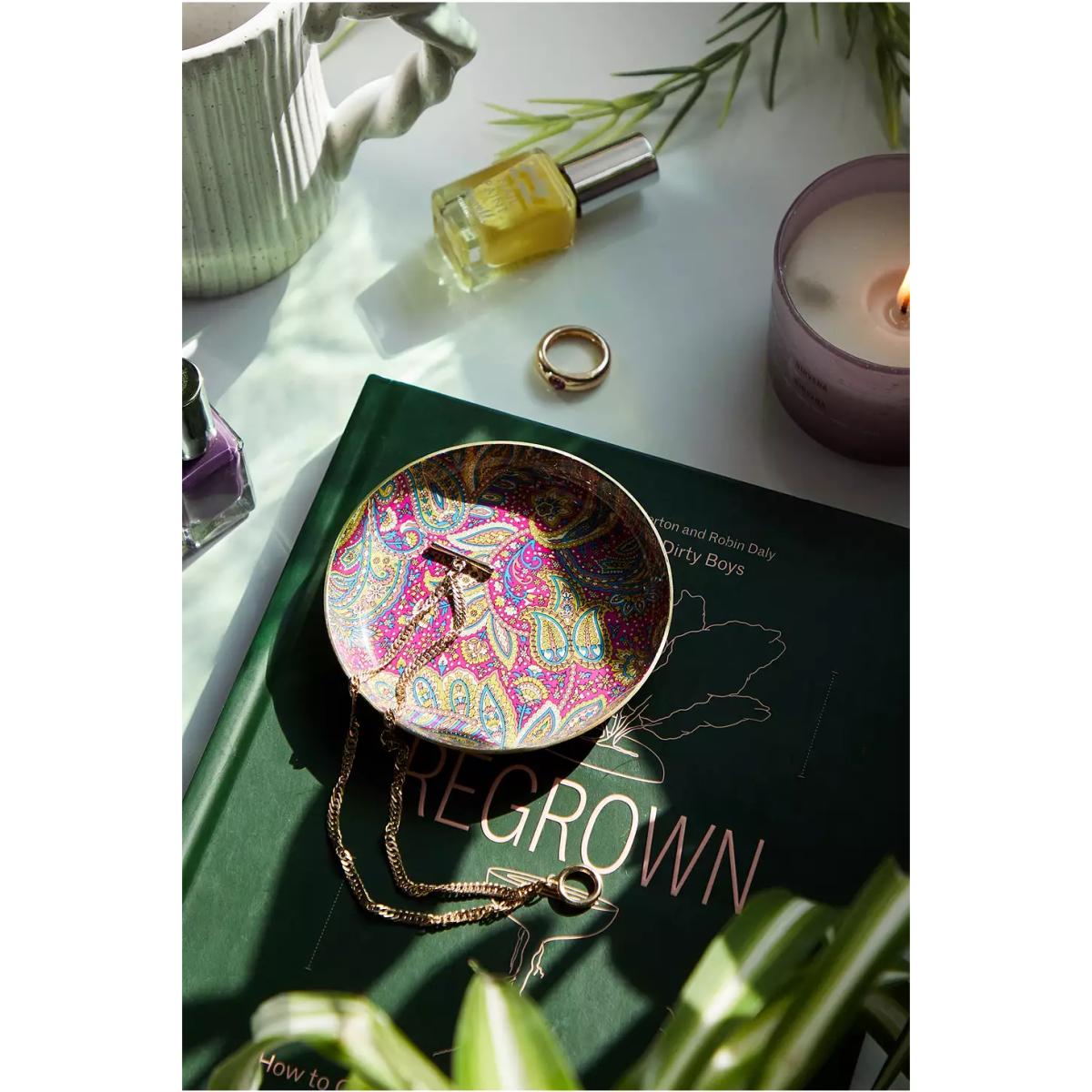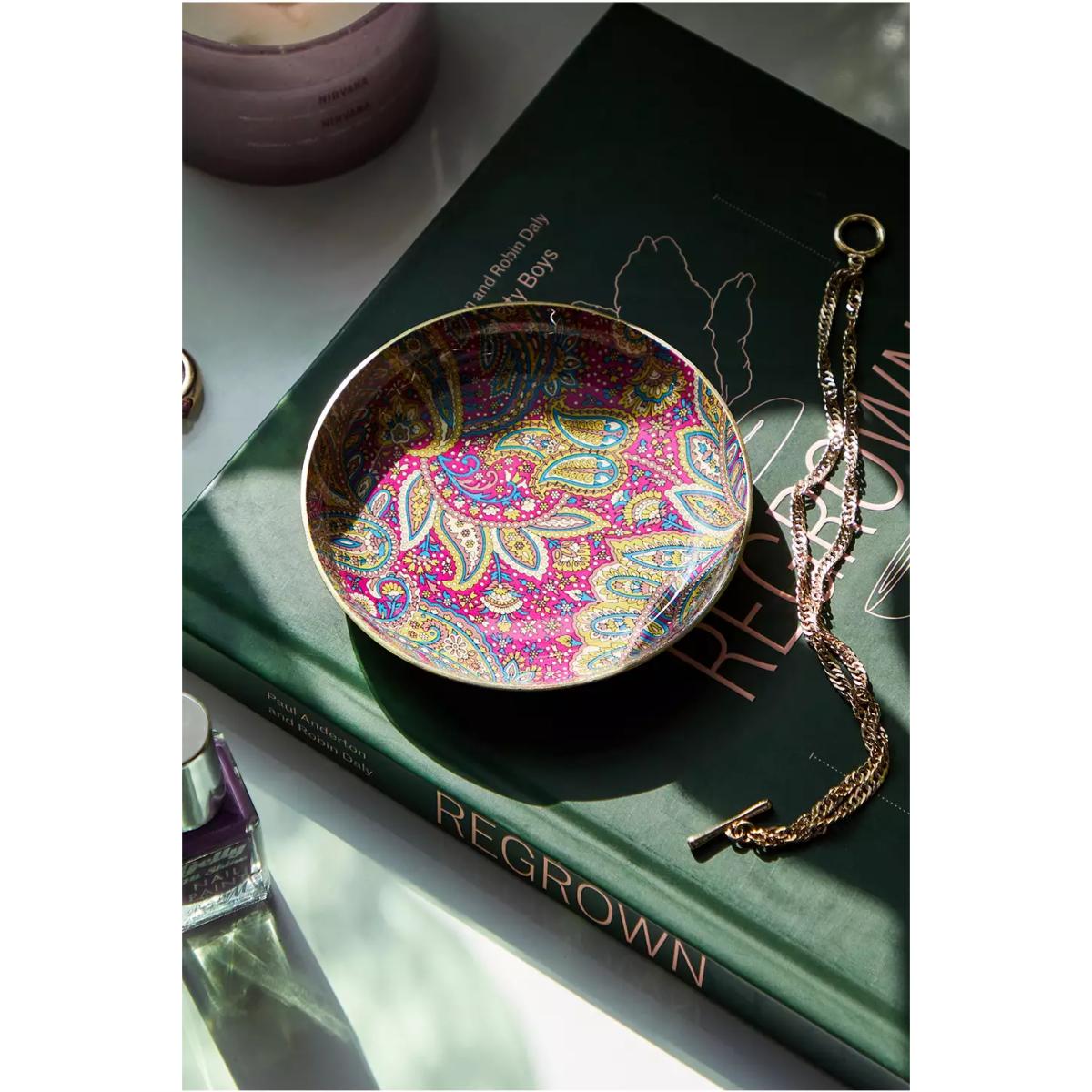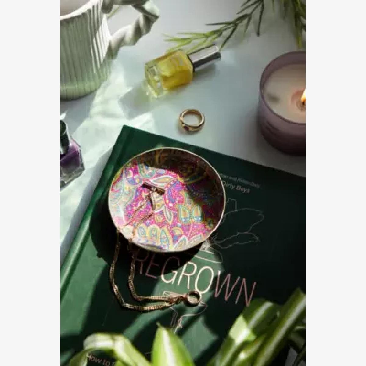 I love the vibrant, eclectic vibe this purple paisley print trinket dish adds, especially in boho or vintage-inspired interiors. It works well as a small accent piece on side tables, dressers, or as jewellery storage in a bedroom or dressing area. To style, try pairing it with other patterned or colourful accessories to create a layered, collected look. Since it’s bold and detailed, keep surrounding decor relatively simple to let it stand out. It also doubles as a charming gift for someone who appreciates unique artwork and adds a pop of colour to any space.