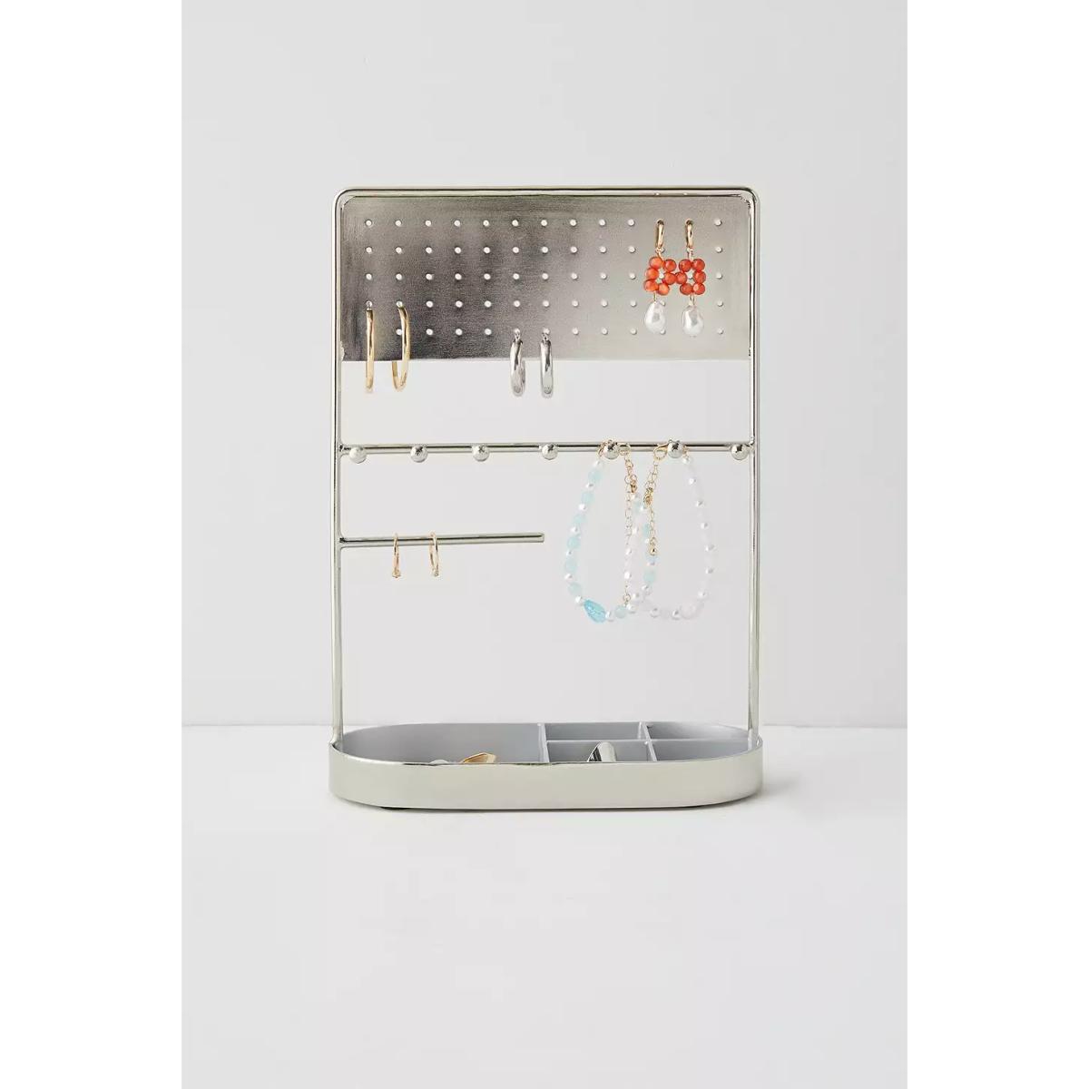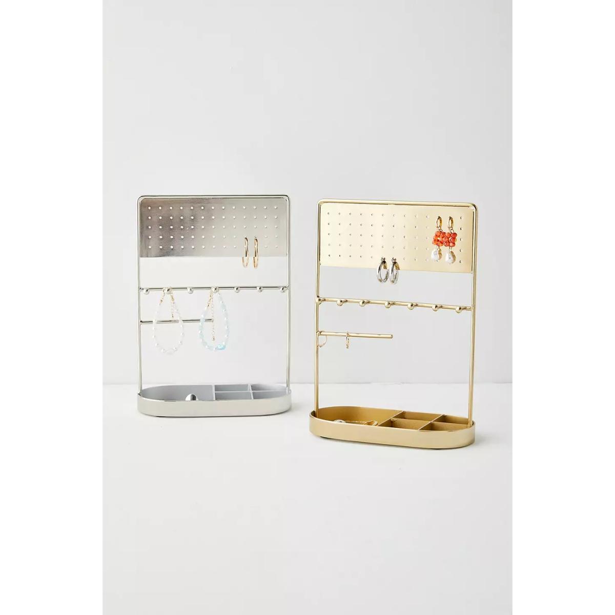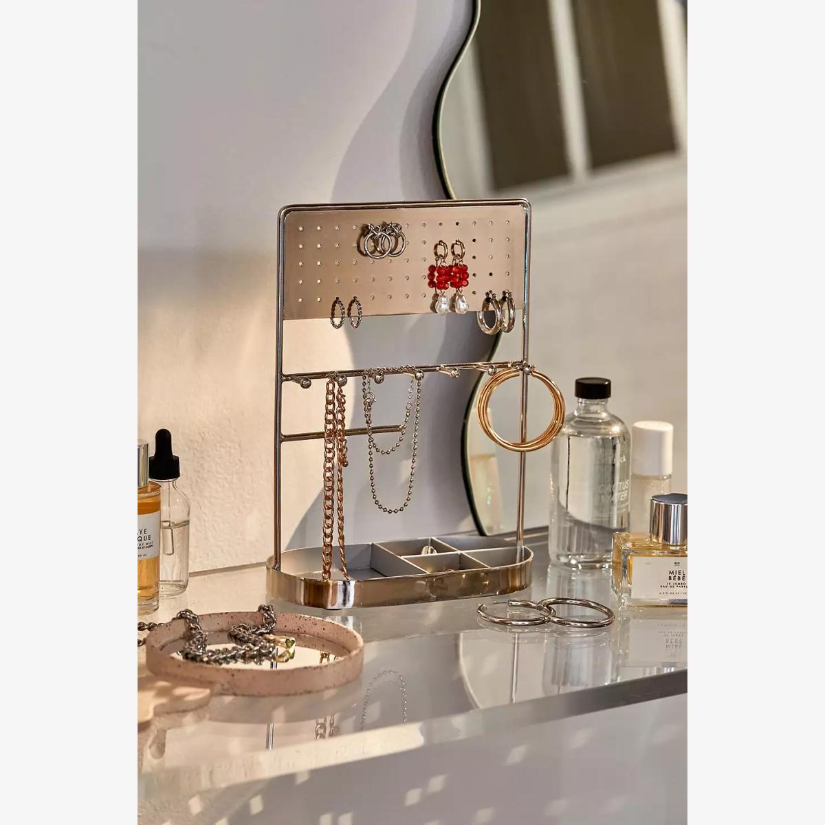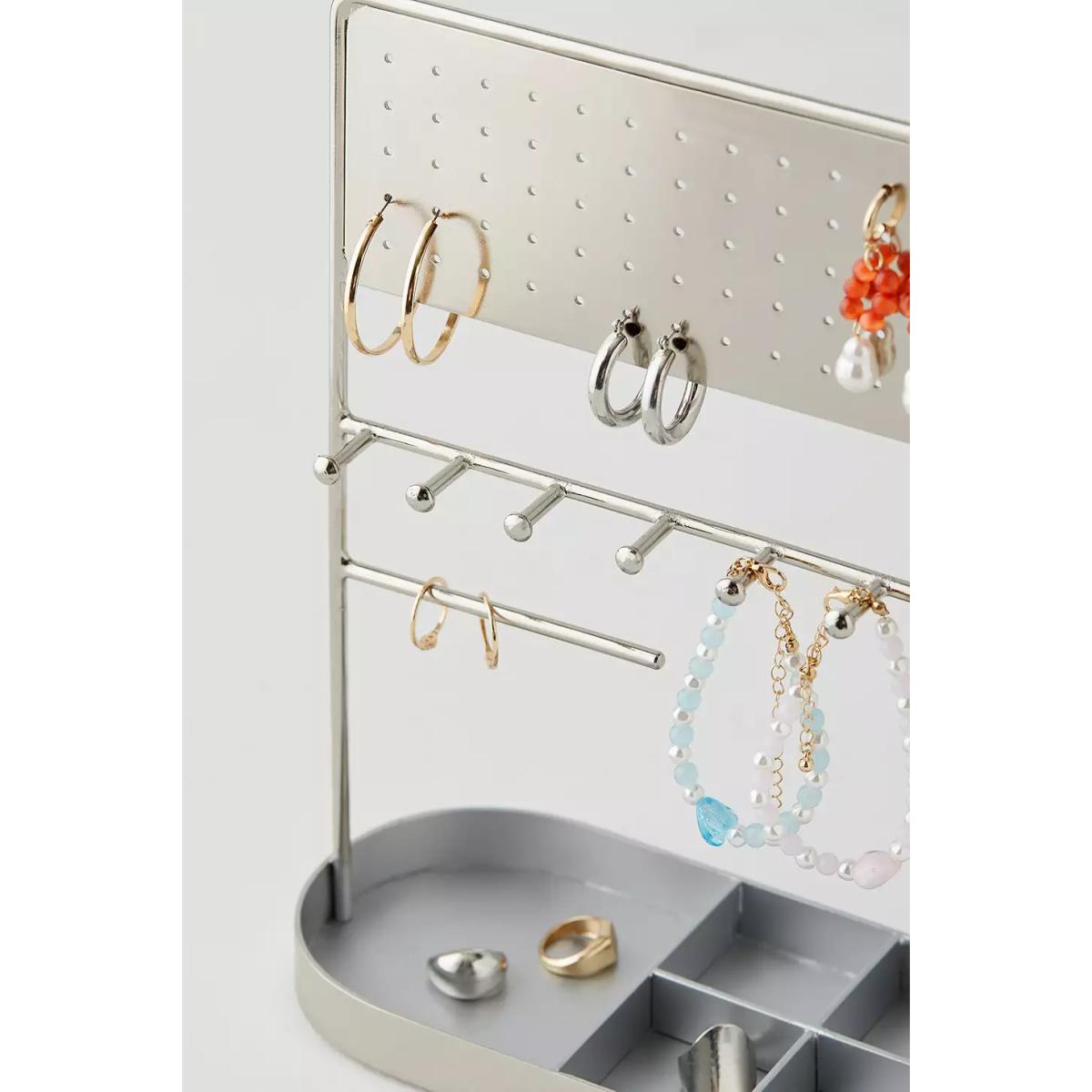 Organise your dresser with a tabletop jewellery stand. Sturdy metal frame organiser with holes for storing earrings in, hooks for hanging jewellery and a catch-all base at the bottom for everything else. **Content + Care** \- 100% Iron \- Spot clean