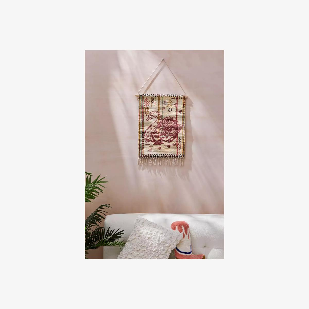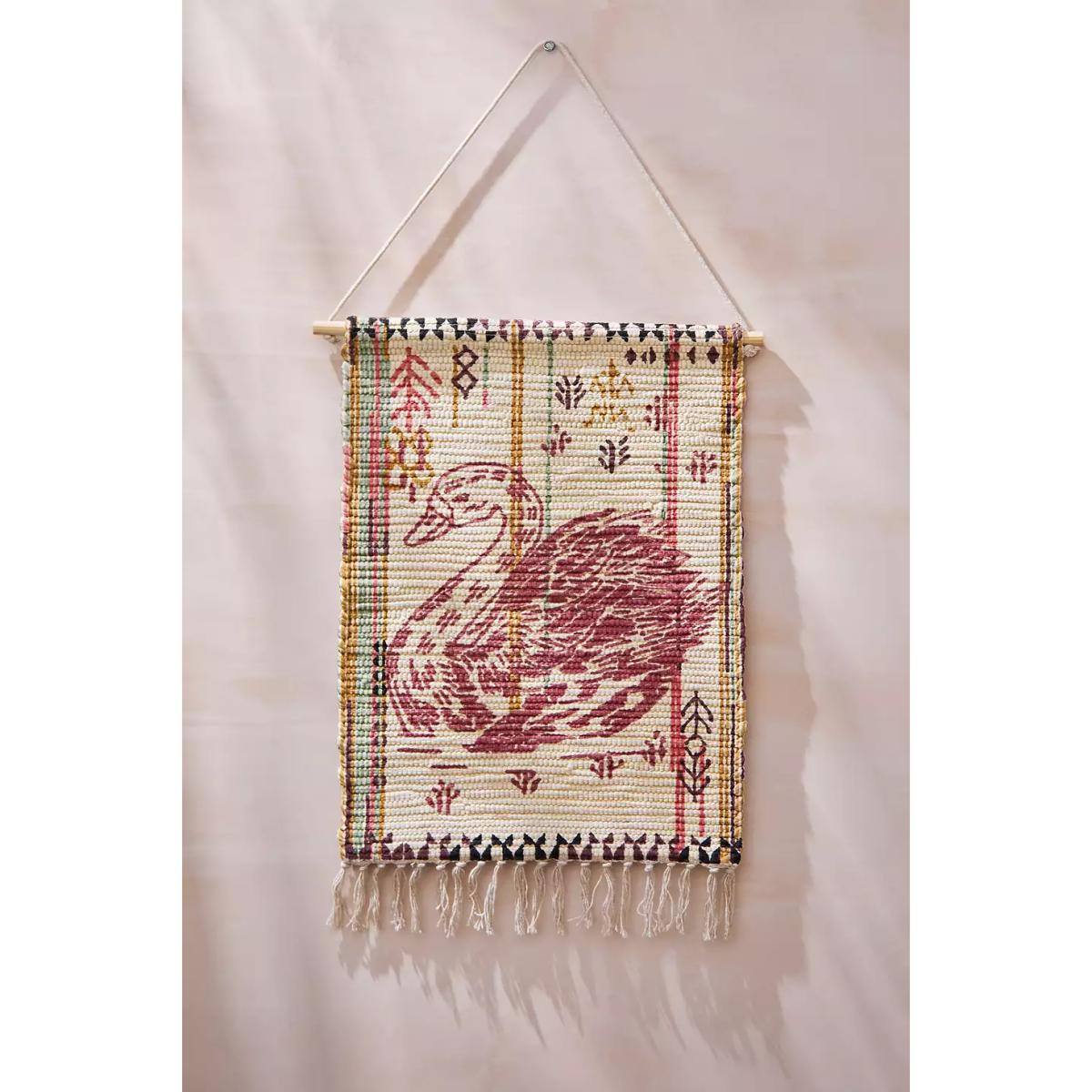Complete your space with this swan wall hanging. Complete with a dowel rod and loop for easy hanging and fringe tassels lining the bottom. **Content + Care** \- 100% Cotton, Wooden dowel \- Spot clean