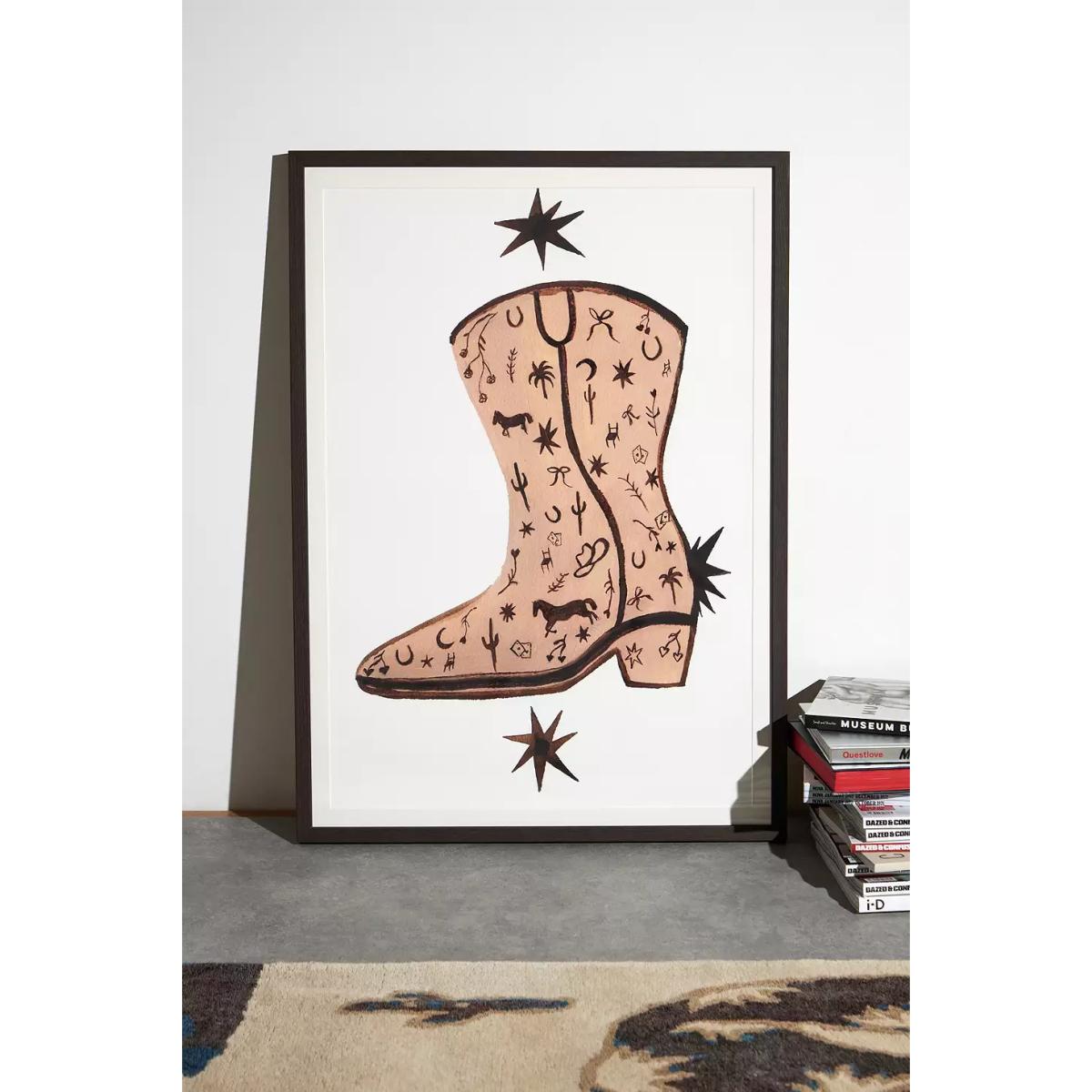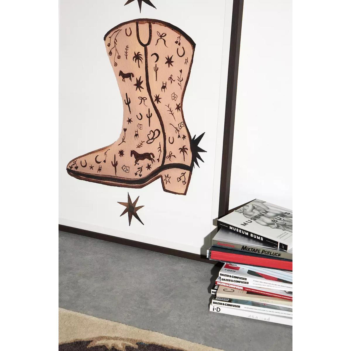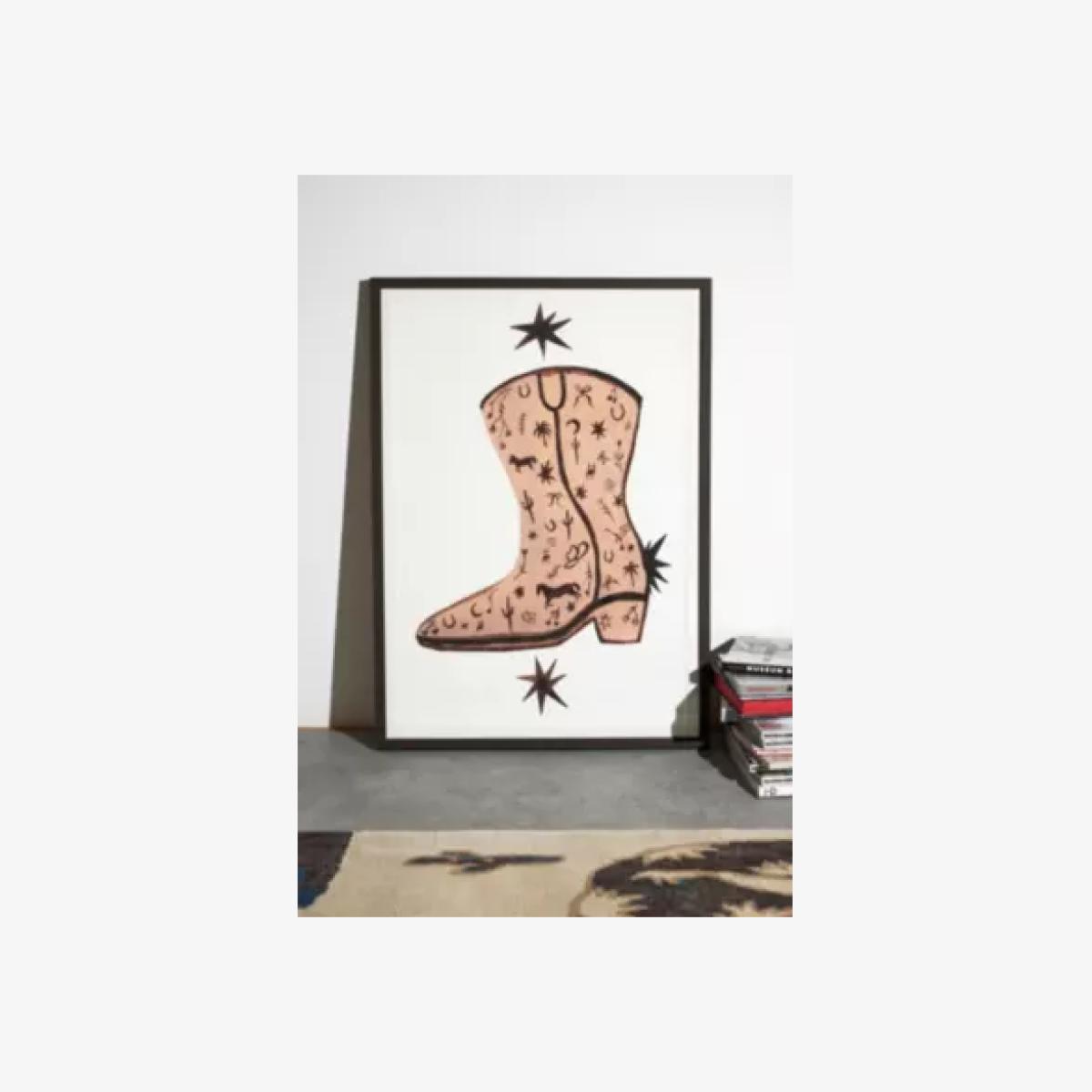 This pair of boots print makes for a fun and eclectic art piece that works particularly well in casual, laid-back interiors or modern spaces with a touch of whimsy. I love how it adds personality and a pop of colour without being overpowering, making it versatile for bedrooms, living rooms, or even a creative office nook. For styling tips, try pairing it with vintage or rustic furniture to highlight its playful vibe, or hang it above a simple sofa or bed to create a focal point. It also works well as part of a gallery wall, mixed with other quirky prints or art, for an intentional, curated look. Overall, it’s a great piece to inject some individuality into your space.