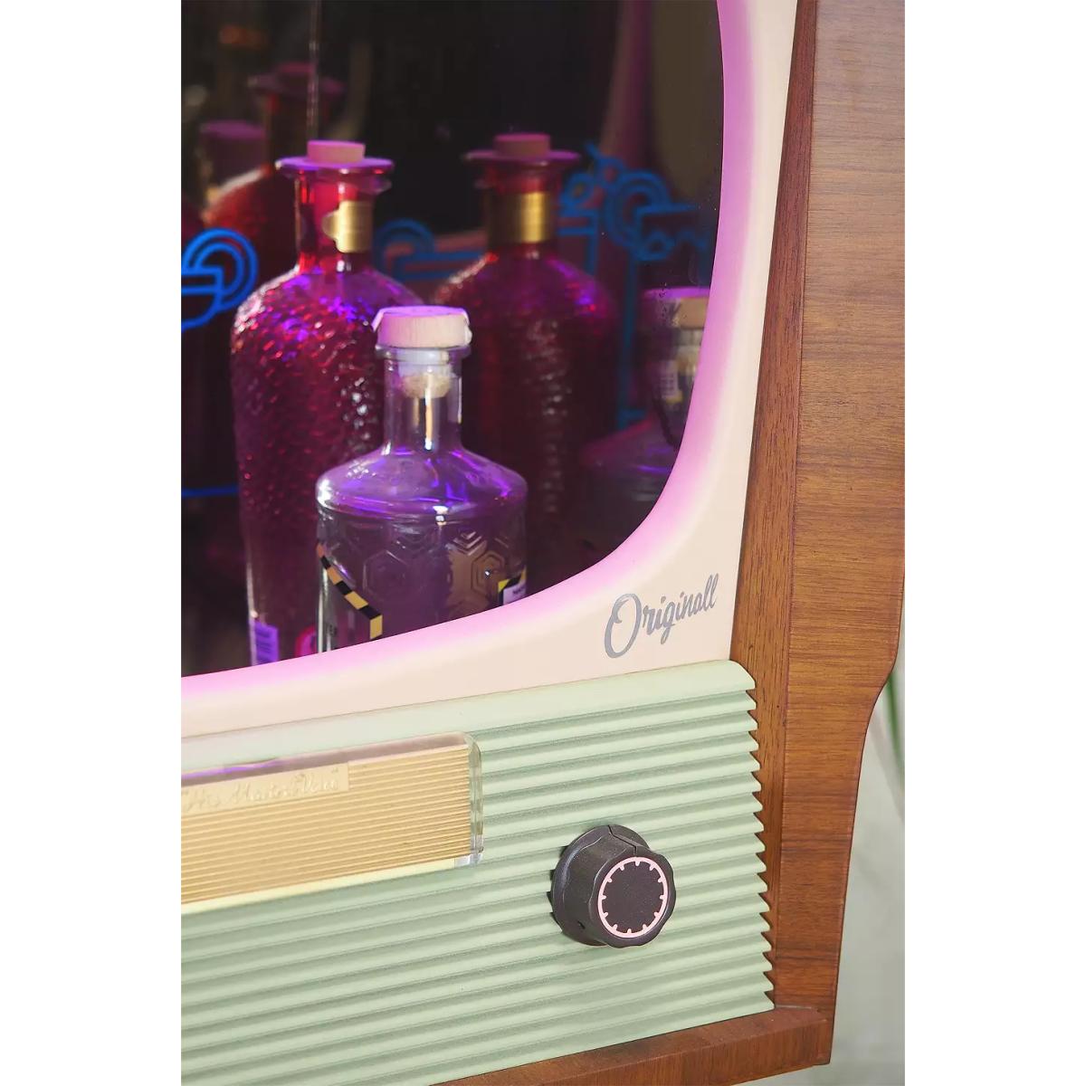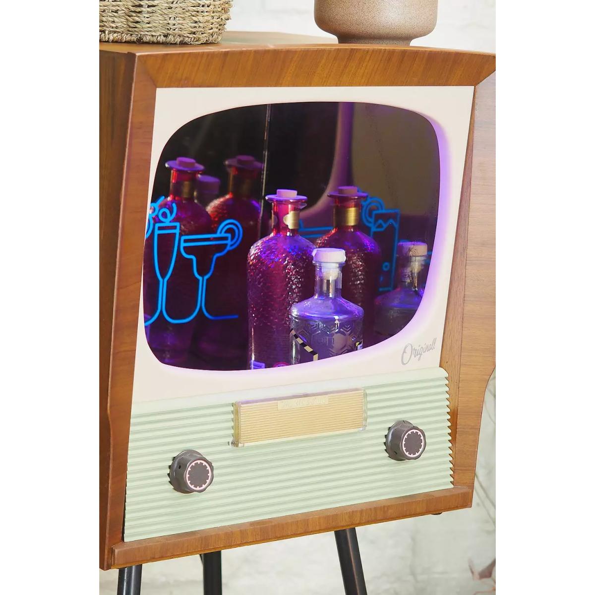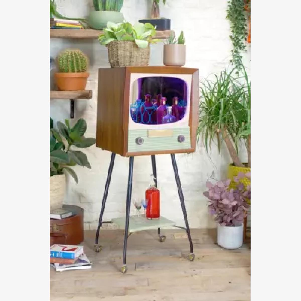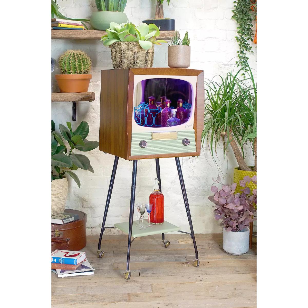 Upgrade your bar space with this one-of-a-kind cocktail cabinet crafted from a 1950s television. Redesigned television complete with a box wooden frame and TV design front on four steel legs. Powered by USB this light-up cabinet has a hollow centre and mirrored walling to place favourite drinks inside. Finished with a shelf at the base of the legs and wheels to move the cabinet to wherever you are entertaining. *Online return only. This item cannot be returned instore. Please note furniture items currently cannot be shipped to Northern Ireland or The Republic of Ireland. Delivery of large furniture items may take 1-2 weeks and are therefore not eligible for Next Day Delivery.* **About Urban Renewal Vintage** \- One-of-a-kind pieces sourced by the vintage furniture experts at Originall Creations \- Authentic, pre-loved vintage pieces which are sold as seen and therefore may show signs of wear and tear \- This item will be dispatched by the vendor and may take longer to process than other items in your order **Content + Care** \- Plywood shell, LED lighting, Oak shelf, Mirrored glass lining, Steel legs \- USB powered \- Wipe clean **Size** \- H:124cm x W:48cm x D:45cm