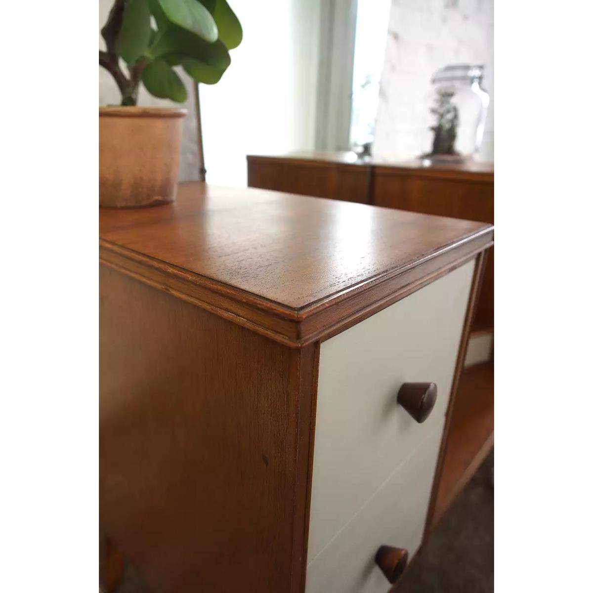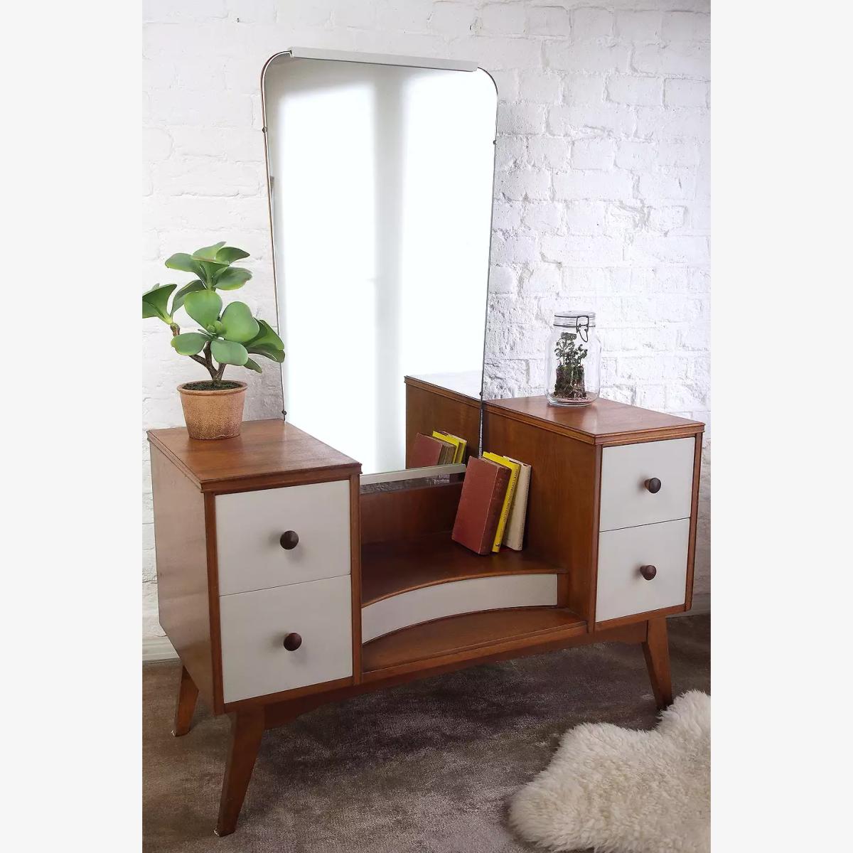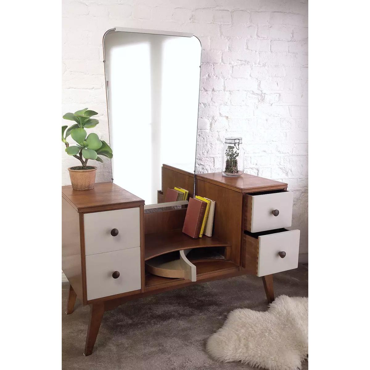 Vintage wooden 1960s high back mirrored dressing table with unusual hidden pivot drawer in the centre. Finished in the original lacquer style with pale dove paint used to finish drawer fronts. *Please note: This item is not eligible for Next Day Delivery. For any large Furniture, delivery can take between 1-2 weeks and we cannot deliver this outside of UK mainland. All Urban Renewal Vintage homeware is non-returnable. * **About Urban Renewal Remade From Vintage** \- Upcycled pieces using vintage materials sourced from the experts at Originall Creations **Content + Care** \- Wood \- Avoid placing hot or wet objects directly onto the surface \- Wipe with a clean, dry cloth **Size** \- H: 147cm x W: 108cm x D: 46cm