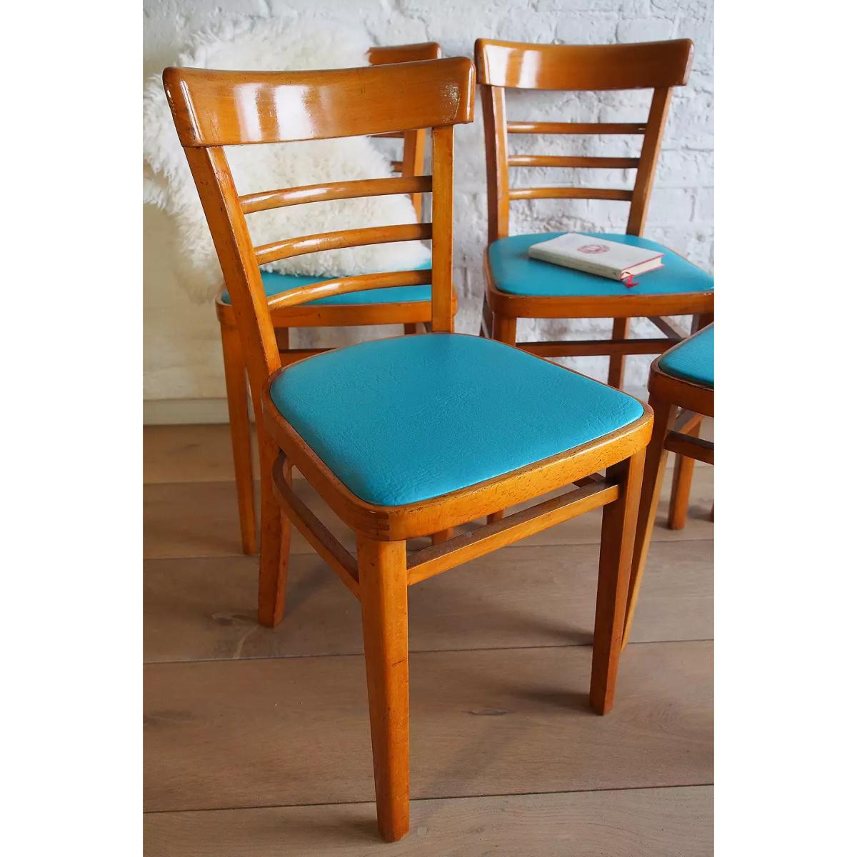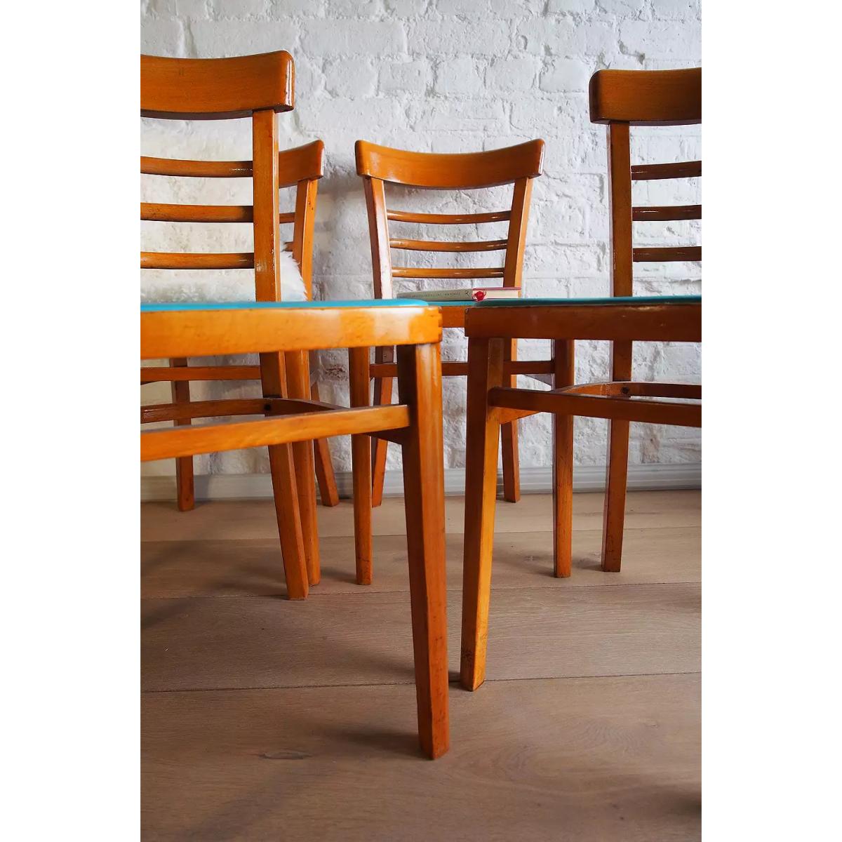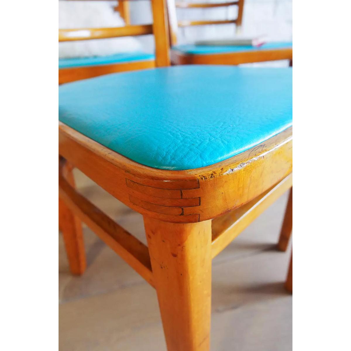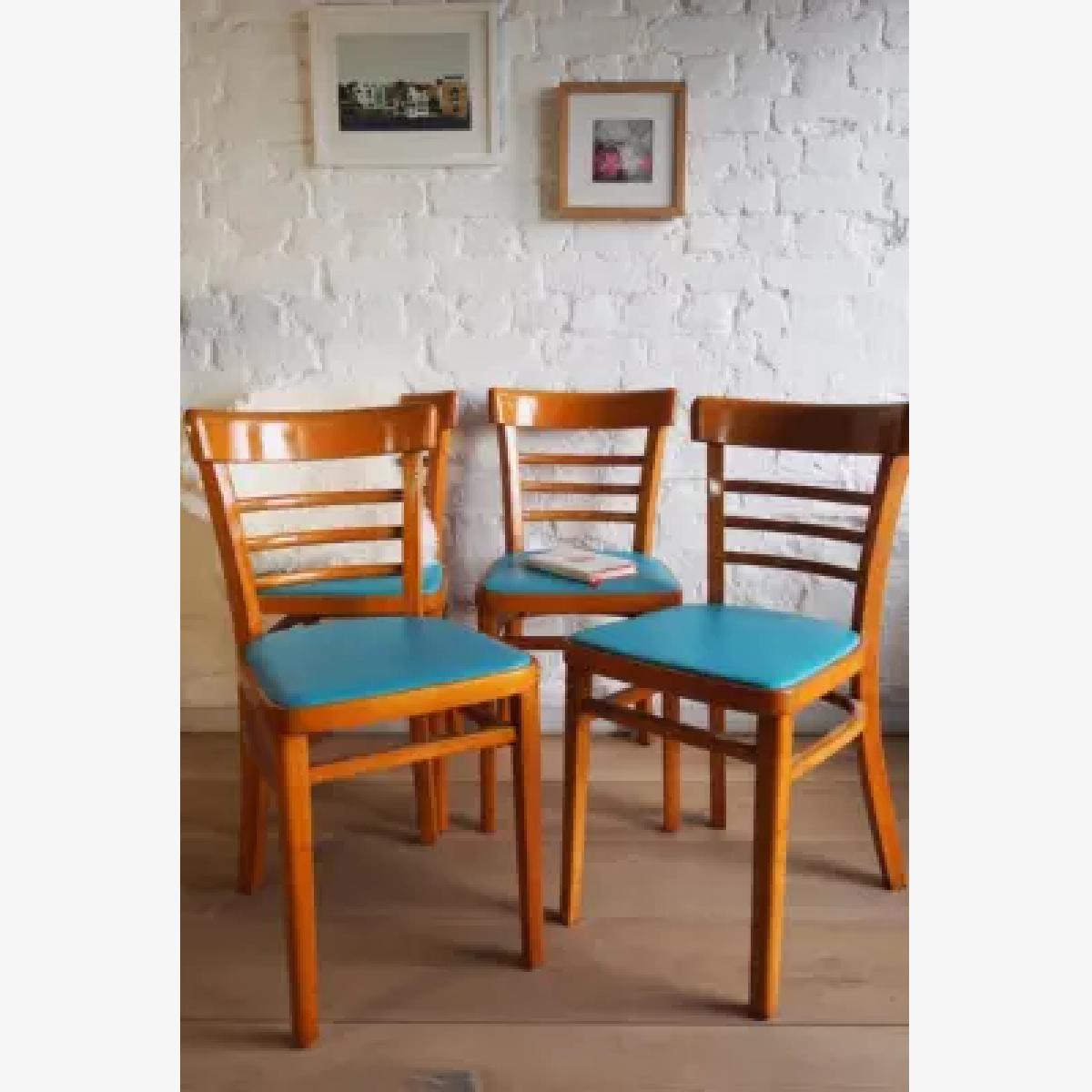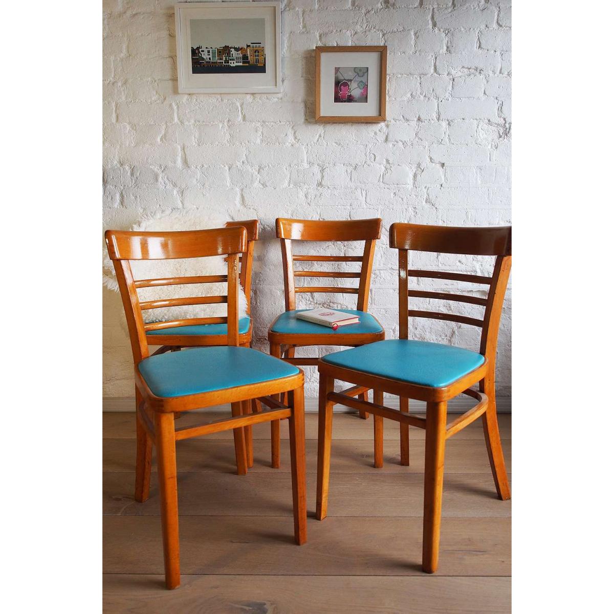 Complete your mid-century interiors with four vintage dining chairs. Sourced from the 1960s and lovingly upcycled, these beechwood chairs boast a rustic wood finish with a bright splash of teal vinyl to the seats. *Please note furniture items currently cannot be shipped to Northern Ireland or The Republic of Ireland. Delivery of large furniture items may take 1-2 weeks and are therefore not eligible for Next Day Delivery. All Urban Renewal Vintage homeware is non-returnable. * **About Urban Renewal Remade Vintage** \- One-of-a-kind pieces sourced by the vintage furniture experts at Originall Creations \- Upcycled pieces using vintage materials \- This item will be dispatched by the vendor and may take longer to process than other items in your order **Content + Care** \- Includes 4 chairs \- Beech, Vinyl \- Wipe with clean, dry cloth \- The wood displays slight signs of age **Size** \- H: 78cm x W: 39cm x D: 45cm