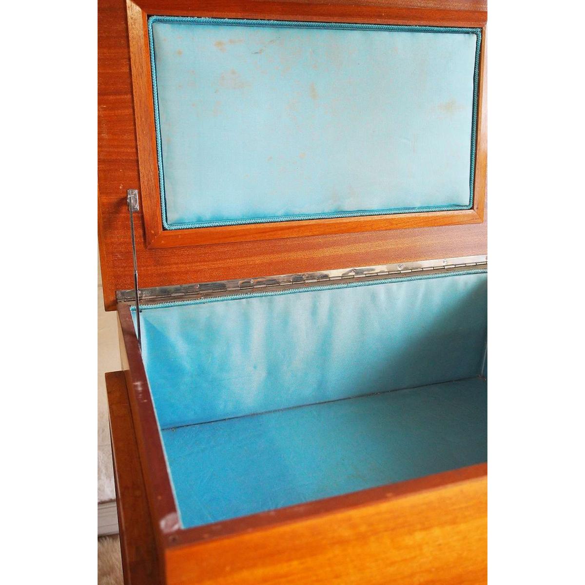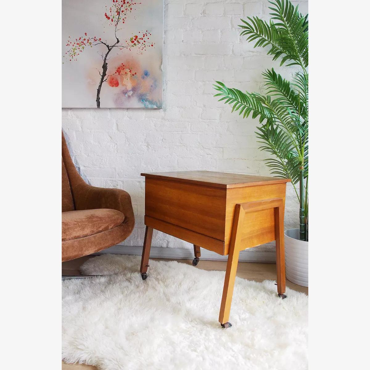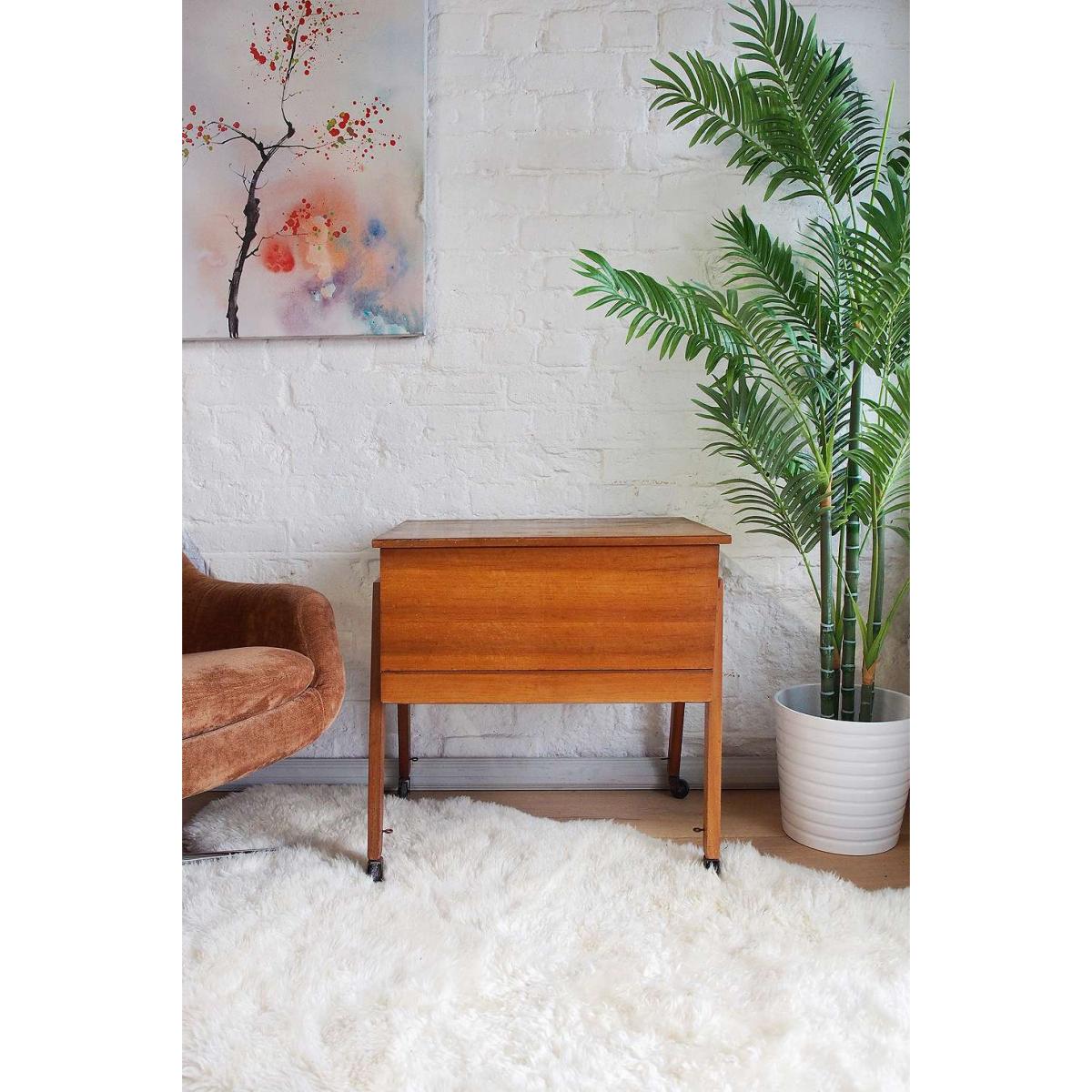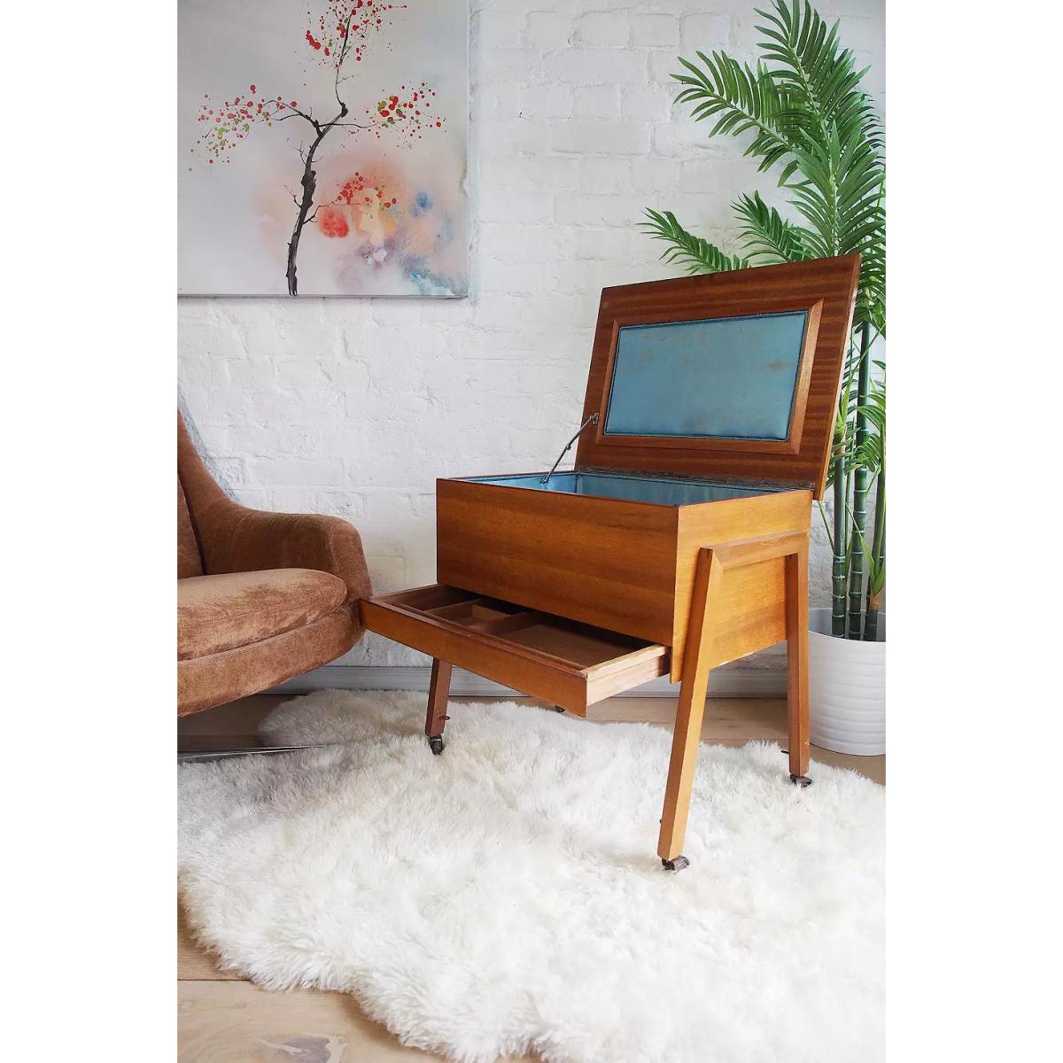 Original C Arnold Of Marlow sewing box, a true vintage piece sourced from the 1960s. Fully functional teak construction with a lift-up lid, pull-out drawer and four legs with castors. Finished with a teal fabric lining inside. *Please note: This item is not eligible for Next Day Delivery. For any large furniture, delivery can take between 1-2 weeks and we cannot deliver this outside of UK mainland. All Urban Renewal Vintage homeware is non-returnable. * **About Urban Renewal Vintage** \- One-of-a-kind pieces sourced by the vintage furniture experts at Originall Creations \- Authentic, pre-loved vintage pieces which are sold as seen and therefore may show signs of wear and tear \- This item will be dispatched by the vendor and may take longer to process than other items in your order **Content + Care** \- Teak, Fabric \- Wipe clean \- Features some discolouration to the interior fabric **Size** \- 60cm x 60cm x 44cm