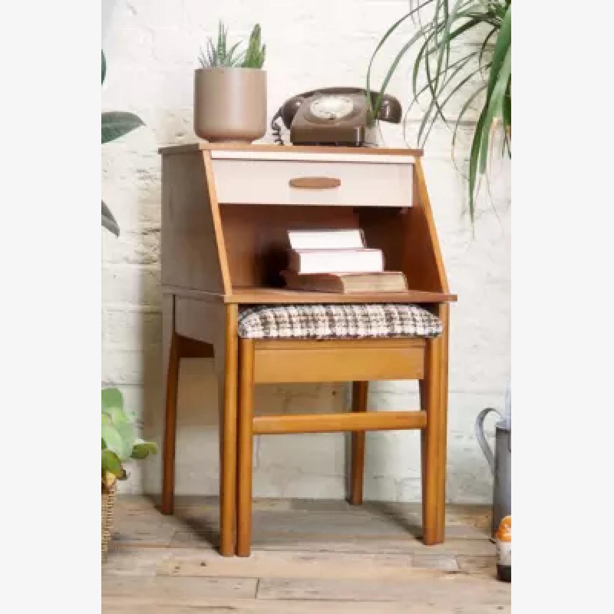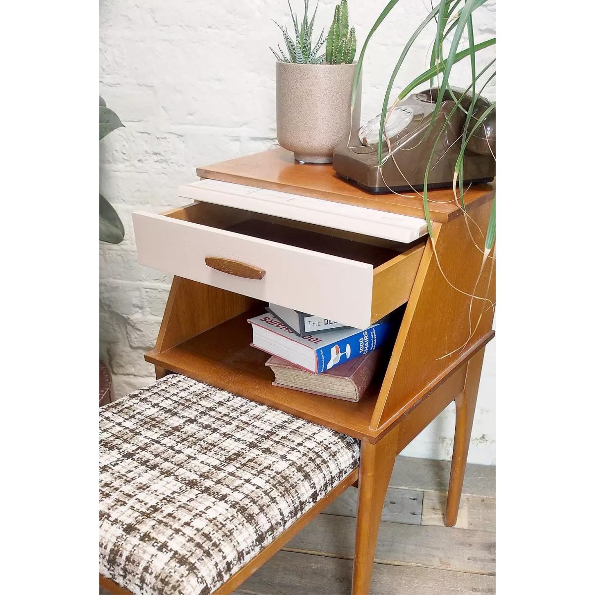 Add versatile seating to your space with this true vintage telephone seat. Combining desk and storage space with a comfortable seat this refurbished piece is complete with an open-front boxed desk with a single drawer and a slotted-in covered seat. Crafted from laminated ply shell with birch wood legs and cotton lining to the seat. *Online return only. This item cannot be returned instore. Please note furniture items currently cannot be shipped to Northern Ireland or The Republic of Ireland. Delivery of large furniture items may take 1-2 weeks and are therefore not eligible for Next Day Delivery.* **Content + Care** \- Leather, Laminated ply, Birchwood, Cotton, Steel \- Wipe clean \- This vintage piece has been refurbished **Size** \- H: 69cm x W:45cm x D:43cm