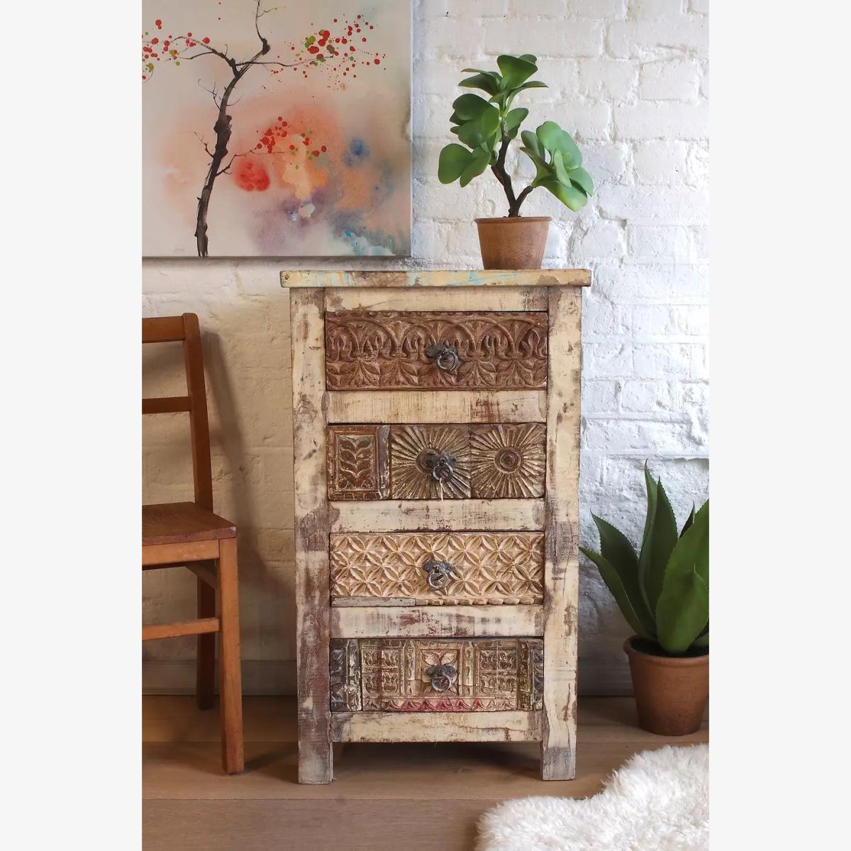 Intricately carved chest of drawers for your stand-out decor, an original modern vintage piece. Features a solid wood construction with four drawers and a detailed carved design. *Please note: This item is not eligible for Next Day Delivery. For any large furniture, delivery can take between 1-2 weeks and we cannot deliver this outside of UK mainland. All Urban Renewal Vintage homeware is non-returnable. * **About Urban Renewal Vintage** \- One-of-a-kind pieces sourced by the vintage furniture experts at Originall Creations \- Authentic, pre-loved vintage pieces which are sold as seen and therefore may show signs of wear and tear \- This item will be dispatched by the vendor and may take longer to process than other items in your order **Content + Care** \- Wood \- Wipe with clean, dry cloth **Size** \- 88cm x 49cm x 41cm