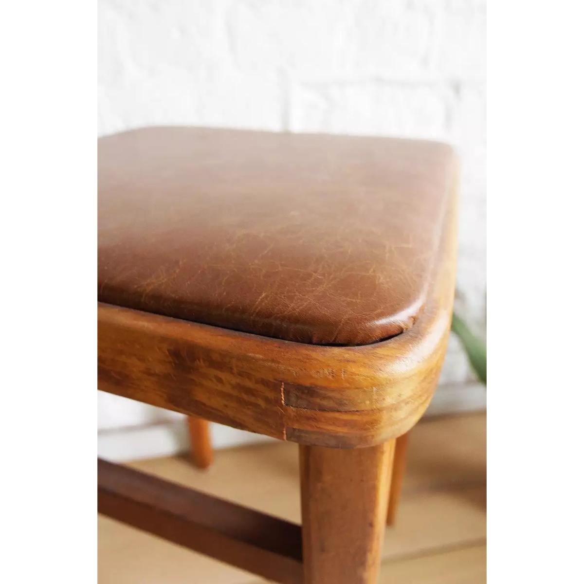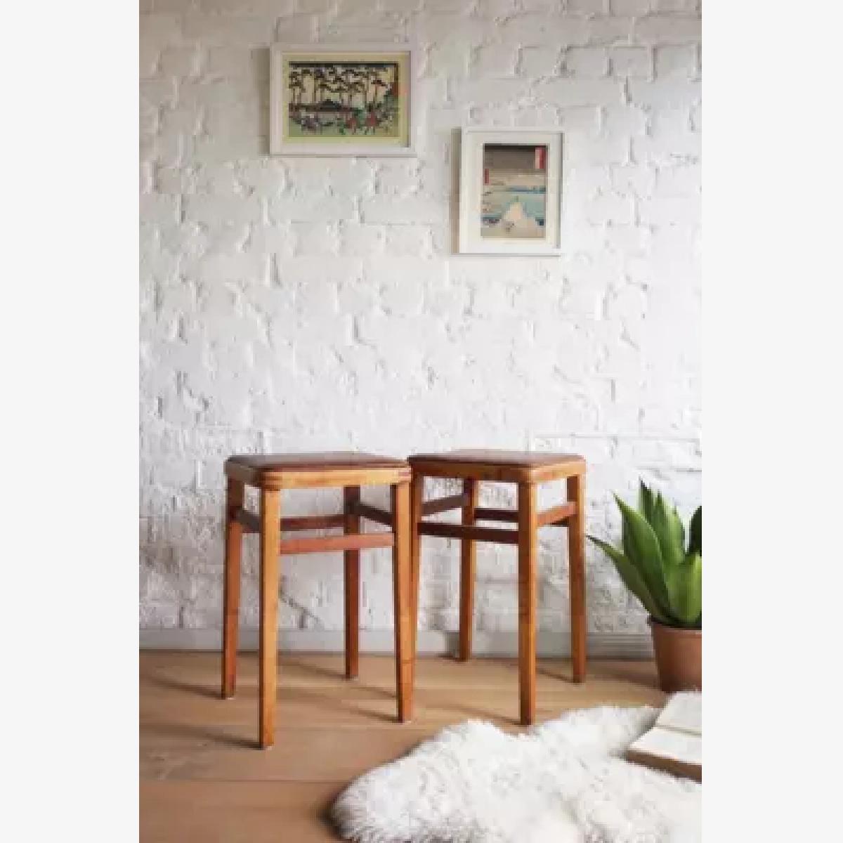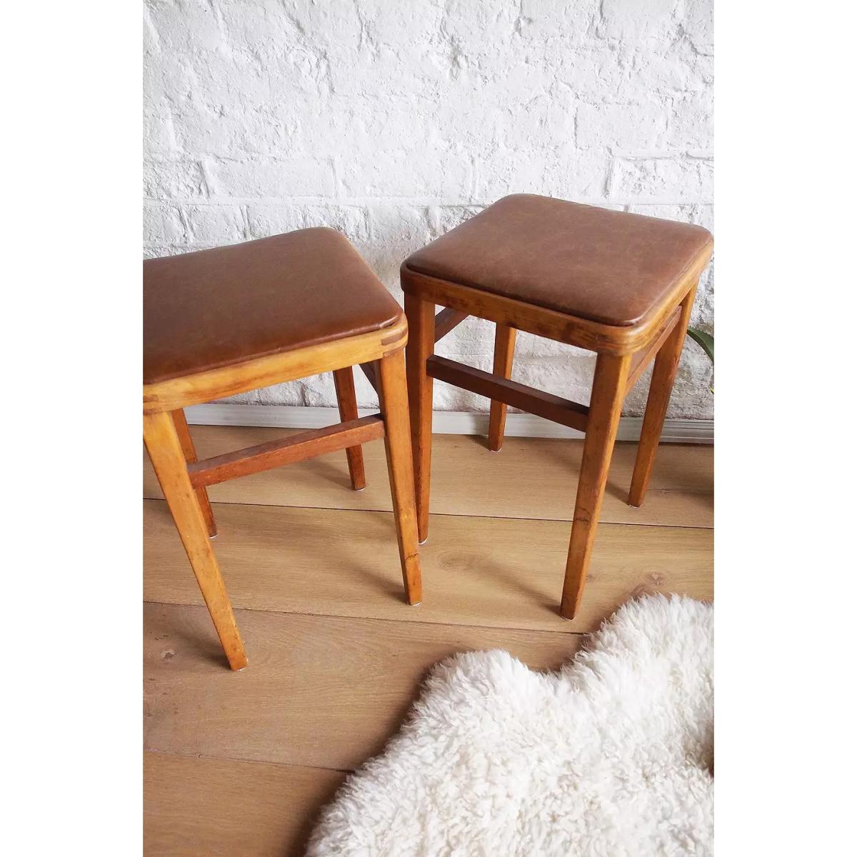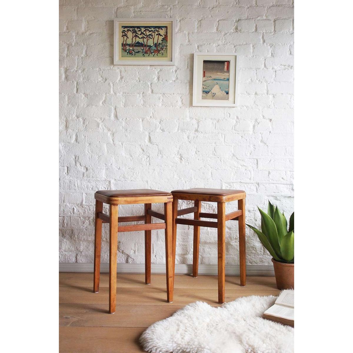 A pair of vintage mid-century kitchen stools featuring leather upholstered seat and aged wood frame. An instant upgrade to your midcentury-inspired homeware approach. Use as extra seats or as a stands for your favorite ferns. *Please note furniture items currently cannot be shipped to Northern Ireland or The Republic of Ireland. Delivery of large furniture items may take 1-2 weeks and are therefore not eligible for Next Day Delivery. All Urban Renewal Vintage homeware is non-returnable. * **About Urban Renewal Vintage** \- One-of-a-kind pieces sourced by the vintage furniture experts at Originall Creations \- Authentic, pre-loved vintage pieces which are sold as seen and therefore may show signs of wear and tear \- This item will be dispatched by the vendor and may take longer to process than other items in your order **Size** \- H: 57cm x W: 35cm x D: 35cm