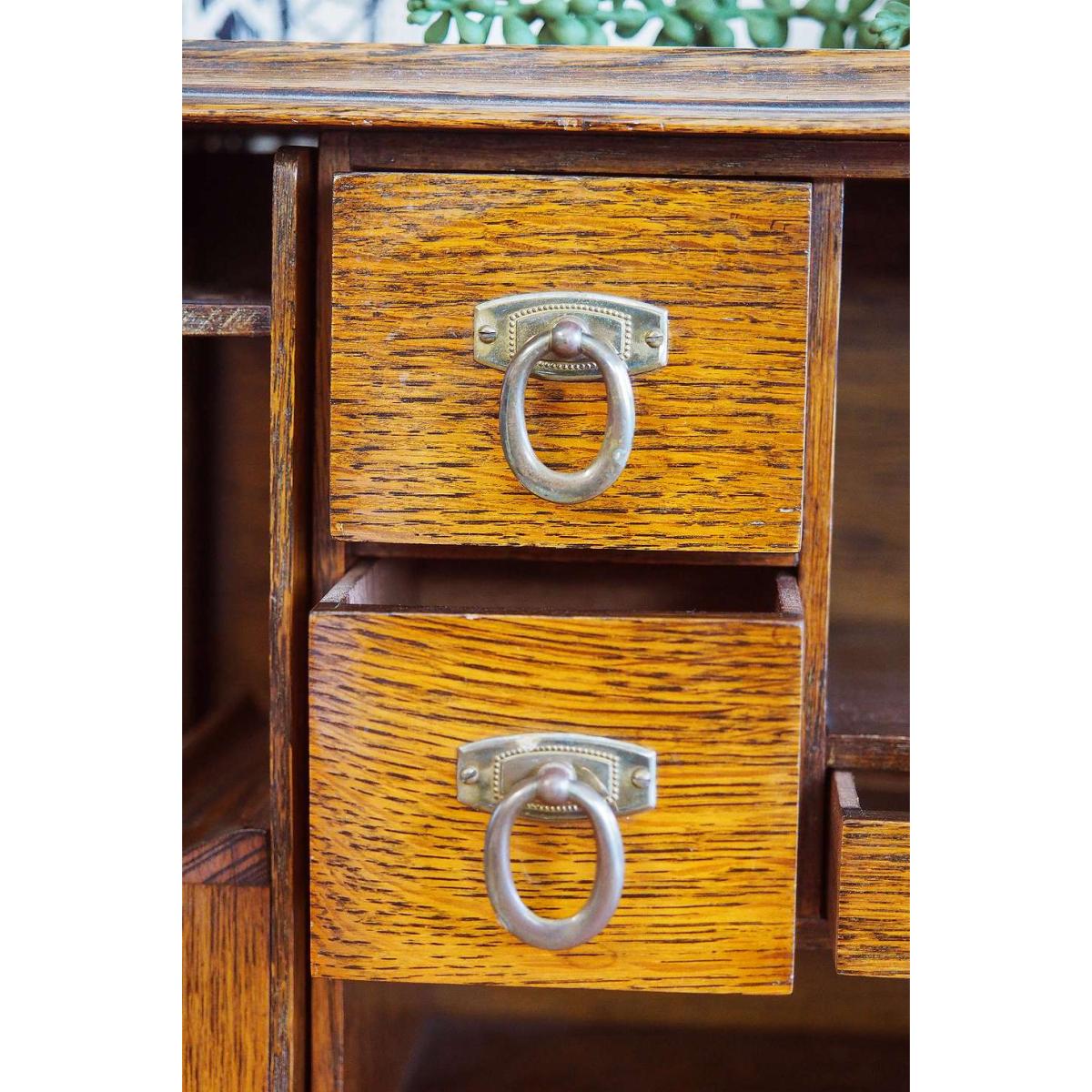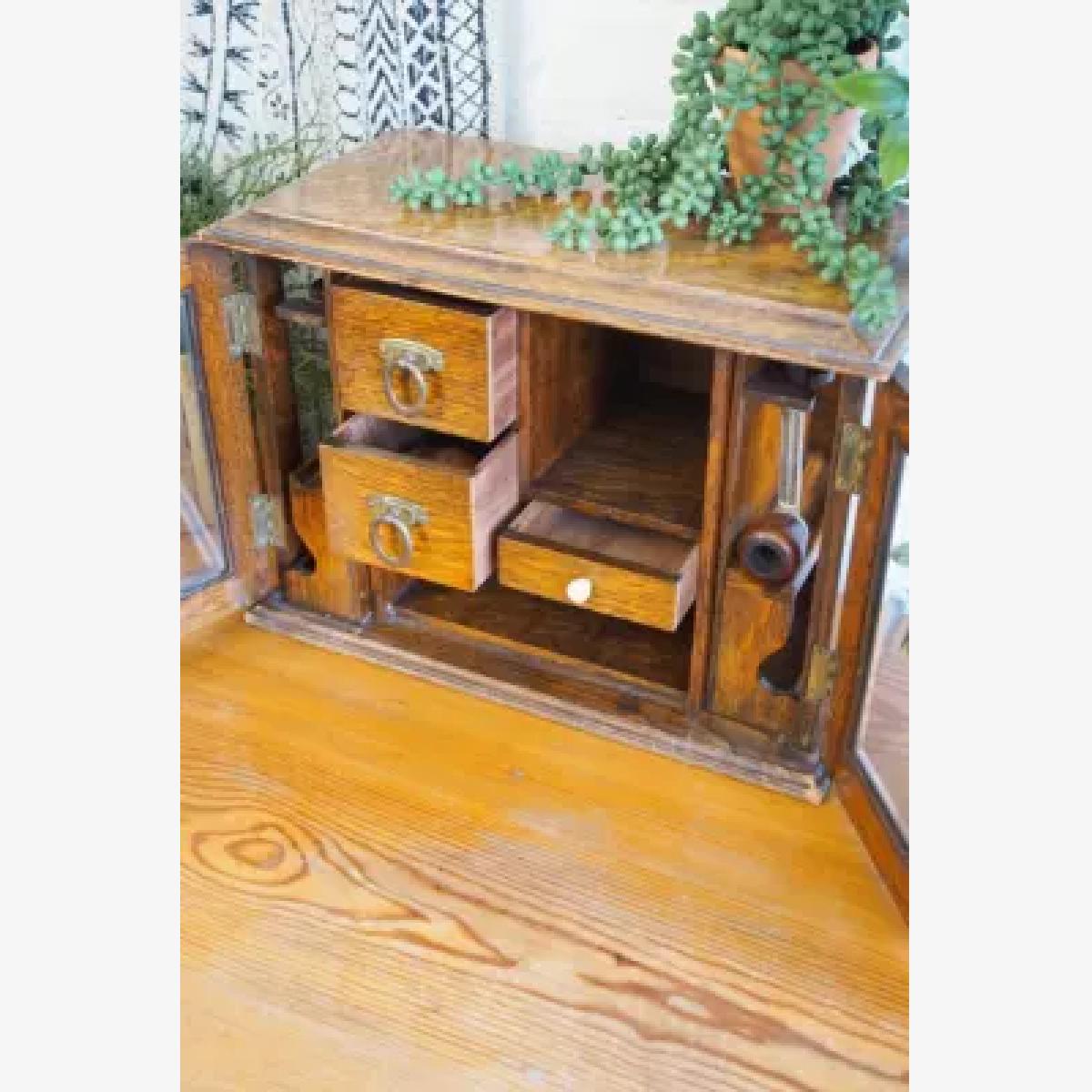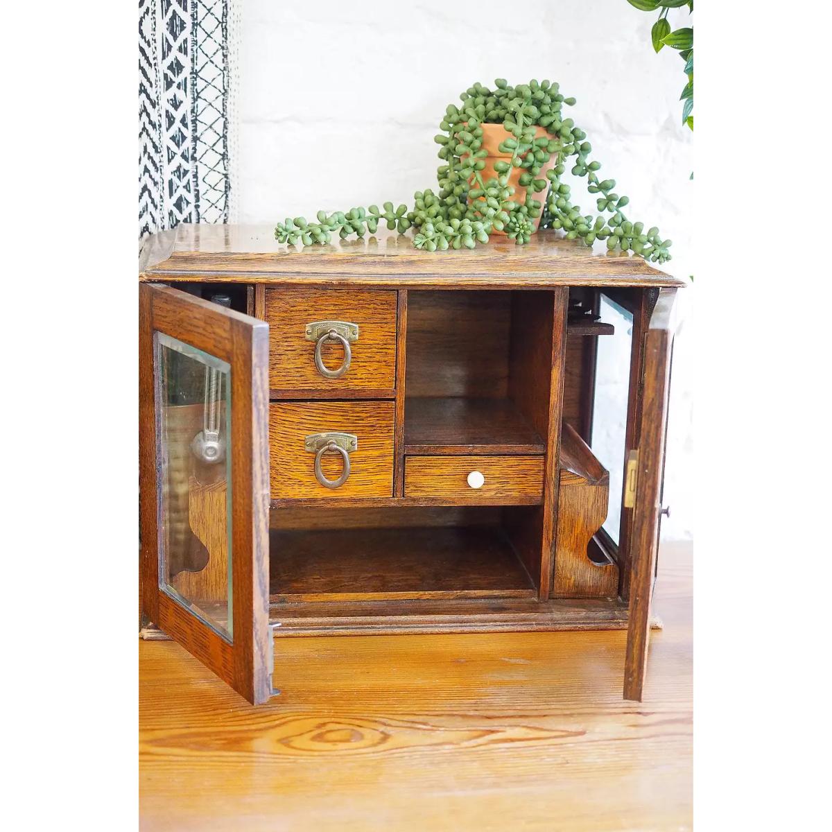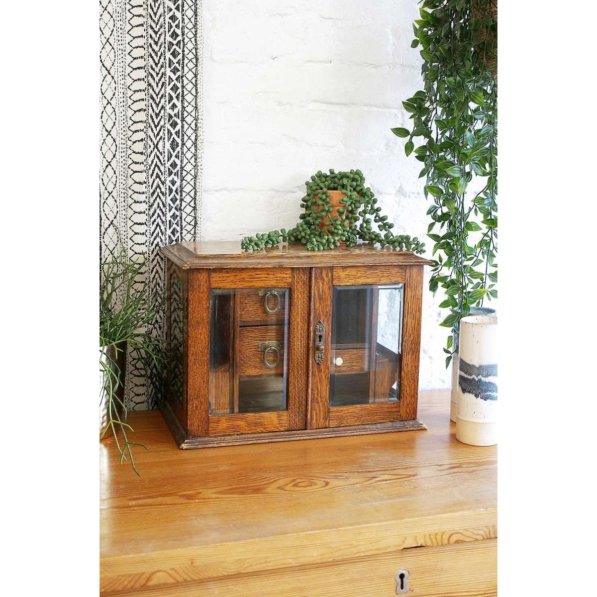 Polished oak smokers cabinet that'll add a vintage feel to your living space. Sturdy wooden construction with two glass-paneled doors, functional shelves with brass handles and ornate carved-out column details. *Please note: This item is not eligible for Next Day Delivery. For any large furniture, delivery can take between 1-2 weeks and we cannot deliver this outside of UK mainland. All Urban Renewal Vintage homeware is non-returnable. * **About Urban Renewal Vintage** \- One-of-a-kind pieces sourced by the vintage furniture experts at Originall Creations \- Authentic, pre-loved vintage pieces which are sold as seen and therefore may show signs of wear and tear \- This item will be dispatched by the vendor and may take longer to process than other items in your order **Content + Care** \- Oak, Glass \- Spot clean **Size** \- 30cm x 41cm x 23cm