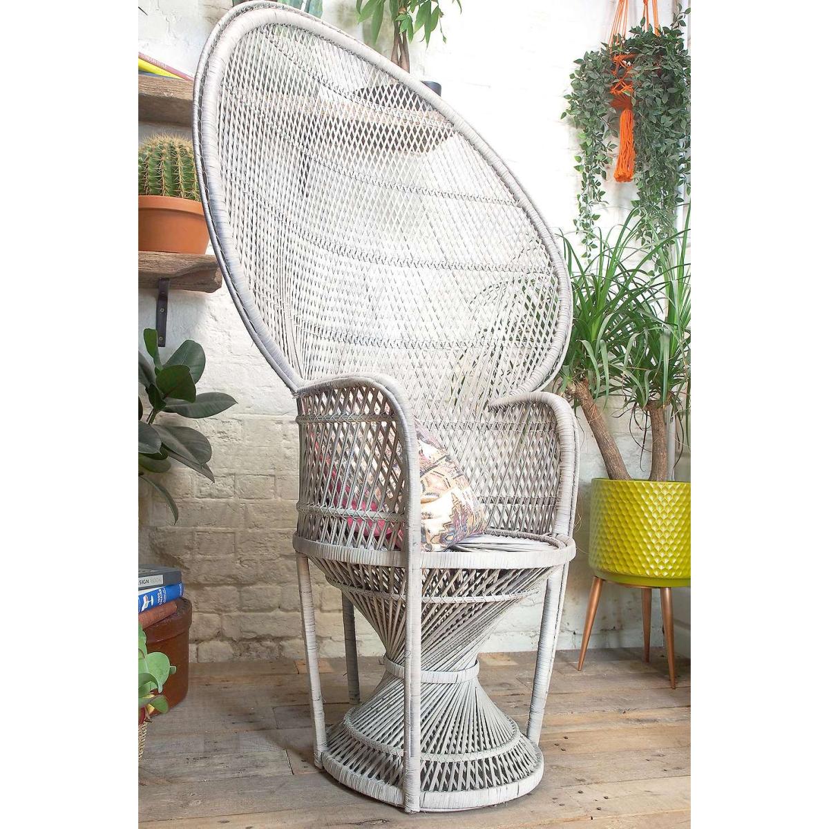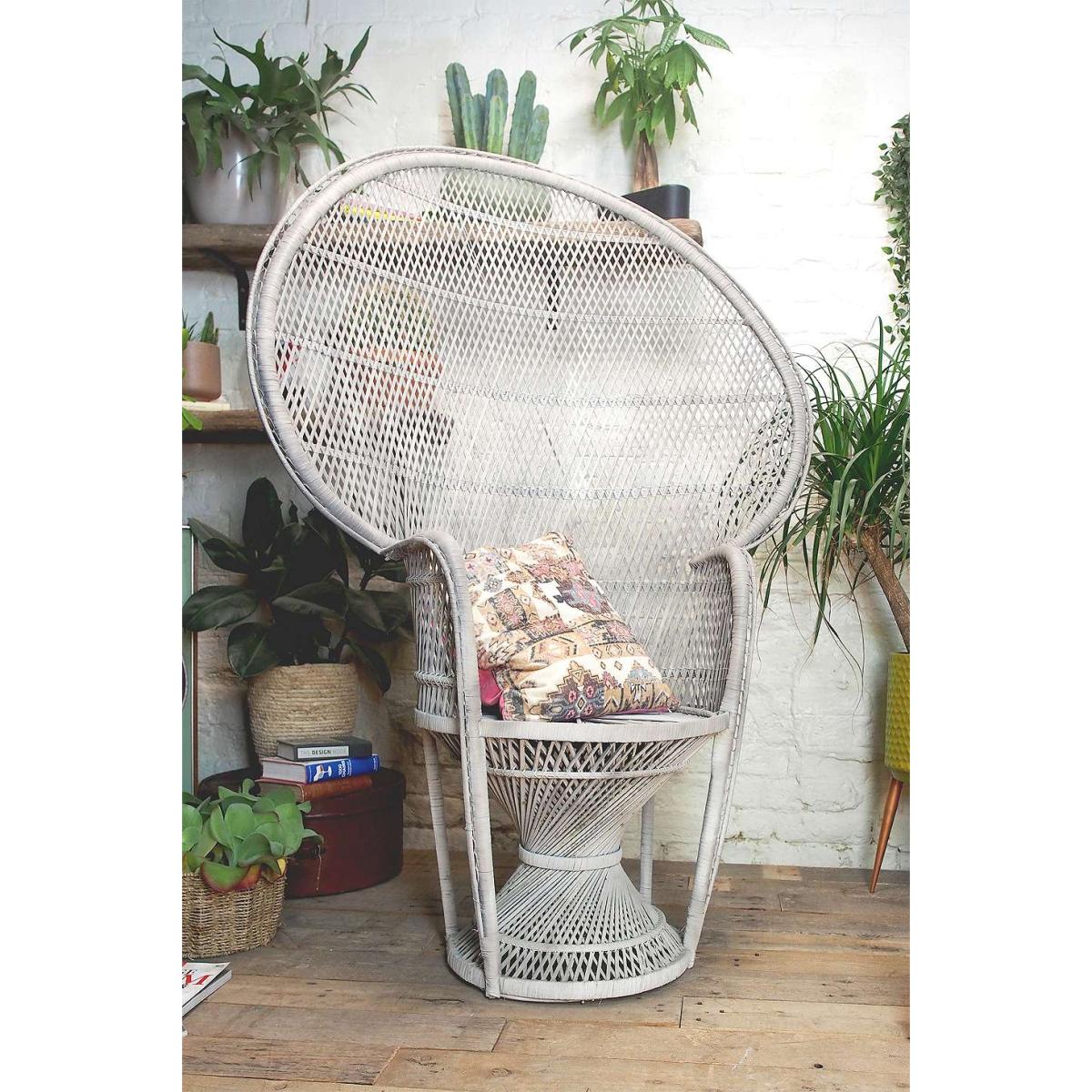 Add statement seating to your space with this woven rattan peacock chain. A one-off vintage chair dated from the 1970s/80s in a bold peacock-style shape with an oversized circular back with and rounded armrests. Topped on a twisted circular stool base, made from a steel frame construction with a textile cover and beech arm rests updated with a repaint. *Online return only. This item cannot be returned instore. Please note furniture items currently cannot be shipped to Northern Ireland or The Republic of Ireland. Delivery of large furniture items may take 1-2 weeks and are therefore not eligible for Next Day Delivery.* **About Urban Renewal Vintage** \- One-of-a-kind pieces sourced by the vintage furniture experts at Originall Creations \- Authentic, pre-loved vintage pieces which are sold as seen and therefore may show signs of wear and tear \- This item will be dispatched by the vendor and may take longer to process than other items in your order **Content + Care** \- Steel, Manmade Textile, Beech wood **Size** \- H:154cm x D:110cm x W:55cm