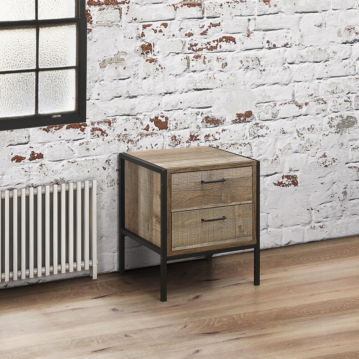 Constructed with a black metal frame and wood-effect panels, the Urban Rustic 2 Drawer Bedside unit is perfect for adding a hint of industrial chic to any bedroom. Radiating industrial character, these bedside drawers feature 2 handy drawers ideal for storing away any belongings. Part of a matching furniture collection, this unit will look great both as a standalone rustic statement or as an addition to other units from the same collection.