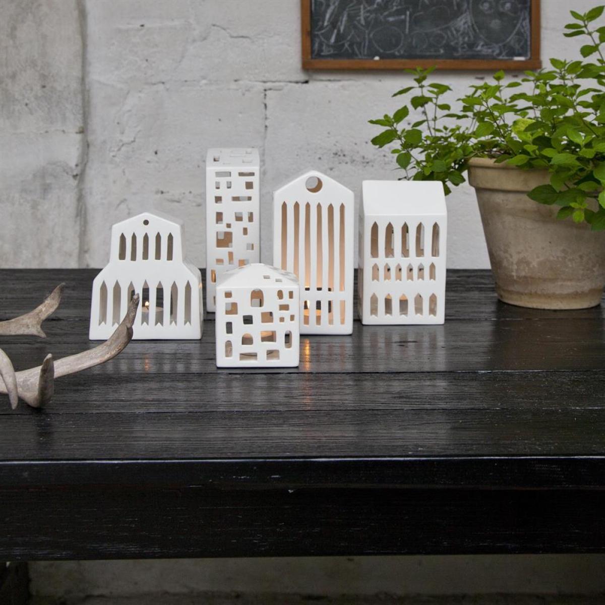 The Urbania candleholders are designed by Mette Bache and Barbara Bendix Becker for Kähler. The candleholders are made of ceramics and are all shaped as different houses with a modern expressions. The flickering light and the shadows, that are cast from the inside of the candleholders, create a beautiful effect and definitely bring a coziness to any room. The Urbania collection consists of five houses: an apartment house, a city house, a church, a pantheon and a basilica church. The candleholders are sold separately.