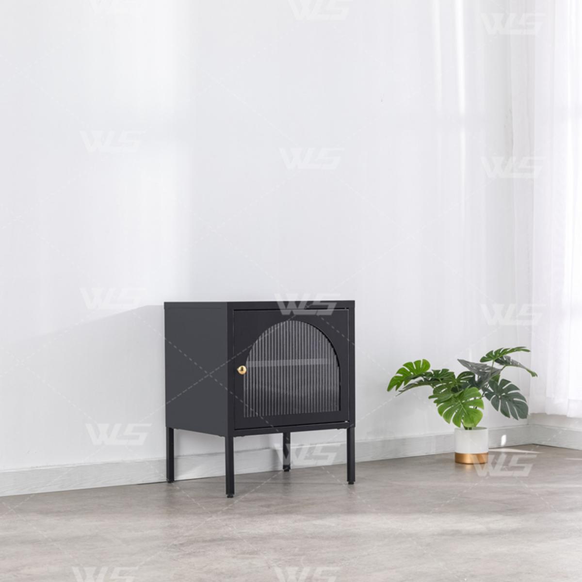 Our Urbi metal bedside table with door perfectly blends form and function in a stylish modern design that nods to retro industrial art deco styles. The powder-coated metal bedside cabinet features a hinged door, gold doorknob and arched glass panel with ribbed tempered glass that adds dimension and interest. The flat top gives plenty of space for bedside essentials. Inside, the single shelf allows for greater storage space to keep everything tidy. A lovely contemporary bit of bedroom storage that will suit a range of home styles. Comes with matching larger storage furniture available. Shop the Urbi range today!