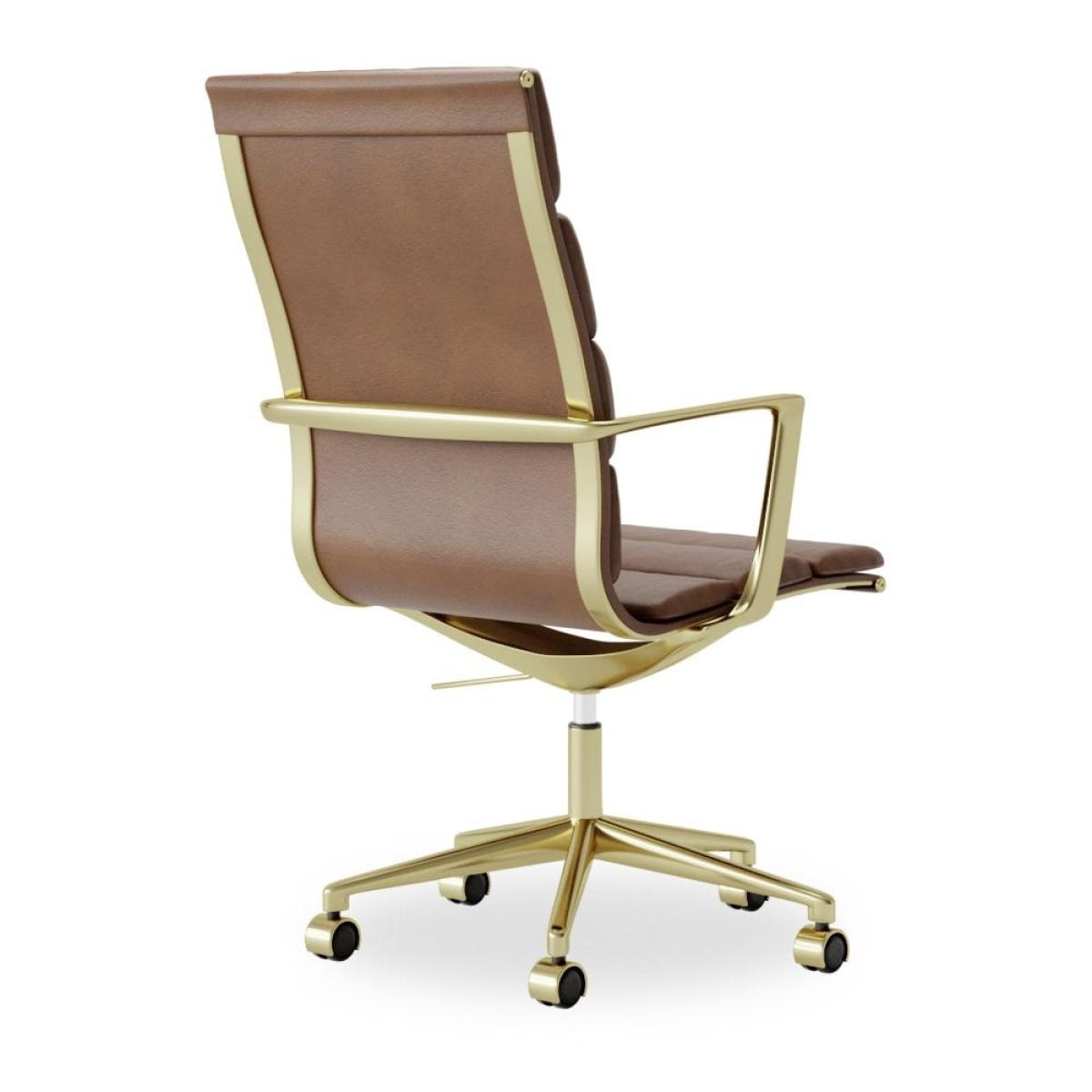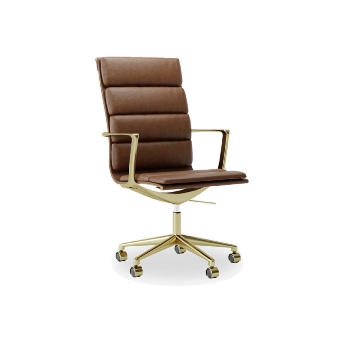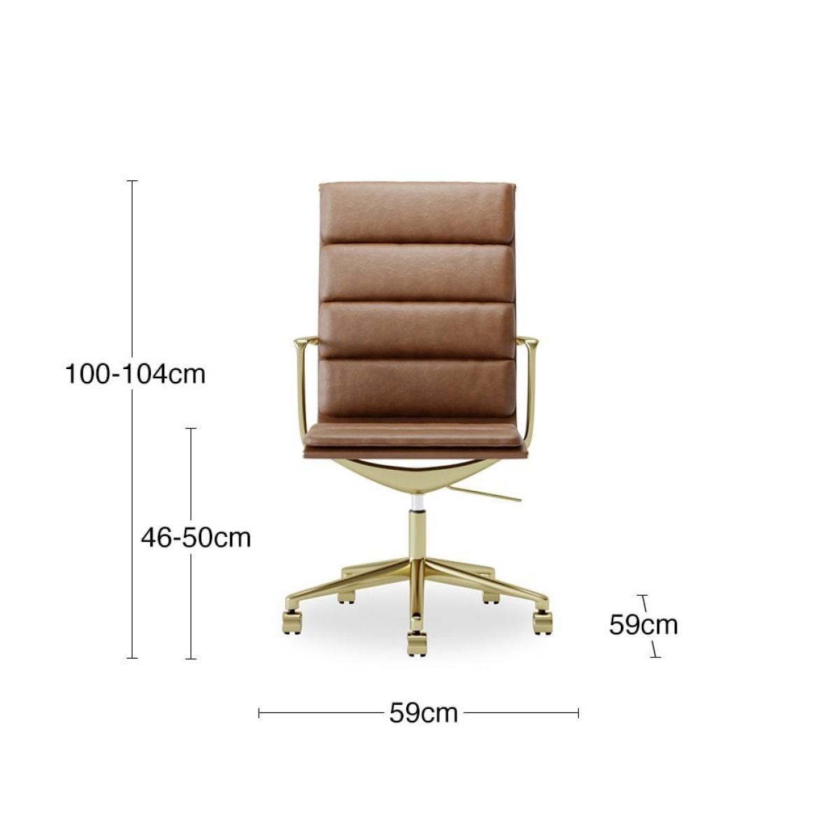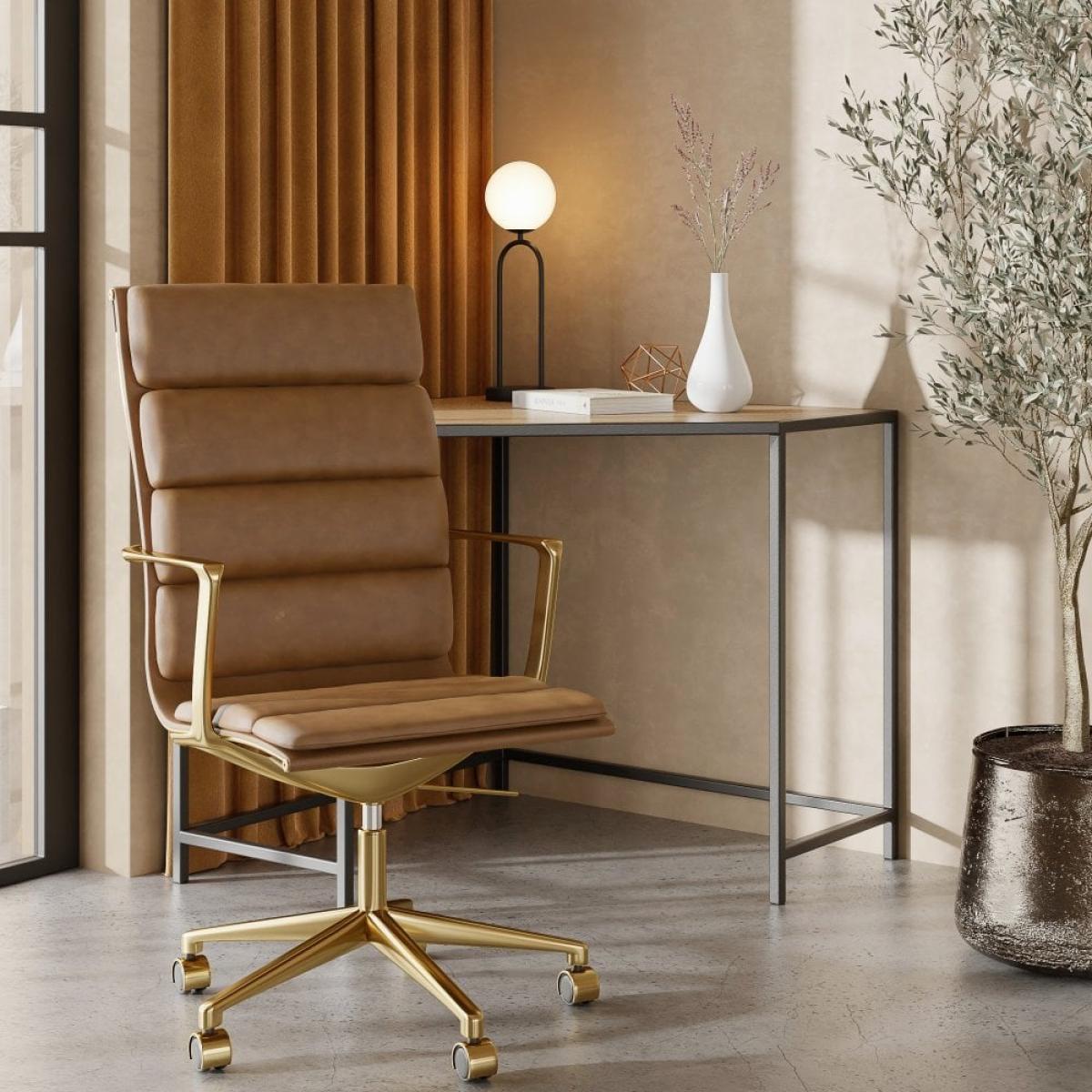 Soft padding, height adjustable, and swivel function make the Urma High Back Office Chair a stylish yet functional solution for your work from home setup. With a sleek brass metal frame upon five wheels and soft vintage tan faux leather upholstery with padded seat and backrest, the Urma Range is a modern sleek design.