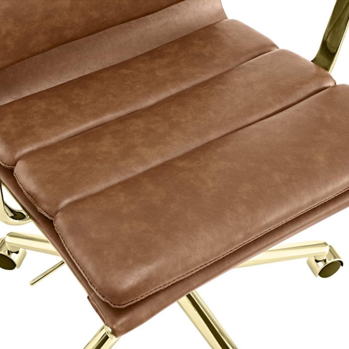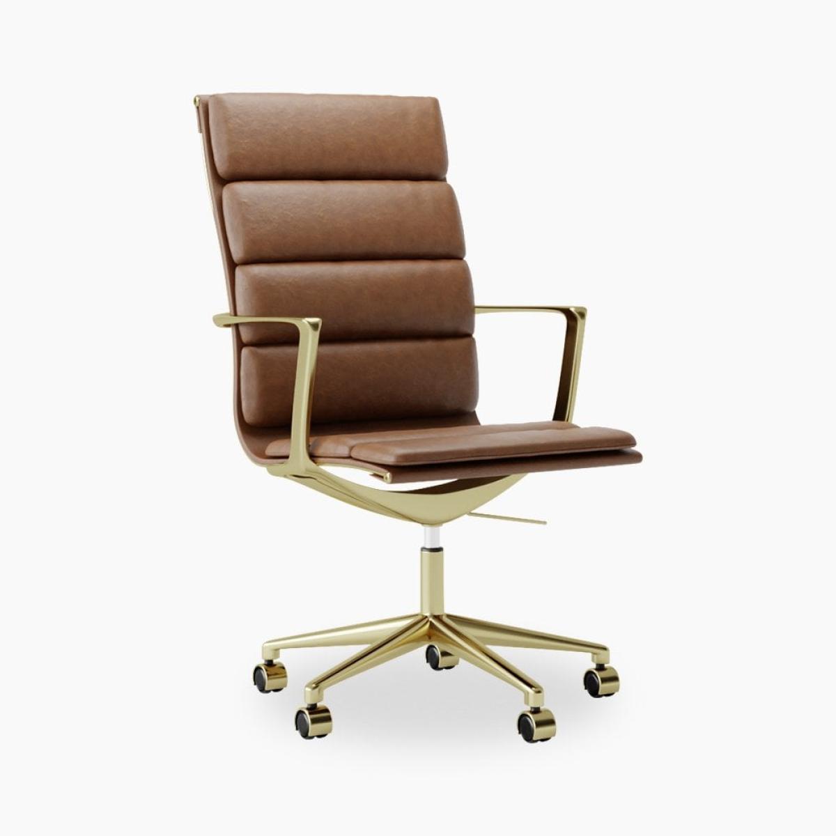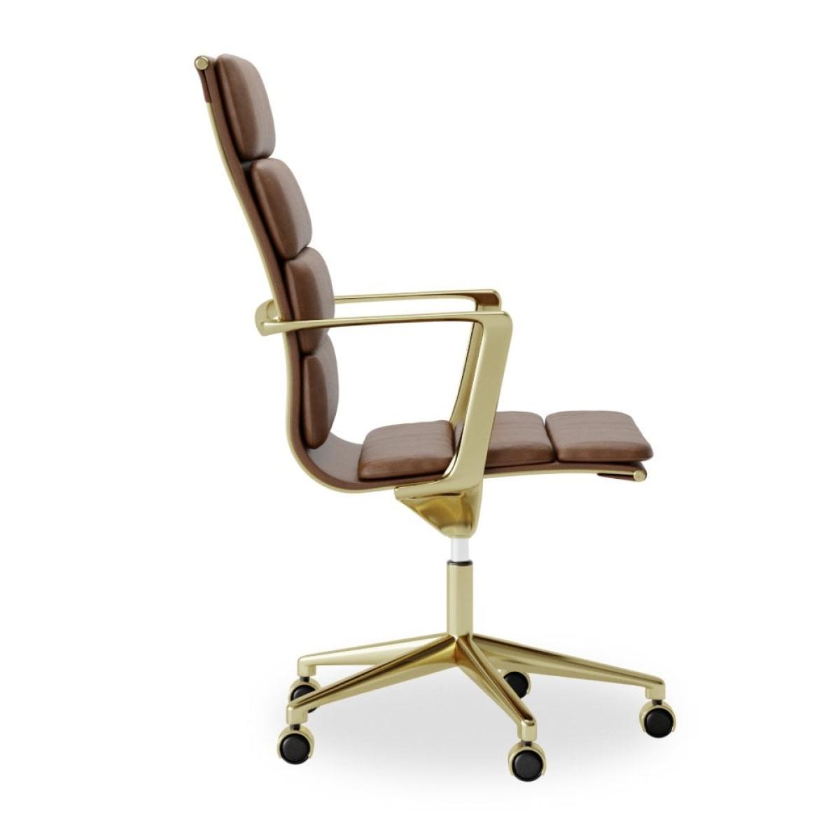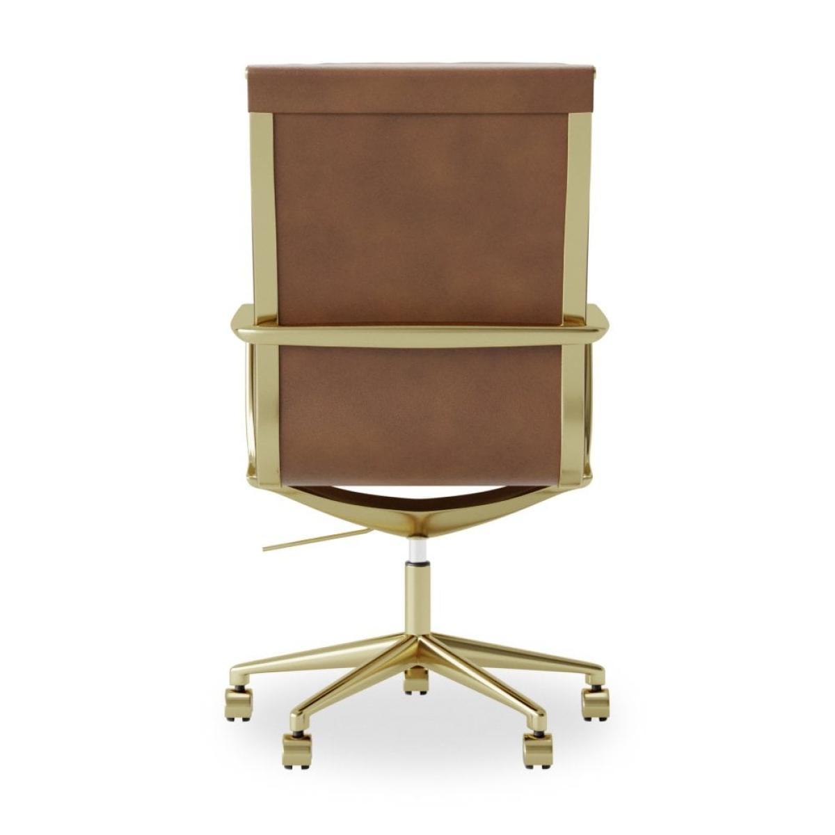 Soft padding, height adjustable, and swivel function make the Urma High Back Office Chair a stylish yet functional solution for your work from home setup. With a sleek brass metal frame upon five wheels and soft vintage tan faux leather upholstery with padded seat and backrest, the Urma Range is a modern sleek design.