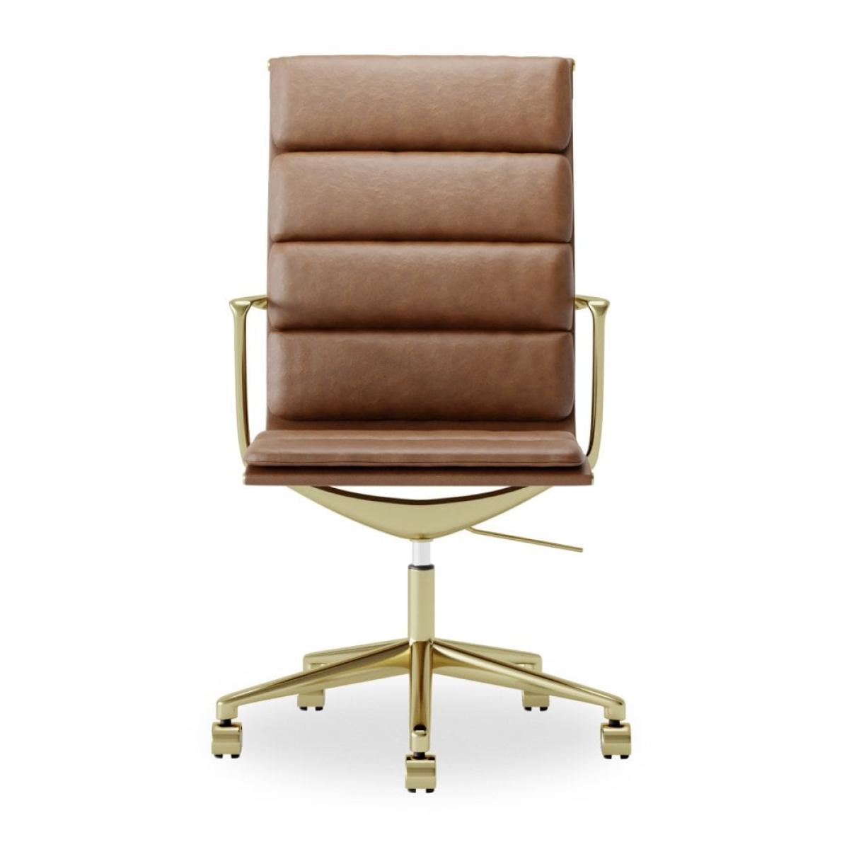 I love this chair’s vintage-inspired vibe, which makes it a statement piece that elevates any office setup. Its warm tan leather and brass details lend a touch of sophistication, perfect for complementing both modern and classic interiors. It works well in spaces that mix industrial with mid-century or eclectic styles, bringing a luxe yet approachable feel. For styling tips, pair it with a sleek wooden desk and brass or gold accents, and consider adding textured throws or cushions in neutral tones to soften the look. Practical for home offices or creative workspaces, this chair balances comfort with visual interest, making it a stylish upgrade for any workspace.