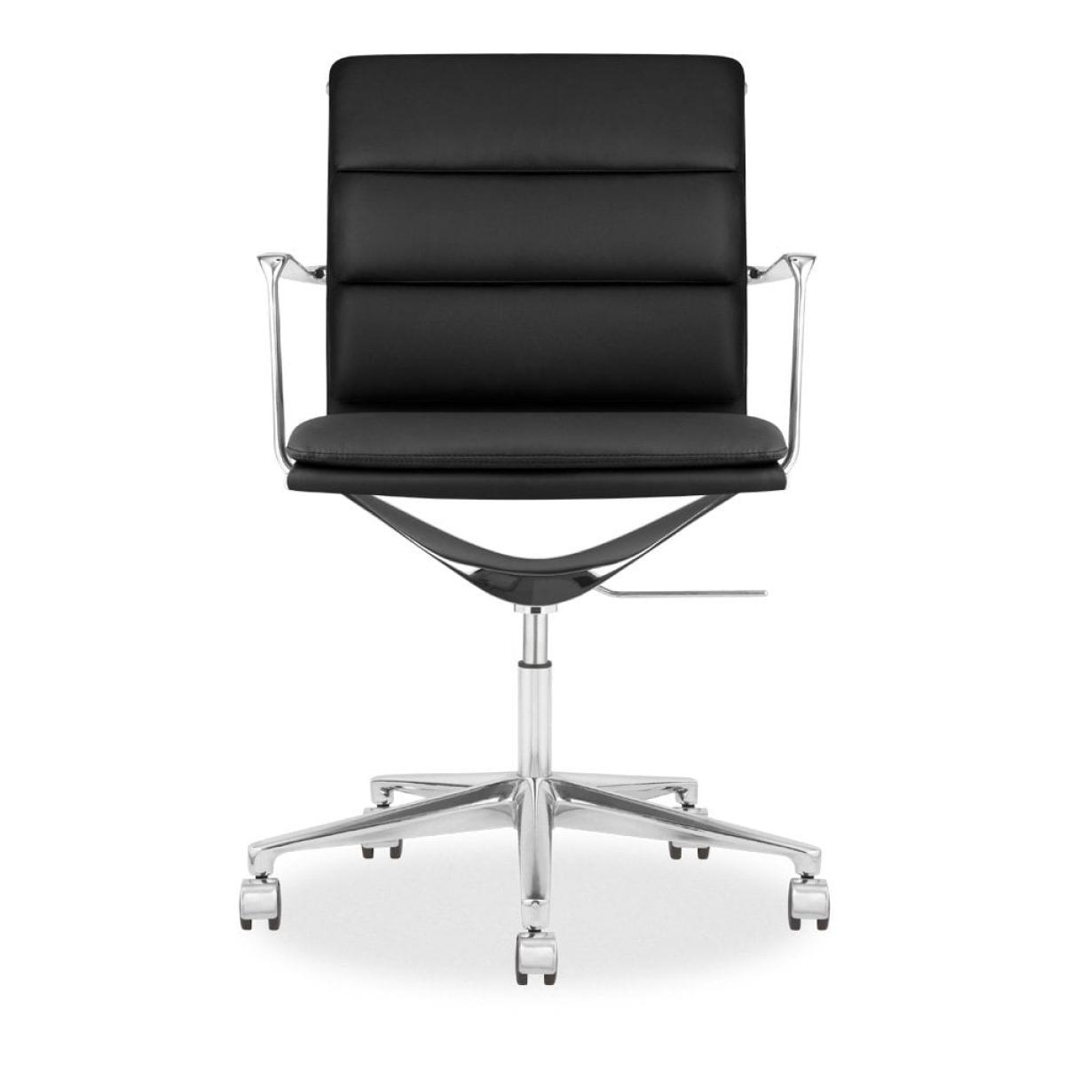 Soft padding, height adjustable, and swivel function make the Urma Low Back Office Chair a stylish yet functional solution for your work from home setup. With a sleek chrome metal frame upon five wheels and soft black faux leather upholstery with padded seat and backrest, the Urma Range is a modern sleek design.