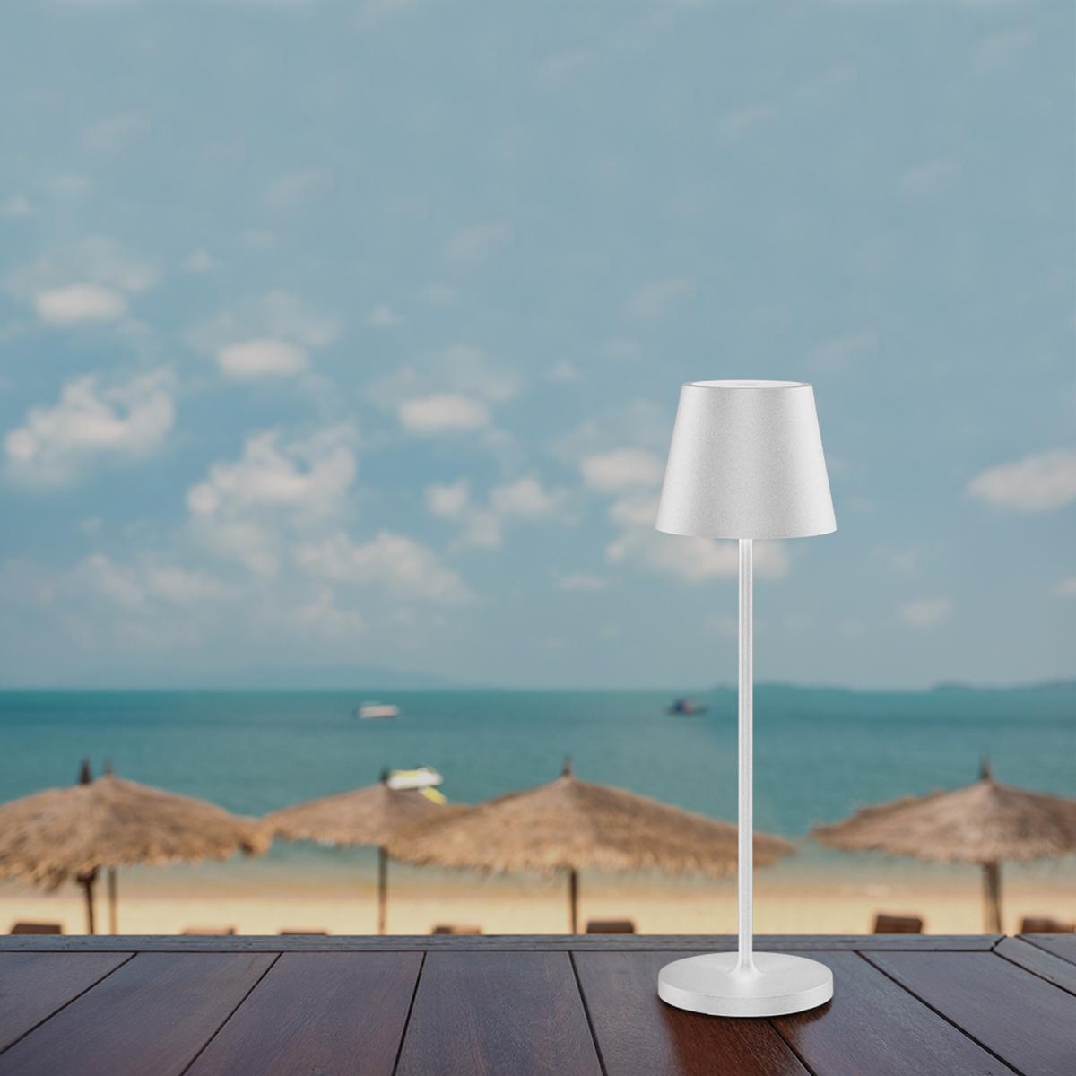 Create a stunning look and a great atmosphere with this rechargeable table lamp, which can be used in any room or with its IP54 rating, even outside. This round portable light enhances every space allowing you to move it around with freedom. It can also be used in hotels, bars, restaurants and on boats. It has fantastic durability and a contemporary design which fits into any environment. Just touch the top of the lamp to turn it on and off or hold down to adjust the brightness.