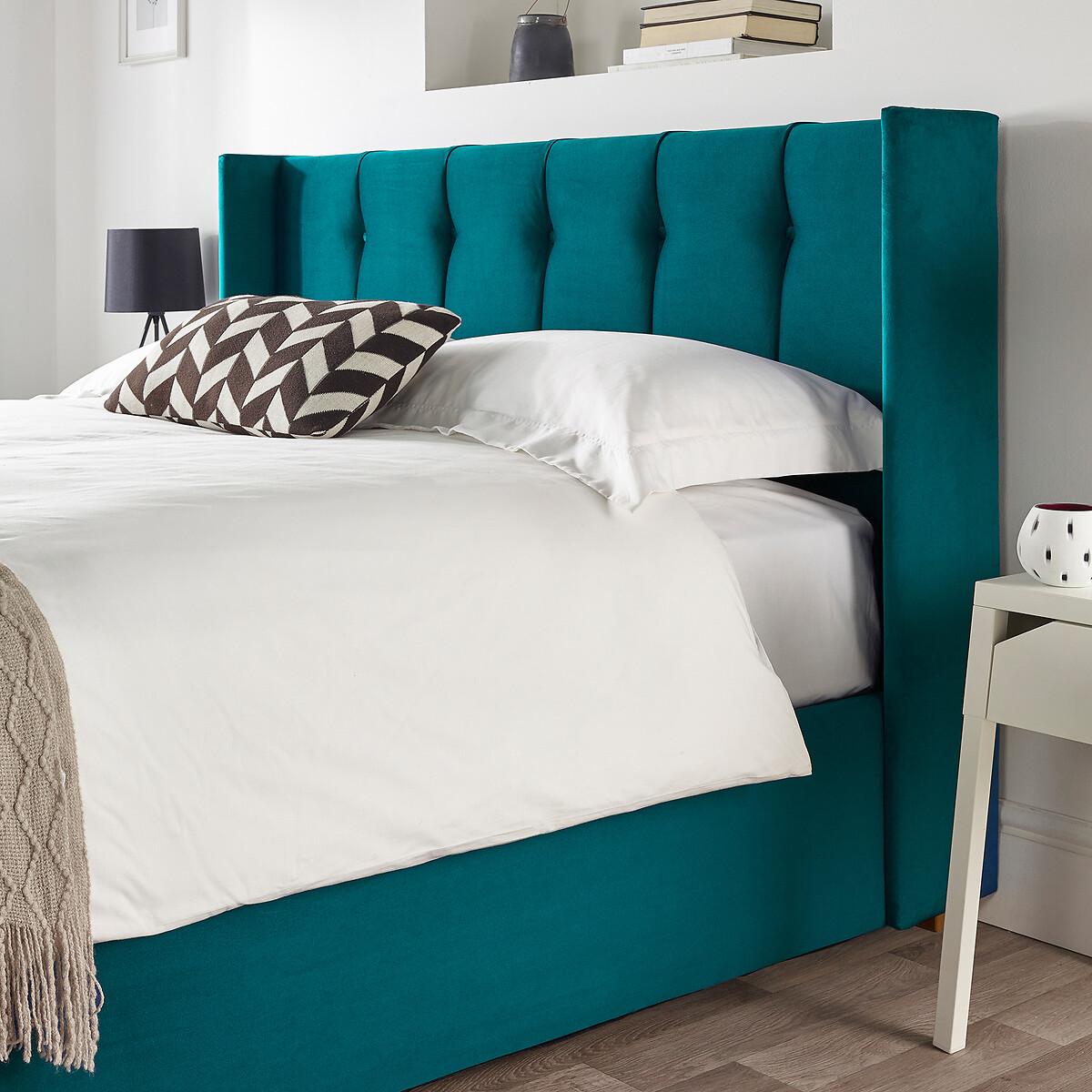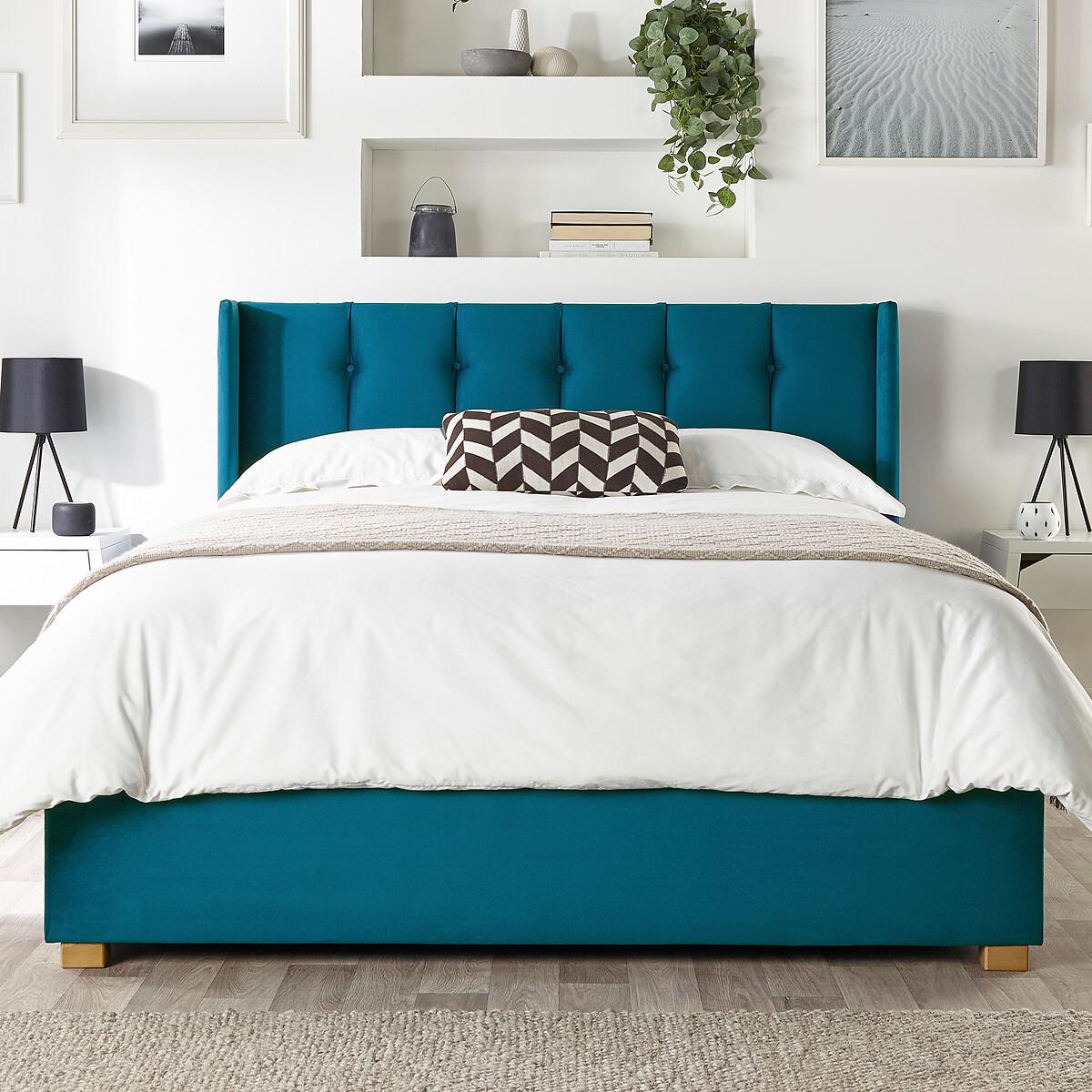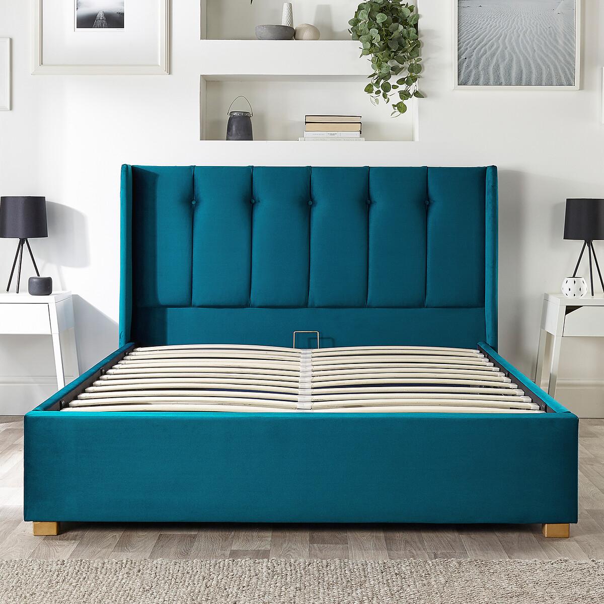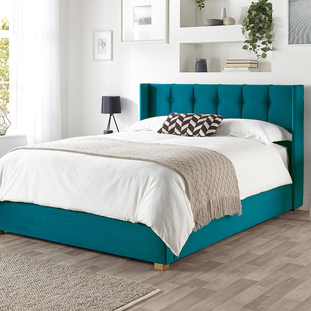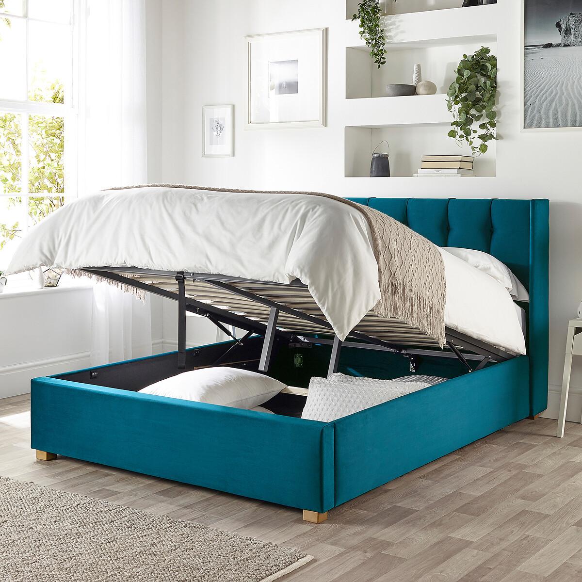 Our Catherine Lansfield Soho Ottoman Bed is a stylish storage bed manufactured in the UK and upholstered in a sumptuous velvet. The hand upholstered tufted headboard features deep padding and a gorgeous, winged headboard with a vertical buttoned design for an extra touch of luxury. A lift-away mechanism powered by strong gas pistons reveal ample storage space that can be easily accessed with minimal effort, perfect for storing extra bedding and accessories. Quality sprung slats form a base designed to improve comfort and mattress lifespan. Hand-turned curving wood feet create an elegant finish. Product details:• Ottoman storage bed• Hand upholstered headboard with stylish vertical buttoned design and winged side panels• Upholstered in a luxurious velvet fabric with a soft lustre and plush texture• End-lift mechanism for convenient access• Large storage area with fabric dust protection sheet base• Durable gas pistons ensure the storage area remains securely open for hands-free use• Solid hand-turned hardwood feet• Sprung slatted base• Foam fillings• Made to order and expertly hand finished right here in the UK • Assembly required (2 person recommended)• Mattress not included• 12 month manufacturers warranty• Care advice:Wipe clean with a soft cloth Composition • Upholstery - Plush Velvet (100% polyester)• Fillings - Foam • Frame - Chipboard, Plywood, MDF, Steel. This product will be dispatched by one of our trusted suppliers. You’ll be contacted by their selected courier about your delivery. Please note this item will be delivered to your doorstep. Please note that this item cannot be delivered to the Offshore Islands, Northern Ireland or the Republic of Ireland. Product Dimensions Single • Total Dimensions - H112cm x W100cm x L209cm• Storage Area Dimensions - W94 cm x L193 cm x H26 cm • Suitable for use with standard single mattresses (90cm x 190cm)Small Double • Total Dimensions - H112cm x W130cm x L209cm• Storage Area Dimensions - W122 cm x L193 cm x H26 cm • Suitable for use with standard small double mattresses (120cm x 190cm)Double • Total Dimensions - H112cm x W147cm x L209cm• Storage Area Dimensions - W141 cm x L193 cm x H26 cm • Suitable for use with standard double mattresses (135cm x 190cm)King• Total Dimensions - H112cm x W160cm x L219cm• Storage Area Dimensions - W154cm x L204 cm x H26 cm • Suitable for use with standard king mattresses (150cm x 200cm)Super King• Total Dimensions - H112cm x W190cm x L219cm• Storage Area Dimensions - W184 cm x L204 cm x H26 cm • Suitable for use with standard king mattresses (180cm x 200cm)Other dimensions• Headboard Height - 110 cm• Footboard Height: 30cm• Underbed Clearance: 5cm• Ottoman lift mechanism functions with a mattress with weight of up to 60 kg. Package DimensionsSingle:. Parcel 1 - 140cm x 113cm x 12cm, Weight: 12kg Parcel 2 - 212cm x 32cm x 19cm, Weight: 13kg Parcel 3 - 240cm x 180cm x 12, Weight: 18kg. Small Double:Parcel 1 - 140cm x 113cm x 12cm, Weight: 19kg Parcel 2 - 212cm x 32cm x 19cm, Weight: 17kg Parcel 3 - 240cm x 180cm x 12cm, Weight: 22kgDouble: Parcel 1 - 171cm x 113cm x 12cm, Weight: 22kg Parcel 2 - 212cm x 32cm x 19cm, Weight: 18kg Parcel 3 - 240cm x 180cm x 12cm, Weight: 23kgKing:. Parcel 1 - 171cm x 113cm x 12cm, Weight: 27kg Parcel 2 - 212cm x 32cm x 19cm, Weight: 22kg Parcel 3 - 240cm x 180cm x 12cm, Weight: 25kg Super King:Parcel 1 - 201cm x 113cm x 12cm, Weight: 30kg Parcel 2 - 212cm x 32cm x 19cm, Weight: 25kg Parcel 3 - 240cm x 180cm x 12cm, Weight: 27kg