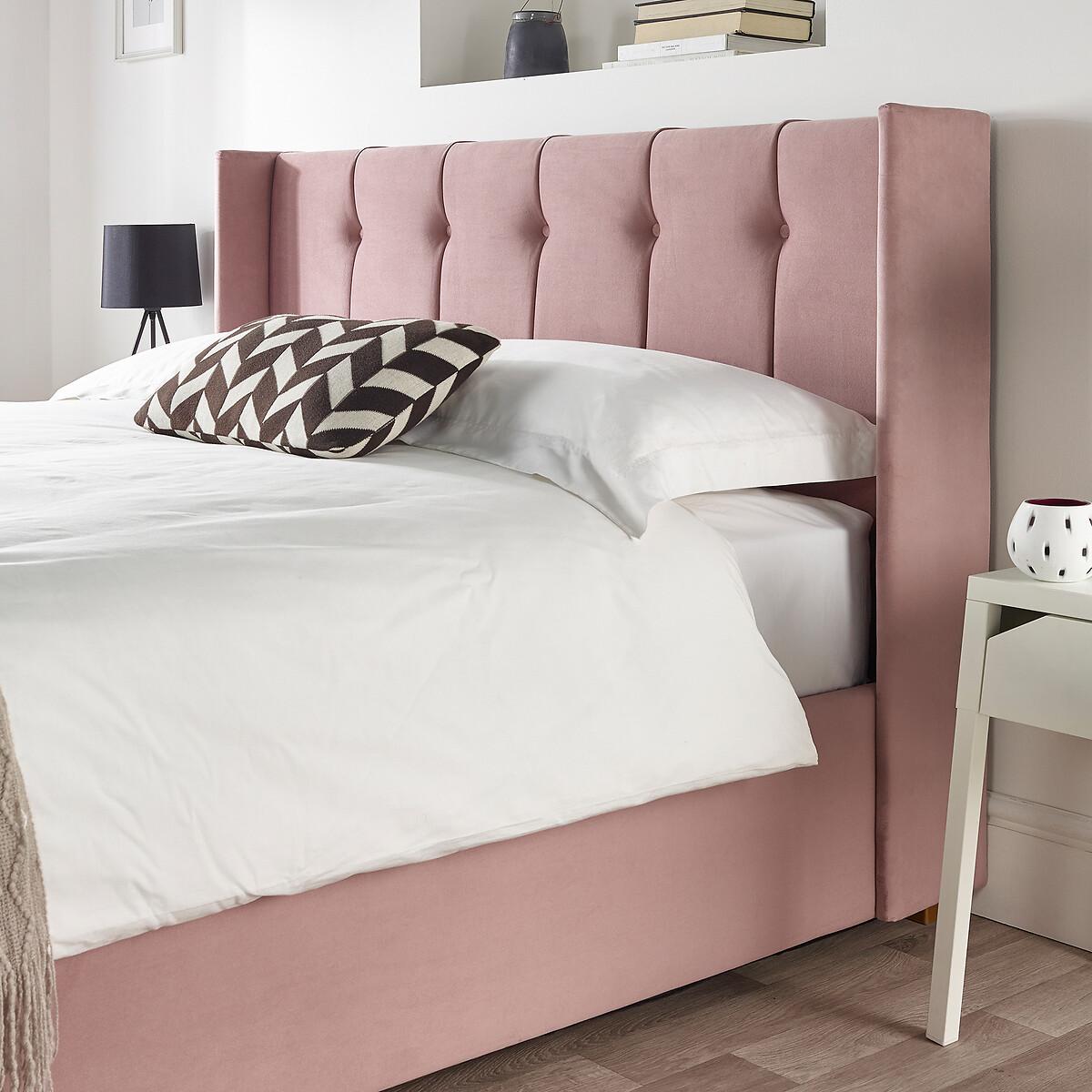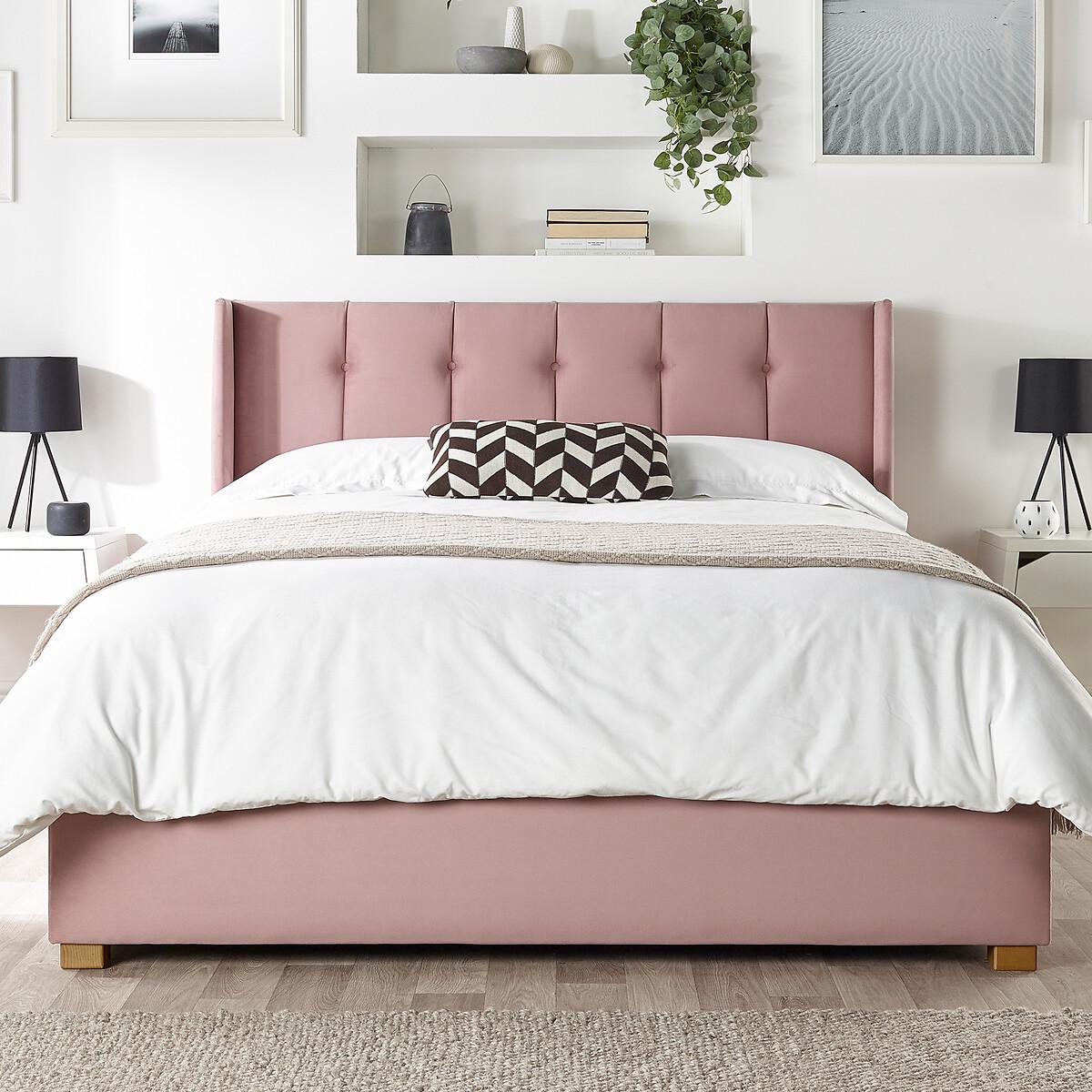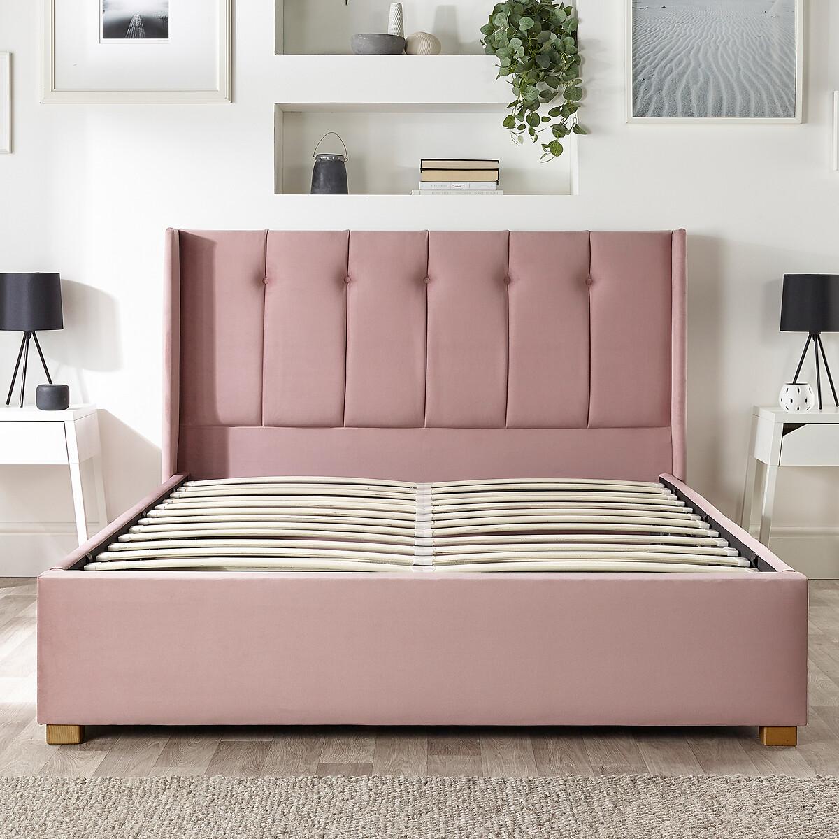 Our Catherine Lansfield Soho Ottoman Bed is a stylish storage bed manufactured in the UK and upholstered in a sumptuous velvet. The hand upholstered tufted headboard features deep padding and a gorgeous, winged headboard with a vertical buttoned design for an extra touch of luxury. A lift-away mechanism powered by strong gas pistons reveal ample storage space that can be easily accessed with minimal effort, perfect for storing extra bedding and accessories. Quality sprung slats form a base designed to improve comfort and mattress lifespan. Hand-turned curving wood feet create an elegant finish. Product details:• Ottoman storage bed• Hand upholstered headboard with stylish vertical buttoned design and winged side panels• Upholstered in a luxurious velvet fabric with a soft lustre and plush texture• End-lift mechanism for convenient access• Large storage area with fabric dust protection sheet base• Durable gas pistons ensure the storage area remains securely open for hands-free use• Solid hand-turned hardwood feet• Sprung slatted base• Foam fillings• Made to order and expertly hand finished right here in the UK • Assembly required (2 person recommended)• Mattress not included• 12 month manufacturers warranty• Care advice:Wipe clean with a soft cloth Composition • Upholstery - Plush Velvet (100% polyester)• Fillings - Foam • Frame - Chipboard, Plywood, MDF, Steel. This product will be dispatched by one of our trusted suppliers. You’ll be contacted by their selected courier about your delivery. Please note this item will be delivered to your doorstep. Please note that this item cannot be delivered to the Offshore Islands, Northern Ireland or the Republic of Ireland. Product Dimensions Single • Total Dimensions - H112cm x W100cm x L209cm• Storage Area Dimensions - W94 cm x L193 cm x H26 cm • Suitable for use with standard single mattresses (90cm x 190cm)Small Double • Total Dimensions - H112cm x W130cm x L209cm• Storage Area Dimensions - W122 cm x L193 cm x H26 cm • Suitable for use with standard small double mattresses (120cm x 190cm)Double • Total Dimensions - H112cm x W147cm x L209cm• Storage Area Dimensions - W141 cm x L193 cm x H26 cm • Suitable for use with standard double mattresses (135cm x 190cm)King• Total Dimensions - H112cm x W160cm x L219cm• Storage Area Dimensions - W154cm x L204 cm x H26 cm • Suitable for use with standard king mattresses (150cm x 200cm)Super King• Total Dimensions - H112cm x W190cm x L219cm• Storage Area Dimensions - W184 cm x L204 cm x H26 cm • Suitable for use with standard king mattresses (180cm x 200cm)Other dimensions• Headboard Height - 110 cm• Footboard Height: 30cm• Underbed Clearance: 5cm• Ottoman lift mechanism functions with a mattress with weight of up to 60 kg. Package DimensionsSingle:. Parcel 1 - 140cm x 113cm x 12cm, Weight: 12kg Parcel 2 - 212cm x 32cm x 19cm, Weight: 13kg Parcel 3 - 240cm x 180cm x 12, Weight: 18kg. Small Double:Parcel 1 - 140cm x 113cm x 12cm, Weight: 19kg Parcel 2 - 212cm x 32cm x 19cm, Weight: 17kg Parcel 3 - 240cm x 180cm x 12cm, Weight: 22kgDouble: Parcel 1 - 171cm x 113cm x 12cm, Weight: 22kg Parcel 2 - 212cm x 32cm x 19cm, Weight: 18kg Parcel 3 - 240cm x 180cm x 12cm, Weight: 23kgKing:. Parcel 1 - 171cm x 113cm x 12cm, Weight: 27kg Parcel 2 - 212cm x 32cm x 19cm, Weight: 22kg Parcel 3 - 240cm x 180cm x 12cm, Weight: 25kg Super King:Parcel 1 - 201cm x 113cm x 12cm, Weight: 30kg Parcel 2 - 212cm x 32cm x 19cm, Weight: 25kg Parcel 3 - 240cm x 180cm x 12cm, Weight: 27kg