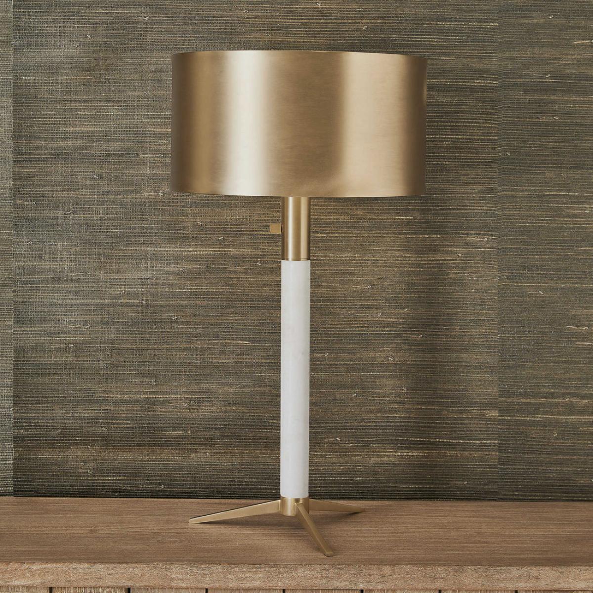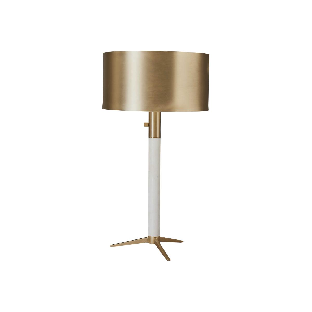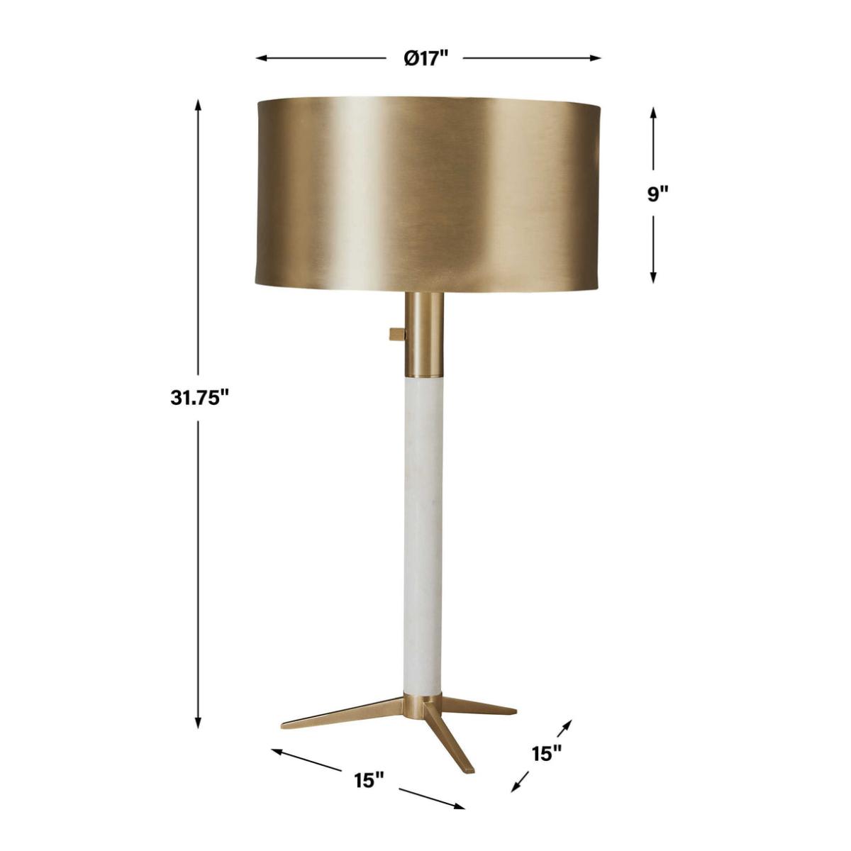 A rich, brass-finished metal shade rests atop a clean, white marble column. The interior of the shade is finished in a white enamel. Other satin brass details include the cap with rotary dimmer, and three angled feet. Black Label by Uttermost is an exclusive collection of premium upscale furniture, lighting and home accessories. Each item is designed by Uttermost's in-house team of skilled designers. Bringing you the latest in American style without compromise on quality. American design with a focus on upscale home luxury, relaxed design, generous proportions for a sophisticated luxury home. While Uttermost are focused on bringing you the most fashion-forward products in the industry, they know that good design means nothing without quality manufacturing. With this eye for detail from design to delivery you can be sure their products exceed expectations.