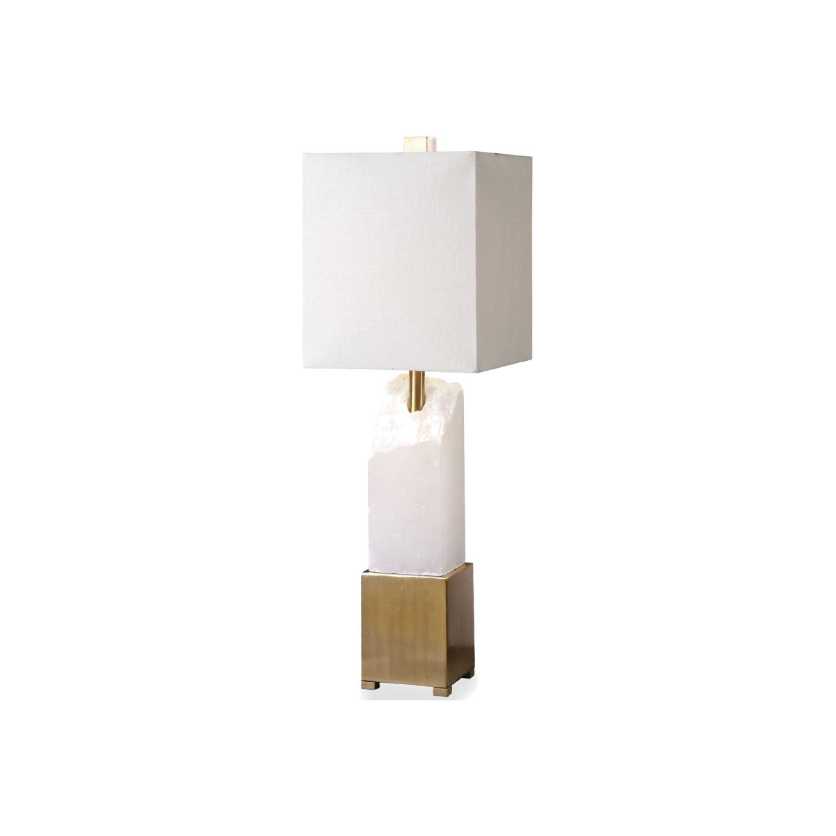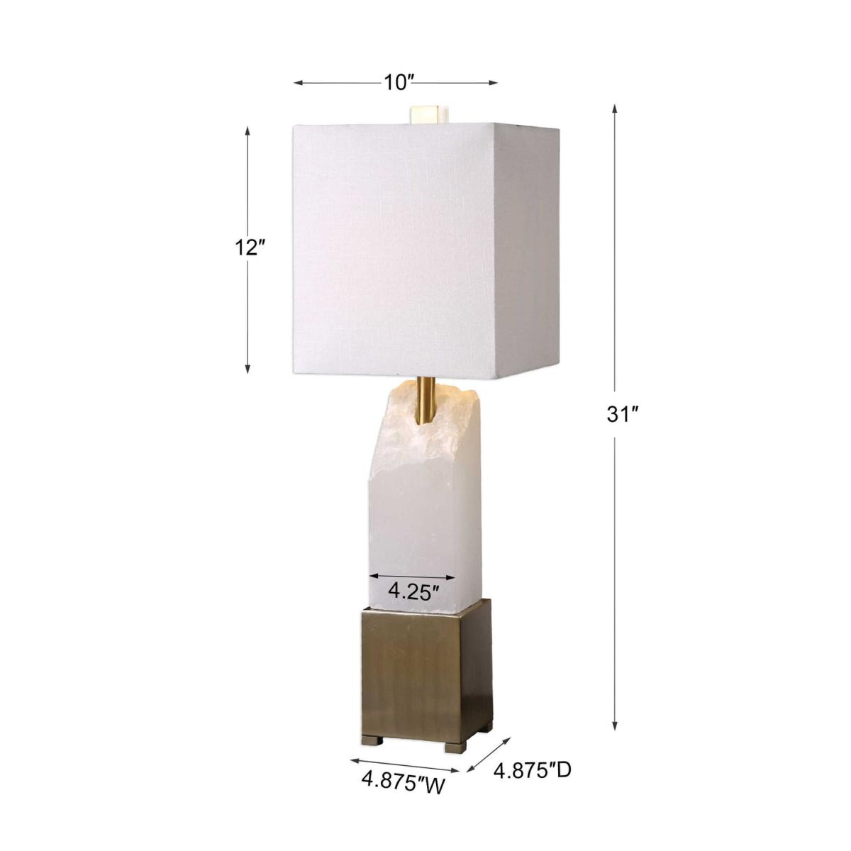 Polished frost white alabaster featuring a roughed chiseled top, accented with a steel block foot finished in plated brushed brass. The square hardback shade is a white linen fabric with natural slubbing. Black Label by Uttermost is an exclusive collection of premium upscale furniture, lighting and home accessories. Each item is designed by Uttermost's in-house team of skilled designers. Bringing you the latest in American style without compromise on quality. American design with a focus on upscale home luxury, relaxed design, generous proportions for a sophisticated luxury home. While Uttermost are focused on bringing you the most fashion-forward products in the industry, they know that good design means nothing without quality manufacturing. With this eye for detail from design to delivery you can be sure their products exceed expectations.