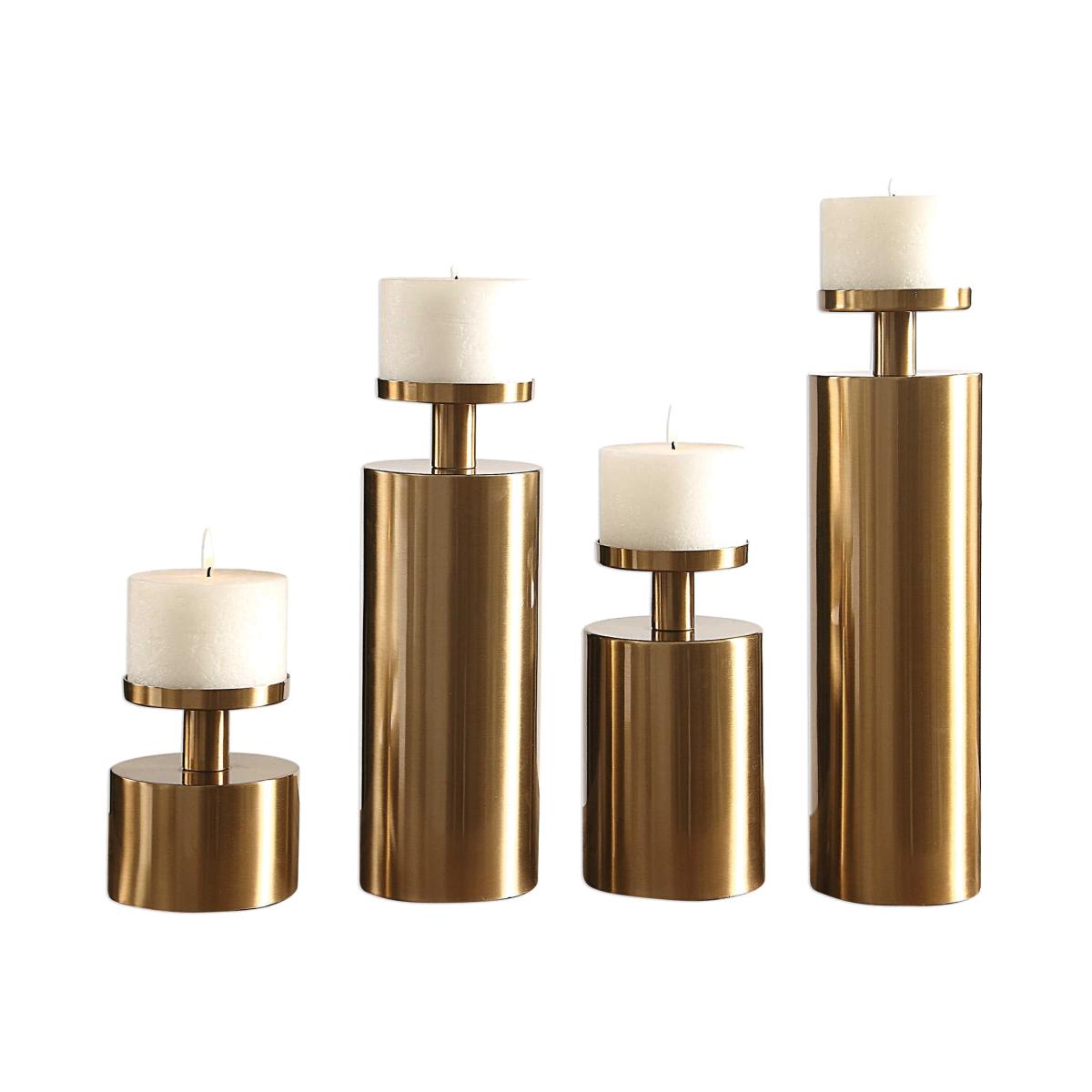 Collection of four staggered height pillar candle holders finished in a warm brass with four, 4"x 3" distressed white candles. Sizes: Sm-5x6x5, Med-5x9x5, Lg-5x13x5, XL-5x17x5 Black Label by Uttermost is an exclusive collection of premium upscale furniture, lighting and home accessories. Each item is designed by Uttermost's in-house team of skilled designers. Bringing you the latest in American style without compromise on quality. American design with a focus on upscale home luxury, relaxed design, generous proportions for a sophisticated luxury home. While Uttermost are focused on bringing you the most fashion-forward products in the industry, they know that good design means nothing without quality manufacturing. With this eye for detail from design to delivery you can be sure their products exceed expectations.