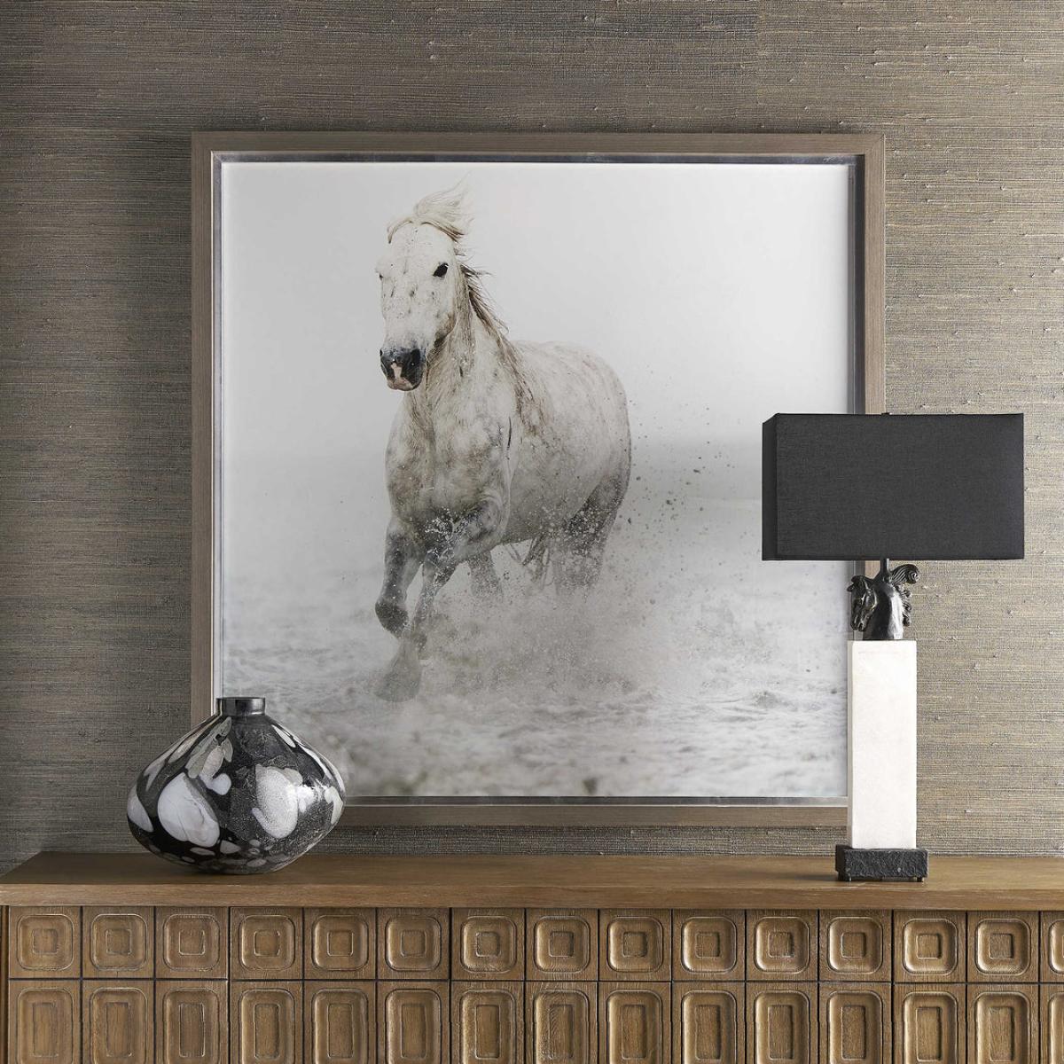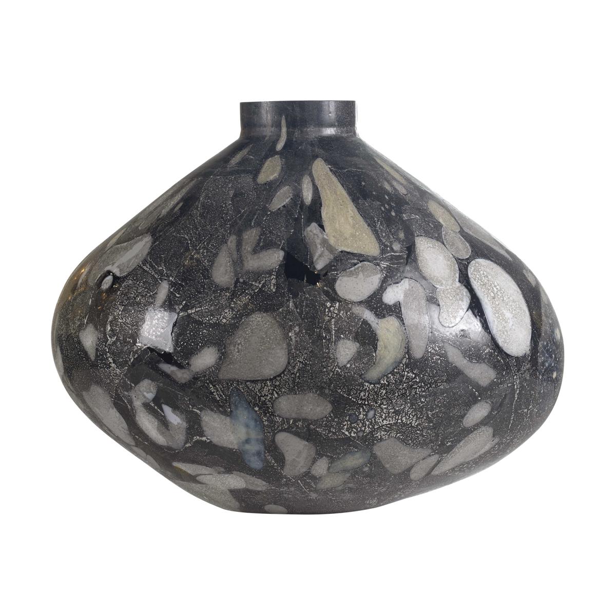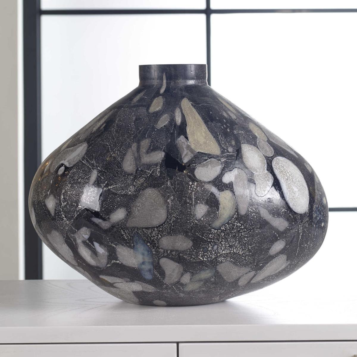 Hand blown art glass vase has an asymmetrical oblong shape that looks and feels similar to rustic 18th century folk pottery. Black glass is embedded with neutral medallions in shades of off white, beige, and gray. As glass is blown medallions all change shape and size making every piece unique. Black Label by Uttermost is an exclusive collection of premium upscale furniture, lighting and home accessories. Each item is designed by Uttermost's in-house team of skilled designers. Bringing you the latest in American style without compromise on quality. American design with a focus on upscale home luxury, relaxed design, generous proportions for a sophisticated luxury home. While Uttermost are focused on bringing you the most fashion-forward products in the industry, they know that good design means nothing without quality manufacturing. With this eye for detail from design to delivery you can be sure their products exceed expectations.
