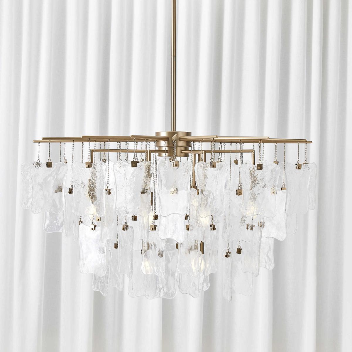 Hand-blown seeded glass shields hang in varying lengths and layers, creating an intriguing oval shape. Glass floats on delicate brass chains held in place by rich brass arms. Supplied with 20' wire, 3-12" stems and 1-6" stem for adjustable installation with 8-60 watt max candelabra sockets. Black Label by Uttermost is an exclusive collection of premium upscale furniture, lighting and home accessories. Each item is designed by Uttermost's in-house team of skilled designers. Bringing you the latest in American style without compromise on quality. American design with a focus on upscale home luxury, relaxed design, generous proportions for a sophisticated luxury home. While Uttermost are focused on bringing you the most fashion-forward products in the industry, they know that good design means nothing without quality manufacturing. With this eye for detail from design to delivery you can be sure their products exceed expectations.