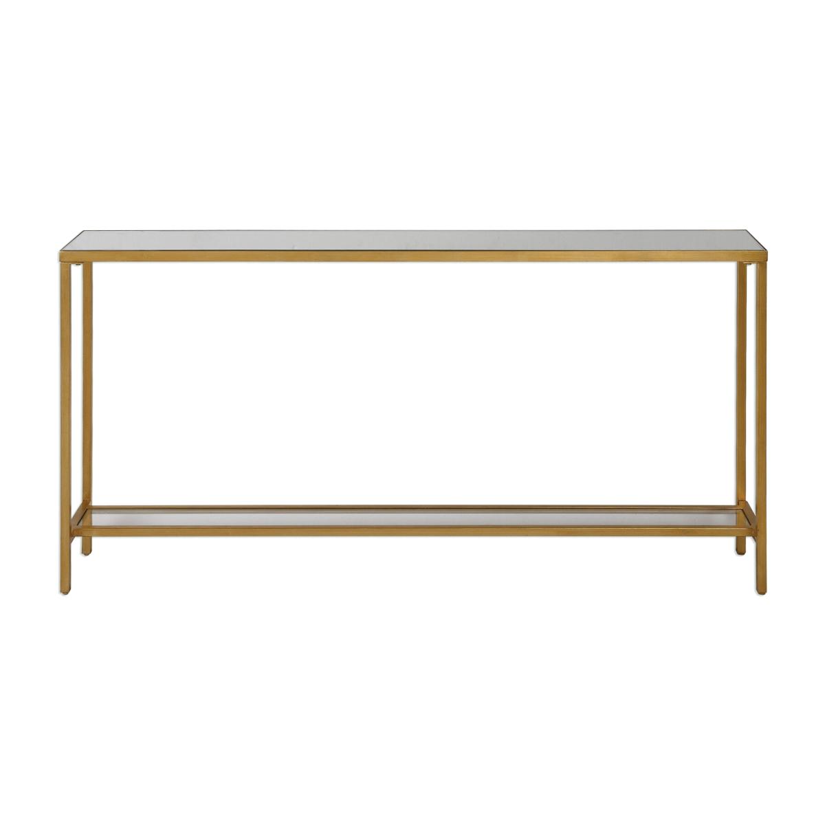 Classic and minimalistic, this narrow console table in iron is finished with lightly antiqued gold leaf, inset with a beveled mirrored top, and gallery shelf in clear glass. Uttermost is a US interior brand with an extensive range of furniture, lighting & accessories with an upscale luxury aesthetic. We have some of the of the most talented designers in the industry creating fresh and unique complimentary collections to beautify your home. While Uttermost are focused on bringing you the most fashion-forward products in the industry, they know that good design means nothing without quality manufacturing. With this eye for detail from design to delivery you can be sure their products exceed expectations.