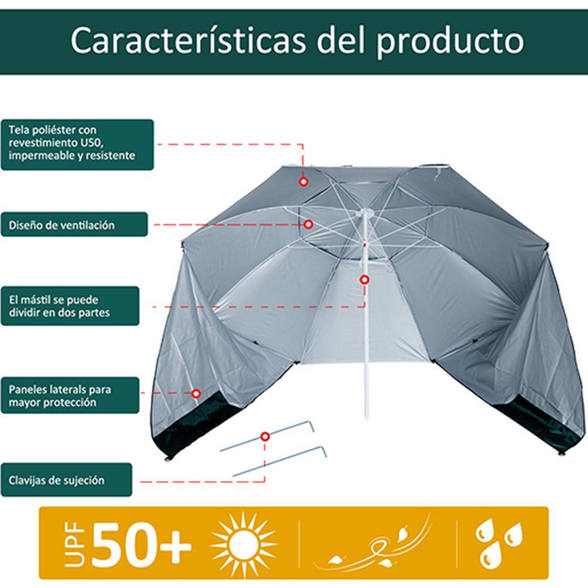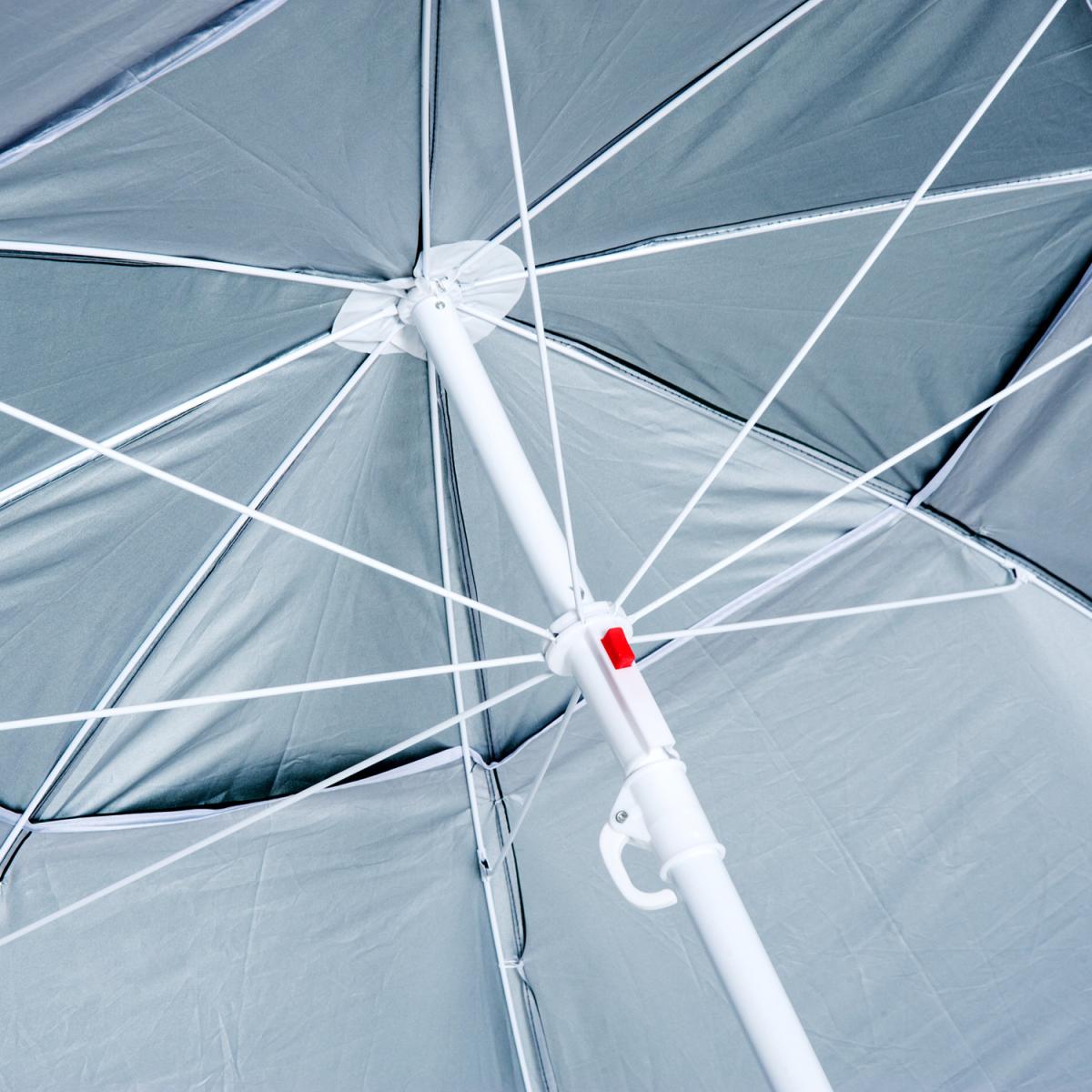 The Outsunny sun umbrella is an ideal accessory for optimum protection from UV rays while at the beach or even in your garden. The umbrella acts as an effective sunshade with a side covering to keep the wind and rain away. Includes ground nails, hooks and PVC carry care for easy transportation. The inner silver coating to the polyester fabric offers UPF-50 level protection. Height adjustable with telescope pole design makes this umbrella an ideal choice.