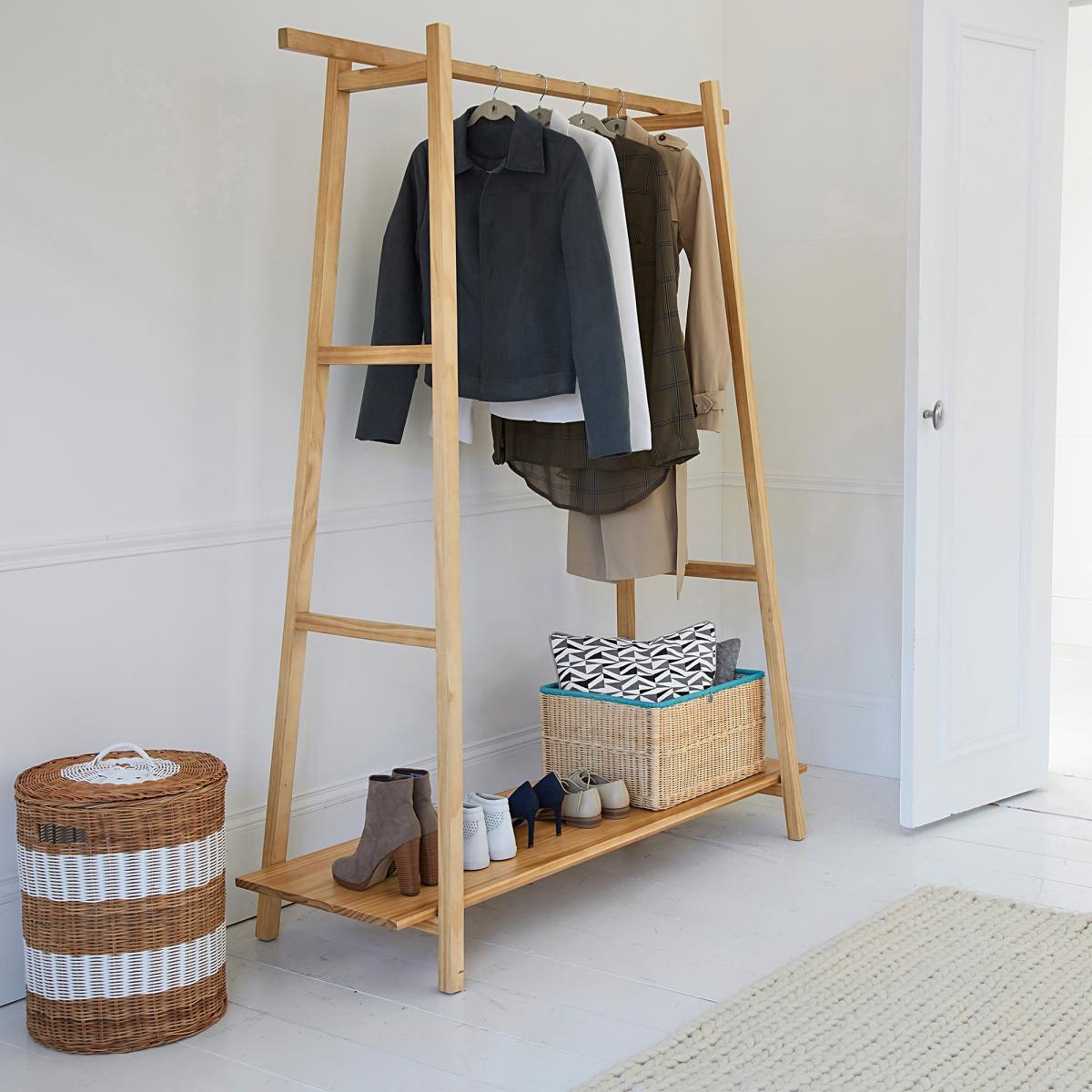 A sleek and understated design, made entirely of solid pine and featuring a practical shelf for shoes or storage boxes: This clothes rack is unbeatable!